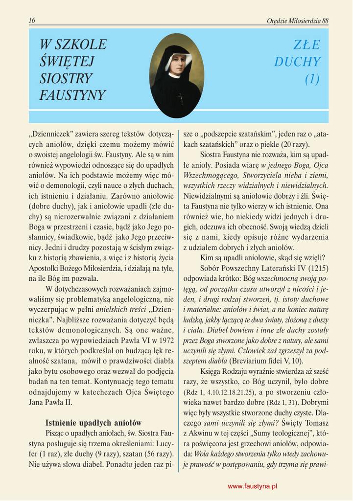 16 Orędzie Miłosierdzia 88 W SZKOLE ŚWIĘTEJ SIOSTRY FAUSTYNY „Dzienniczek” zawiera szereg tekstów dotyczących aniołów, dzięki czemu możemy mówić o swoistej angelologii św. Faustyny. Ale są w nim również wypowiedzi odnoszące się do upadłych aniołów. Na ich podstawie możemy więc mówić o demonologii, czyli nauce o złych duchach, ich istnieniu i działaniu. Zarówno aniołowie (dobre duchy), jak i aniołowie upadli (złe duchy) są nierozerwalnie związani z działaniem Boga w przestrzeni i czasie, bądź jako Jego posłannicy, świadkowie, bądź jako Jego przeciwnicy. Jedni i drudzy pozostają w ścisłym związku z historią zbawienia, a więc i z historią życia Apostołki Bożego Miłosierdzia, i działają na tyle, na ile Bóg im pozwala. W dotychczasowych rozważaniach zajmowaliśmy się problematyką angelologiczną, nie wyczerpując w pełni anielskich treści „Dzienniczka”. Najbliższe rozważania dotyczyć będą tekstów demonologicznych. Są one ważne, zwłaszcza po wypowiedziach Pawła VI w 1972 roku, w których podkreślał on budzącą lęk realność szatana, mówił o prawdziwości diabła jako bytu osobowego oraz wezwał do podjęcia badań na ten temat. Kontynuację tego tematu odnajdujemy w katechezach Ojca Świętego Jana Pawła II. Istnienie upadłych aniołów Pisząc o upadłych aniołach, św. Siostra Faustyna posługuje się trzema określeniami: Lucyfer (1 raz), złe duchy (9 razy), szatan (56 razy). Nie używa słowa diabeł. Ponadto jeden raz pi- ZŁE DUCHY (1) sze o „podszepcie szatańskim”, jeden raz o „atakach szatańskich” oraz o piekle (20 razy). Siostra Faustyna nie rozważa, kim są upadłe anioły. Posiada wiarę w jednego Boga, Ojca Wszechmogącego, Stworzyciela nieba i ziemi, wszystkich rzeczy widzialnych i niewidzialnych. Niewidzialnymi są aniołowie dobrzy i źli. Święta Faustyna nie tylko wierzy w ich istnienie. Ona również wie, bo niekiedy widzi jednych i drugich, odczuwa ich obecność. Swoją wiedzą dzieli się z nami, kiedy opisuje różne wydarzenia z udziałem dobrych i złych aniołów. Kim są upadli aniołowie, skąd się wzięli? Sobór Powszechny Laterański IV (1215) odpowiada krótko: Bóg wszechmocną swoją potęgą, od początku czasu utworzył z nicości i jeden, i drugi rodzaj stworzeń, tj. istoty duchowe i materialne: aniołów i świat, a na koniec naturę ludzką, jakby łączącą te dwa światy, złożoną z duszy i ciała. Diabeł bowiem i inne złe duchy zostały przez Boga stworzone jako dobre z natury, ale sami uczynili się złymi. Człowiek zaś zgrzeszył za podszeptem diabła (Breviarium fidei V, 10). Księga Rodzaju wyraźnie stwierdza aż sześć razy, że wszystko, co Bóg uczynił, było dobre (Rdz 1, 4.10.12.18.21.25), a po stworzeniu człowieka nawet bardzo dobre (Rdz 1, 31). Dobrymi więc były wszystkie stworzone duchy czyste. Dlaczego sami uczynili się złymi? Święty Tomasz z Akwinu w tej części „Sumy teologicznej”, która poświęcona jest grzechowi aniołów, odpowiada: Wola każdego stworzenia tylko wtedy zachowuje prawość w postępowaniu, gdy trzyma się prawiwww.faustyna.pl październik, listopad, grudzień 2013 deł woli Bożej, której przedmiotem jest cel ostateczny. Tymczasem anioł swoją wolą zwrócił się do własnego dobra, a pominął prawidło ustalone przez wolę Bożą (ST I, z. 63, a. 1). Bóg nie chciał swoim istotom rozumnym odbierać wolnej woli, ale ta wola została źle wykorzystana, wbrew woli Boga. Święty Tomasz wyjaśnia, że nie poddanie się zwierzchnictwu w tym, w czym należy się poddać, jest grzechem pychy. I podkreśla, że pierwszym grzechem anioła mogła być tylko pycha. W jej następstwie mogła wystąpić u niego także zazdrość (…) z powodu dobra cudzego, uznanego za przeszkodę w osiągnięciu jakiegoś dobra pożądanego. (…) Tak więc diabeł smucił się, zazdroszcząc człowiekowi jego dobra (wiecznej szczęśliwości), a także samemu Bogu Jego wzniosłości, którą Bóg się posługuje dla swej chwały wbrew woli czarta (ST I, z. 63, a. 2). Fakt upadku aniołów obecny jest w różnych świadectwach Nowego Testamentu. Przede wszystkim sam Jezus mówi, że diabeł był zabójcą od początku i nie wytrwał w prawdzie, gdyż nie ma w nim prawdy (J 8,44). Według znawców Ewangelii Janowej posiadanie prawdy i odpadnięcie od niej oznacza życie w Bogu i odejście od Niego. Podobnie stwierdza św. Piotr pisząc, że Bóg aniołom, którzy zgrzeszyli, nie odpuścił, ale wydał ich do ciemnych lochów Tartaru, aby byli zachowani na sąd (2 P 2, 4). Święty Juda zauważa, że Bóg aniołów, tych, którzy nie zachowali swojej godności, ale opuścili własne mieszkanie, spętanych wiekuistymi więzami zatrzymał w ciemnościach na sąd wielkiego dnia (Jud 6). Czy nie powinno nas zastanawiać to, że aniołowie obdarzeni rozumem, przewyższającym najwybitniejszy umysł ludzki i udostępniający im najwyższy stopień poznania Boga i Jego woli, sprzeciwili się? Dlaczego to uczynili? Co nimi kierowało? Jakie były tego konsekwencje dla św. Faustyny, jakie mogą być dla nas? Wiele światła daje katecheza bł. Jana Pawła II: Ojcowie Kościoła i teologowie mówią bez wahania o „zaślepieniu” doskonałością własnego bytu, które przesłoniło całkowicie wyższość Boga, wymagającą prze- 17 cież aktu posłusznego oddania. W zwięzły sposób zdają się to oddawać słowa: „Nie będę służyć!” (Jr 2, 20), które mówią o radykalnej i nieodwracalnej odmowie uczestnictwa w kształtowaniu królestwa Boga w stworzonym wszechświecie. „Szatan”, duch zbuntowany, chce mieć własne królestwo, które nie jest królestwem Bożym i mianuje się pierwszym przeciwnikiem Stwórcy, przeciwnikiem Opatrzności, antagonistą Mądrości miłującej Boga. Własna doskonałość zaślepiła znaczną część aniołów i odwróciła od prawdziwego celu ostatecznego życia, tzn. Boga. Zwróc