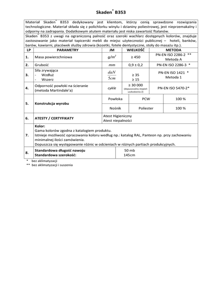 Skaden® B353 Materiał Skaden® B353 dedykowany jest klientom, którzy cenią sprawdzone rozwiązania technologiczne. Materiał składa się z polichlorku winylu i dzianiny poliestrowej, jest nieprzemakalny i odporny na zadrapania. Dodatkowym atutem materiału jest niska zawartość ftalanów. Skaden® B353 z uwagi na ograniczoną palność oraz szeroki wachlarz dostępnych kolorów, znajduje zastosowanie jako materiał tapicerski mebli do miejsc użyteczności publicznej – hoteli, banków, barów, kawiarni, placówek służby zdrowia (kozetki, fotele dentystyczne, stoły do masażu itp.). LP PARAMETRY JM WIELKOŚĆ METODA PN-EN ISO 2286-2 ** 1. Masa powierzchniowa g/m2 ≥ 450 Metoda A 2. Grubość mm 0,9 ± 0,2 PN-EN ISO 2286-3 * Siła zrywająca daN PN-EN ISO 1421 * 3. - Wzdłuż ≥ 35 Metoda 1 5cm - Wszerz ≥ 15 ≥ 30 000 Odporność powłoki na ścieranie 4. cykle PN-EN ISO 5470-2* (dopuszczalny stopień (metoda Martindale’a) uszkodzenia 2) 5. Powłoka PCW 100 % Nośnik Poliester 100 % Konstrukcja wyrobu Atest Higieniczny Atest niepalności 6. ATESTY / CERTYFIKATY 7. Kolor: Gama kolorów zgodna z katalogiem produktu. Istnieje możliwość opracowania koloru według np.: katalog RAL, Panteon np. przy zachowaniu minimalnej ilości zamówienia. Dopuszcza się występowanie różnic w odcieniach w różnych partiach produkcyjnych. 8. Standardowa długość nawoju Standardowa szerokość: * bez aklimatyzacji ** bez aklimatyzacji i suszenia 50 mb 145 cm Przepis konserwacji materiału B353 Codzienne zabrudzenia Miejscowe, silniejsze zabrudzenia Środki dozwolone !!! Łagodny detergent czyścić regularnie z najlepiej roztwór użyciem gąbki lub szarego mydła miękkiej szczotki delikatnie przecierać nasączonym tamponem z gazy 25% roztwór alkoholu etylowego na koniec przetrzeć czyszczone miejsce wilgotną szmatką po czym wytrzeć do sucha (w celu usunięcia pozostałości detergentu) dezynfekować zgodnie z zaleceniami Dezynfekcja producenta używanego środka Przed użyciem środka innego niż łagodny detergent trzeba sprawdzić efekt w niewidocznym miejscu, a samo czyszczenie wykonać bardzo ostrożnie. Ogólnodostępne środki do dezynfekcji Informacja Szamponować przy użyciu gąbki Nie prać!!! (delikatne wyroby) Nie chlorować!!! (nie stosować do bielenia związków wydzielających wolny chlor) Nie prasować!!! (nie dopuszczać do kontaktu z nagrzanymi powierzchniami np. kaloryfer) Nie czyścić chemicznie!!! Nie stosować !!! Wosków Użycie wymienionych Sprayów środków może spowodować Silnych detergentów usztywnienie i pękanie Środków zawierających materiału, a także zmianę rozpuszczalniki koloru i połysku powierzchni Środków do czyszczenia skóry wyrobu naturalnej Producent nie poleca stosowania środków do czyszczenia skór ekologicznych (sztucznej skóry)