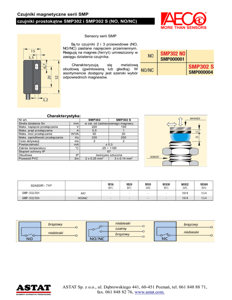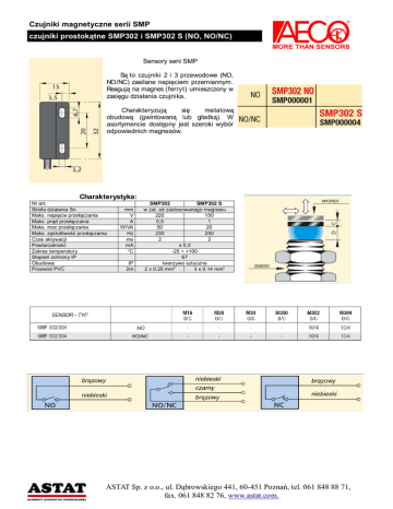 Czujniki magnetyczne serii SMP czujniki prostokątne SMP302 i SMP302 S (NO, NO/NC) Sensory serii SMP Są to czujniki 2 i 3 przewodowe (NO, NO/NC) zasilane napięciem przemiennym. Reagują na magnes (ferryt) umieszczony w zasięgu działania czujnika. Charakteryzują się metalową obudową (gwintowaną lub gładką). W asortymencie dostępny jest szeroki wybór odpowiednich magnesów. Charakterystyka: Nr art. Strefa działania Sn Maks. napięcie przełączania Maks. prąd przełączania Maks. moc przełączania Maks. zęstotliwość przełączania Czas aktywacji Powtarzalność Zakres temperatury Stopień ochrony IP Obudowa Przewód PVC mm V A W/VA Hz ms mA °C IP 2m SMP302 SMP302 S w zal. od zastosowanego magnesu 220 150 0,5 1 50 20 230 250 2 2 ± 0,3 -25 ÷ +100 67 tworzywo sztuczne 2 x 0.25 mm2 3 x 0.14 mm2 ASTAT Sp. z o.o., ul. Dąbrowskiego 441, 60-451 Poznań, tel. 061 848 88 71, fax. 061 848 82 76, www.astat.com. Czujniki magnetyczne serii SMP czujniki prostokątne SMP304 i SMP304 S (NO, NO/NC) Sensory serii SMP Są to czujniki 2 i 3 przewodowe (NO, NO/NC) zasilane napięciem przemiennym. Reagują na magnes (ferryt) umieszczony w zasięgu działania czujnika. Charakteryzują się metalową obudową (gwintowaną lub gładką). W asortymencie dostępny jest szeroki wybór odpowiednich magnesów. Charakterystyka: Nr art. Strefa działania Sn Maks. napięcie przełączania Maks. prąd przełączania Maks. moc przełączania Maks. zęstotliwość przełączania Czas aktywacji Powtarzalność Zakres temperatury Stopień ochrony IP Obudowa Przewód PVC mm V A W/VA Hz ms mA °C IP 2m SMP304 SMP304 S w zal. od zastosowanego magnesu 220 150 0,5 1 50 20 230 250 2 2 ± 0,3 -25 ÷ +100 67 aluminium anodyzowane 2 x 0.25 mm2 3 x 0.14 mm2 ASTAT Sp. z o.o., ul. Dąbrowskiego 441, 60-451 Poznań, tel. 061 848 88 71, fax. 061 848 82 76, www.astat.com.
