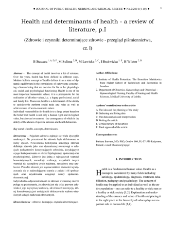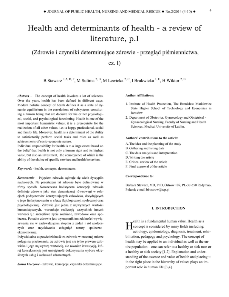 PUBLIC HEALTH, NURSING AND MEDICAL RESCUE ●JOURNAL JOURNAL OF PUBLIC HEALTH, NURSING AND MEDICAL RESCUE ●No.2/2014 2/2014 (4-10) ●● ● ●● JOURNAL OFOF PUBLIC HEALTH, NURSING AND MEDICAL RESCUE ●● No.2/2014 4 Health and determinants of health - a review of literature, p.I (Zdrowie i czynniki determinujące zdrowie - przegląd piśmiennictwa, cz. I) B Stawarz 1,A, D, F, M Sulima 2, B, M Lewicka 2, C, I Brukwicka 1, E, H Wiktor 2, B Abstract – The concept of health involves a lot of sciences. Over the years, health has been defined in different ways. Modern holistic concept of health defines it as a state of dynamic equilibrium in the correlations of subsystems constituting a human being that are decisive for his or her physiological, social, and psychological functioning. Health is one of the most important humanistic values; it is a prerequisite for the realization of all other values, i.e.: a happy professional, social and family life. Moreover, health is a determinant of the ability to satisfactorily perform social tasks and roles as well as achievements of socio-economic nature. Individual responsibility for health is to a large extent based on the belief that health is not only a human right and its highest value, but also an investment, the consequence of which is the ability of the choice of specific services and health behaviors. Key words - health, concepts, determinants. Streszczenie – Pojęciem zdrowia zajmuje się wiele dyscyplin naukowych. Na przestrzeni lat zdrowie było definiowane w różny sposób. Nowoczesna holistyczna koncepcja zdrowia definiuje zdrowie jako stan dynamicznej równowagi w relacjach podsystemów konstytuujących człowieka, decydujących o jego funkcjonowaniu w sferze fizjologicznej, społecznej oraz psychologicznej. Zdrowie jest jedną z najwyższych wartości humanistycznych, warunkuje realizację wszystkich innych wartości tj.: szczęśliwe życie rodzinne, zawodowe oraz społeczne. Ponadto zdrowie jest wyznacznikiem zdolności wywiązywania się w zadawalającym stopniu z zadań i ról społecznych oraz uzyskiwania osiągnięć natury społecznoekonomicznej. Indywidualna odpowiedzialność za zdrowie w znacznej mierze polega na przekonaniu, że zdrowie jest nie tylko prawem człowieka i jego najwyższą wartością, ale również inwestycją, której konsekwencją jest umiejętność dokonywania wyboru określonych usług i zachowań zdrowotnych. Słowa kluczowe - zdrowie, koncepcje, czynniki determinujące. Author Affiliations: 1. Institute of Health Protection, The Bronisław Markiewicz State Higher School of Technology and Economics in Jarosław 2. Department of Obstetrics, Gynaecology and Obstetrical Gynaecological Nursing, Faculty of Nursing and Health Sciences, Medical University of Lublin. Authors’ contributions to the article: A. The idea and the planning of the study B. Gathering and listing data C. The data analysis and interpretation D. Writing the article E. Critical review of the article F. Final approval of the article Correspondence to: Barbara Stawarz, MD, PhD, Ostrów 109, PL-37-550 Radymno, Poland; e-mail [email protected] I. INTRODUCTION ealth is a fundamental human value. Health as a concept is considered by many fields including: aetiology, epidemiology, diagnosis, treatment, rehabilitation, pedagogy and psychology. The concept of health may be applied to an individual as well as the entire population – one can refer to a healthy or sick man or a healthy or sick society [1,2]. Explanation and understanding of the essence and value of health and placing it in the right place in the hierarchy of values plays an important role in human life [3,4]. H ● ●JOURNAL OFOF PUBLIC HEALTH, NURSING AND MEDICAL RESCUE ● ●No.2/2014 JOURNAL PUBLIC HEALTH, NURSING AND MEDICAL RESCUE 2/2014 ● ● The development of medicine in the last two decades has contributed to the development of new diagnostic and therapeutic opportunities and allowed to devote more attention to new scientific fields such as health education, health promotion or public health. More and more authors advocate the concept of health which would include complete and complementary definition of health in the form of a paradigm [5]. II. CHARACTERISTICS OF DIFFERENT MODELS AND CONCEPTS OF HEALTH In medicine and the social sciences, there are two paradigms that define the concept of health. The first is the pathogenic paradigm, which focuses on identifying the causes of a disease (considered a condition opposite to health). This approach classifies people as healthy or sick (health understood as dependent only on the individual resistance of biological and genetic endowment remains beyond the control of the body, and so does disease) [6]. Pathogenetic approach is evident in the biomedical model of health, expressing the specificity of the era of restorative medicine [6,7,8]. Defining health and its interpretation is based on the Newtonian-Cartesian paradigm, thanks to which precise understanding of health as separate and independent components in the field of somatic, mental and social health is possible [9,10]. According to the biomedical model, the concepts of health and illness are considered primarily in the field of biology. An important role in this model is played by aetiology, pathogenesis of diseases, focusing on the diagnosis of diseases and the improvement of methods of treatment. Health is understood as the absence of disease - a condition in which it does not occur among human empirical symptoms, while all morphological, biochemical, and physiological parameters are within normal limits. While a person’s condition is determined by a doctor, subjective health criteria are of only marginal significance [10,11,12,13,14,15]. A complementation to the above paradigm of traditional medicine is salute-genetic health paradigm introduced by A. Antonovsky, which defines the concept of health, aims to detect the factors contributing to its conserv