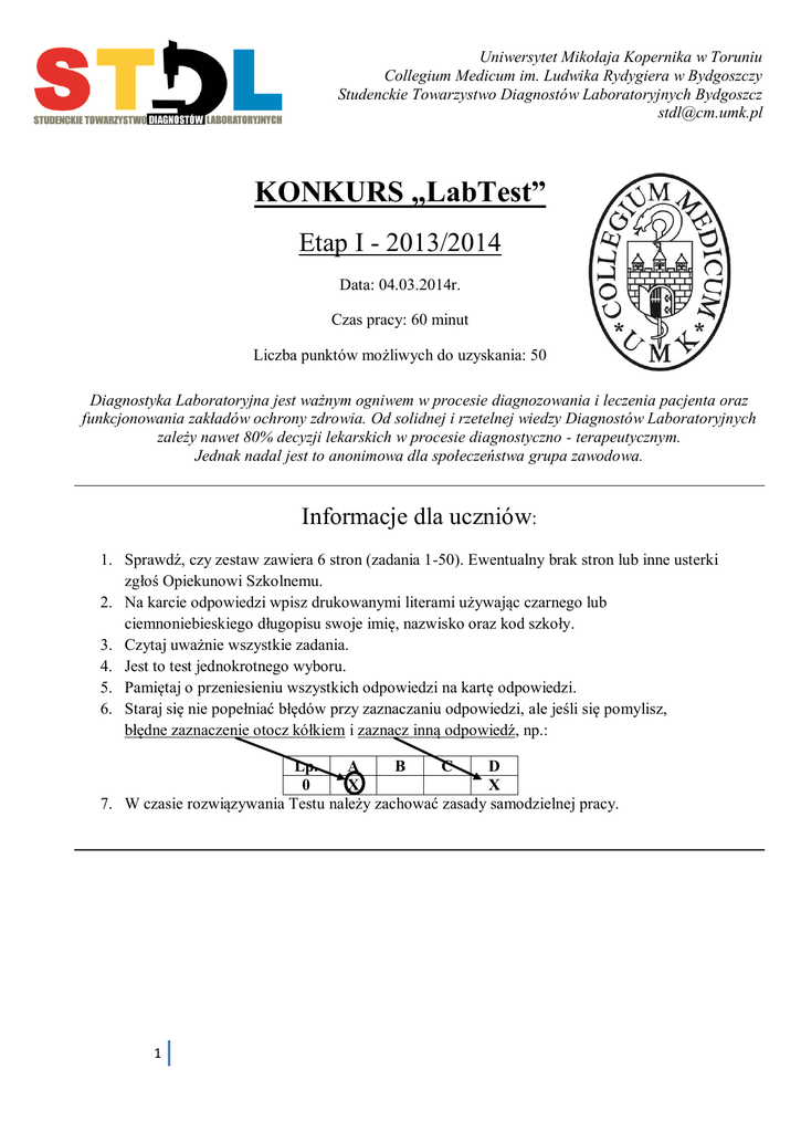 Uniwersytet Mikołaja Kopernika w Toruniu Collegium Medicum im. Ludwika Rydygiera w Bydgoszczy Studenckie Towarzystwo Diagnostów Laboratoryjnych Bydgoszcz [email protected] KONKURS „LabTest” Etap I - 2013/2014 Data: 04.03.2014r. Czas pracy: 60 minut Liczba punktów możliwych do uzyskania: 50 Diagnostyka Laboratoryjna jest ważnym ogniwem w procesie diagnozowania i leczenia pacjenta oraz funkcjonowania zakładów ochrony zdrowia. Od solidnej i rzetelnej wiedzy Diagnostów Laboratoryjnych zależy nawet 80% decyzji lekarskich w procesie diagnostyczno - terapeutycznym. Jednak nadal jest to anonimowa dla społeczeństwa grupa zawodowa. Informacje dla uczniów: 1. Sprawdź, czy zestaw zawiera 6 stron (zadania 1-50). Ewentualny brak stron lub inne usterki zgłoś Opiekunowi Szkolnemu. 2. Na karcie odpowiedzi wpisz drukowanymi literami używając czarnego lub ciemnoniebieskiego długopisu swoje imię, nazwisko oraz kod szkoły. 3. Czytaj uważnie wszystkie zadania. 4. Jest to test jednokrotnego wyboru. 5. Pamiętaj o przeniesieniu wszystkich odpowiedzi na kartę odpowiedzi. 6. Staraj się nie popełniać błędów przy zaznaczaniu odpowiedzi, ale jeśli się pomylisz, błędne zaznaczenie otocz kółkiem i zaznacz inną odpowiedź, np.: Lp. A B C D 0 X X 7. W czasie rozwiązywania Testu należy zachować zasady samodzielnej pracy. 1 Uniwersytet Mikołaja Kopernika w Toruniu Collegium Medicum im. Ludwika Rydygiera w Bydgoszczy Studenckie Towarzystwo Diagnostów Laboratoryjnych Bydgoszcz [email protected] 1. Tasiemiec charakteryzujący się dużym zapotrzebowaniem na witaminę B12, której niedobory w organizmie ludzkim mogą się objawiać anemią to: a) bruzdogłowiec szeroki b) tasiemiec uzbrojony c) tasiemiec nieuzbrojony d) tasiemiec bąblowiec 2. Podstawowy obiekt badań Tomasza Morgana stanowiła muszka owocowa – Drosophila melanogaster. Posiada ona: a) 2 pary chromosomów b) 4 pary chromosomów c) 8 par chromosomów d) 16 par chromosomów 3. Plazmidy decydują często o żywotności komórki bakteryjnej, ponieważ: a) mogą zawierać informację warunkującą oporność bakterii na antybiotyki b) zabezpieczają jądro komórkowe przed zniszczeniem c) ułatwiają koniugację komórkom bakteryjnym d) zapobiegają wnikaniu wirusa do komórki bakteryjnej 4. Do cech, których dziedziczenie zależy od wielu genów zaliczamy: a) zdolność zwijania języka w trąbkę b) grupę krwi w układzie AB0 c) wzrost d) włosy proste lub kręcone 5. Telomeraza wydłuża telomerowy DNA, który u ludzi zawiera powtarzalną sekwencję: a) 5'-TTGGGA-3' b) 5'-GGGATT-3' c) 3'-GGGATT-5' d) brak poprawnej odpowiedzi 6. Pasożytem poliksenicznym, którego cykl rozwojowy odbywa się w ciele jednego żywiciela jest: a) włosień kręty b) glista ludzka c) owsik ludzki d) filaria Bancrofta 7. Prawidłową kolejność postaci rozwojowych zarodźca malarii, które tworzą się w ciele żywiciela ostatecznego zawiera odpowiedź: a) gametocyty (pobrane z krwią) - gamety - ookineta - oocysta - sporozoity b) sporozoity - gamety - ookineta - oocysta c) sporozoity - schizonty - merozoity - schizonty - merozoity - gametocyty d) gametocyty (pobrane z krwią) - gamety - oocysta - merozoity - sporozoity 8. Wrażliwość na smak fenylotiomocznika jest cechą dziedziczoną autosomalnie dominująco. W danej populacji 42 osoby na 50 są wrażliwe na smak fenylotiomocznika. Oznacza to, że w tej populacji heterozygoty stanowią: a) 42% b) 48% c) 82% d) 84% 9. Przykładem mutacji genomu mitochondrialnego u człowieka są m.in: a) choroby neurodegeneracyjne, jak np. choroba Huntingtona b) zanik nerwu wzrokowego czy też niektóre choroby mięśni c) zaburzenia syntezy czynników krzepnięcia krwi d) niektóre nowotwory np. przewlekła białaczka szpikowa 10. "Gnatosoma" i "idiosoma" to pojęcia wykorzystywane w określaniu budowy morfologicznej wyłącznie u: a) kleszczy b) owadów c) roztoczy d) pajęczaków 2 Uniwersytet Mikołaja Kopernika w Toruniu Collegium Medicum im. Ludwika Rydygiera w Bydgoszczy Studenckie Towarzystwo Diagnostów Laboratoryjnych Bydgoszcz [email protected] 11. Niżej przedstawiony schemat obrazuje dziedziczenie choroby w sposób: a) autosomalny recesywny b) autosomalny dominujący c) recesywny, sprzężony z chromosomem X d) dominujący, sprzężony z chromosomem X 12. Podano częstości rekombinacji między genami: między m i v = 3% między m i y = 33,7% między v i w = 29,4% między w i y = 1,3% Wybierz odpowiedź, która przedstawia prawidłową kolejność tych genów na chromosomie: a) y, v, w, m b) m, w, y, v c) y, m, v, w d) brak poprawnej odpowiedzi 13. Cykl życiowy zarodźca malarii jest bardzo skomplikowany. Wraz z ukłuciem komara do ciała człowieka wprowadzane są formy inwazyjne, które: a) dostają się do komórek wątroby i węzłów chłonnych, a następnie atakują krwinki czerwone b) wraz z krwią wędrują do ośrodkowego układu nerwowego i wywołują charakterystyczne objawy c) dostają się do wątroby i pozostają w niej uśpione aż do momentu osłabienia odporności organizmu, po czym atakują ponownie komórki wątroby d) wytwarzają gamety i namnażają się atakując coraz to większą liczbę erytrocytów 14. Osiedlanie się jednego organizmu wewnątrz ciała innego organizmu to tzw.: a) endoikia b) amensalizm c) eksploatacja d) symfilia 15. Częstość zarażeń nicieniami w Polsce, w kolejności od najczęściej do najrzadziej występującego prawidłowo przedstawiono w punkcie: a) Ascaris lumbricoides, Enterobius vermicularis, Schistosoma sp. b) Echinococcus granulosus, Trichuris trichiura, Loa loa c) Trichuris trichiura, Wuchereria bancrofti, Ascaris lumbricoides d) Enterobius vermicularis, Trichuris trichiura, Ascaris lumbricoides 16. Dzięki procesowi zwijania i kondensacji nić DNA w chromosomach metafazowych jest: a) około 1 000 razy skrócona b) około 10 000 razy skrócona c) około 100 000 razy skrócona d) brak poprawnej odpowiedzi 17. Których komórek je