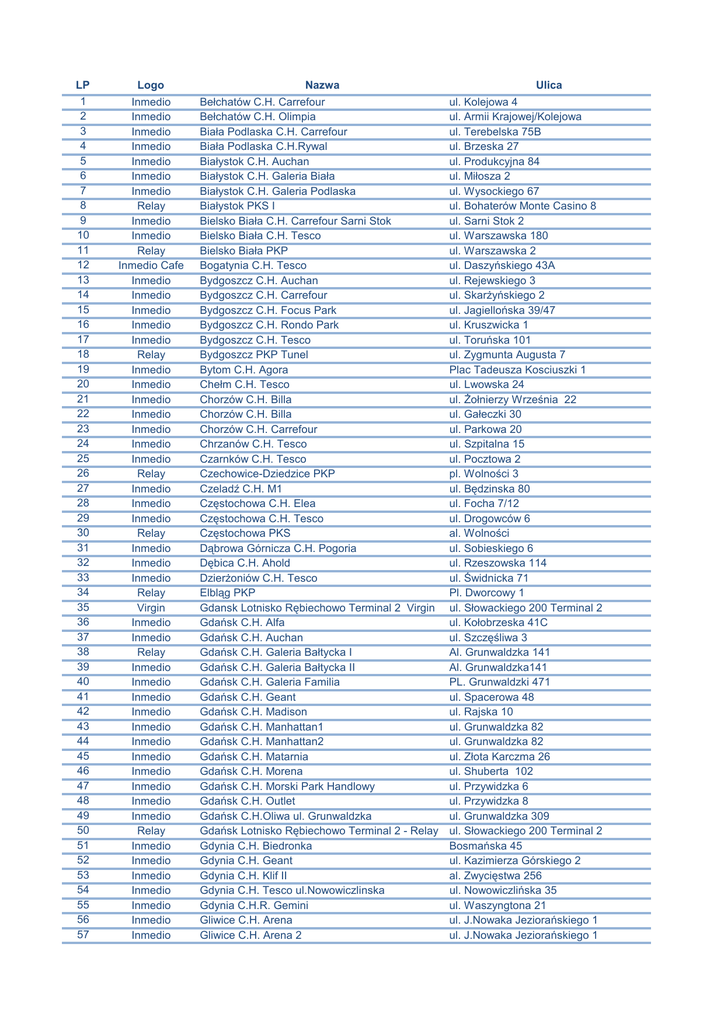 LP Logo 1 2 3 4 5 6 7 8 9 10 11 12 13 14 15 16 17 18 19 20 21 22 23 24 25 26 27 28 29 30 31 32 33 34 35 36 37 38 39 40 41 42 43 44 45 46 47 48 49 50 51 52 53 54 55 56 57 Inmedio Inmedio Inmedio Inmedio Inmedio Inmedio Inmedio Relay Inmedio Inmedio Relay Inmedio Cafe Inmedio Inmedio Inmedio Inmedio Inmedio Relay Inmedio Inmedio Inmedio Inmedio Inmedio Inmedio Inmedio Relay Inmedio Inmedio Inmedio Relay Inmedio Inmedio Inmedio Relay Virgin Inmedio Inmedio Relay Inmedio Inmedio Inmedio Inmedio Inmedio Inmedio Inmedio Inmedio Inmedio Inmedio Inmedio Relay Inmedio Inmedio Inmedio Inmedio Inmedio Inmedio Inmedio Nazwa Bełchatów C.H. Carrefour Bełchatów C.H. Olimpia Biała Podlaska C.H. Carrefour Biała Podlaska C.H.Rywal Białystok C.H. Auchan Białystok C.H. Galeria Biała Białystok C.H. Galeria Podlaska Białystok PKS I Bielsko Biała C.H. Carrefour Sarni Stok Bielsko Biała C.H. Tesco Bielsko Biała PKP Bogatynia C.H. Tesco Bydgoszcz C.H. Auchan Bydgoszcz C.H. Carrefour Bydgoszcz C.H. Focus Park Bydgoszcz C.H. Rondo Park Bydgoszcz C.H. Tesco Bydgoszcz PKP Tunel Bytom C.H. Agora Chełm C.H. Tesco Chorzów C.H. Billa Chorzów C.H. Billa Chorzów C.H. Carrefour Chrzanów C.H. Tesco Czarnków C.H. Tesco Czechowice-Dziedzice PKP Czeladź C.H. M1 Częstochowa C.H. Elea Częstochowa C.H. Tesco Częstochowa PKS Dąbrowa Górnicza C.H. Pogoria Dębica C.H. Ahold Dzierżoniów C.H. Tesco Elbląg PKP Gdansk Lotnisko Rębiechowo Terminal 2 Virgin Gdańsk C.H. Alfa Gdańsk C.H. Auchan Gdańsk C.H. Galeria Bałtycka I Gdańsk C.H. Galeria Bałtycka II Gdańsk C.H. Galeria Familia Gdańsk C.H. Geant Gdańsk C.H. Madison Gdańsk C.H. Manhattan1 Gdańsk C.H. Manhattan2 Gdańsk C.H. Matarnia Gdańsk C.H. Morena Gdańsk C.H. Morski Park Handlowy Gdańsk C.H. Outlet Gdańsk C.H.Oliwa ul. Grunwaldzka Gdańsk Lotnisko Rębiechowo Terminal 2 - Relay Gdynia C.H. Biedronka Gdynia C.H. Geant Gdynia C.H. Klif II Gdynia C.H. Tesco ul.Nowowiczlinska Gdynia C.H.R. Gemini Gliwice C.H. Arena Gliwice C.H. Arena 2 Ulica ul. Kolejowa 4 ul. Armii Krajowej/Kolejowa ul. Terebelska 75B ul. Brzeska 27 ul. Produkcyjna 84 ul. Miłosza 2 ul. Wysockiego 67 ul. Bohaterów Monte Casino 8 ul. Sarni Stok 2 ul. Warszawska 180 ul. Warszawska 2 ul. Daszyńskiego 43A ul. Rejewskiego 3 ul. Skarżyńskiego 2 ul. Jagiellońska 39/47 ul. Kruszwicka 1 ul. Toruńska 101 ul. Zygmunta Augusta 7 Plac Tadeusza Kosciuszki 1 ul. Lwowska 24 ul. Żołnierzy Września 22 ul. Gałeczki 30 ul. Parkowa 20 ul. Szpitalna 15 ul. Pocztowa 2 pl. Wolności 3 ul. Będzinska 80 ul. Focha 7/12 ul. Drogowców 6 al. Wolności ul. Sobieskiego 6 ul. Rzeszowska 114 ul. Świdnicka 71 Pl. Dworcowy 1 ul. Słowackiego 200 Terminal 2 ul. Kołobrzeska 41C ul. Szczęśliwa 3 Al. Grunwaldzka 141 Al. Grunwaldzka141 PL. Grunwaldzki 471 ul. Spacerowa 48 ul. Rajska 10 ul. Grunwaldzka 82 ul. Grunwaldzka 82 ul. Złota Karczma 26 ul. Shuberta 102 ul. Przywidzka 6 ul. Przywidzka 8 ul. Grunwaldzka 309 ul. Słowackiego 200 Terminal 2 Bosmańska 45 ul. Kazimierza Górskiego 2 al. Zwycięstwa 256 ul. Nowowiczlińska 35 ul. Waszyngtona 21 ul. J.Nowaka Jeziorańskiego 1 ul. J.Nowaka Jeziorańskiego 1 58 59 60 61 62 63 64 65 66 67 68 69 70 71 72 73 74 75 76 77 78 79 80 81 82 83 84 85 86 87 88 89 90 91 92 93 94 95 96 97 98 99 100 101 102 103 104 105 106 107 108 109 110 111 112 113 114 115 116 Inmedio Inmedio Inmedio Inmedio Cafe Inmedio Inmedio Relay Inmedio Relay Inmedio Inmedio Inmedio Inmedio Inmedio Relay Inmedio Inmedio Inmedio Inmedio Inmedio Inmedio Inmedio Relay Relay Inmedio Inmedio Inmedio Inmedio Inmedio Inmedio Inmedio Inmedio Inmedio Inmedio Inmedio Inmedio Inmedio Relay Inmedio Cafe Inmedio Cafe Inmedio Inmedio Inmedio Inmedio Inmedio Inmedio Inmedio Cafe Relay Relay Relay Relay Inmedio Inmedio Inmedio Inmedio Inmedio Inmedio Inmedio Inmedio Cafe Gliwice C.H. Forum Gliwice C.H. MiniMall Gliwice C.H.Auchan ul.Rybnicka Gniezno C.H. Albert Gniezno C.H. Kaufland ul. Roosevelta Gorzów Wielkopolski C.H. Tesco Inowrocław PKP Janki C.H. Real Jarosław PKP Jastrzębie Zdrój C.H. Billa Jastrzębie Zdrój C.H. Carrefour Jaworzno C.H. Kaufland ul.Matejki Jelenia Góra C.H. Biedronka Jelenia Góra C.H. Tesco Jelenia Góra PKP Jelenia Góra Ul. Konopnickiej Kalisz C.H. Carrefour Kalisz C.H. Tesco Katowice Biurowiec Unicentrum Katowice C.H. Carrefour/Dąbrówka Katowice C.H. Geant Kędzierzyn Koźle C.H.Kaufland Kędzierzyn Koźle PKP Kielce PKS Kłodzko C.H. Twierdza Konin C.H. Ferio Konin C.H. Tesco Konstantynów Łódzki C.H. Kaufland Koszalin C.H.Forum Kościan C.H. Tesco ul. Śmigielska Kraków C.H. ALMA Kraków C.H. Bonarka lok.C1 parter Kraków C.H. Carrefour Czyżyny Kraków C.H. Carrefour Witosa Kraków C.H. Carrefour Zakopianka lok 14b Kraków C.H. Futura Park Kraków C.H. Galeria Krakowska Kraków C.H. Galeria Krakowska Kraków C.H. Galeria Solvay Kraków C.H. GTC Galeria Kazimierz Kraków C.H. Kaufland ul.Ćwiklinska Kraków C.H. Kaufland ul.Norymberska Kraków C.H. Kaufland ul.Okulickiego Kraków C.H. M1 Kraków C.H. Plaza Kraków C.H. Real Kraków C.H. Tesco Kraków Lotnisko Balice Kraków Lotnisko Balice - Krajowy po odprawach Kraków Lotnisko Balice - Relay Kraków Lotnisko Balice - Relay Schengen Krapkowice C.H. Kaufland Krasnystaw Galeria Handlowa Panorama Krosno C.H.Carrefour Ekspress Legnica C.H Auchan ul.Schumana Legnica C.H. Carrefour Piekary Legnica C.H. Ferio Legnica C.H. Galeria Piastów Legnica C.H. Real ul. Lipowa 1 ul. Tarnogórska 19 ul. Rybnicka 207 ul. Jana III Sobieskiego 17 ul. Roosevelta 46 ul. Słowiańska 70 ul. Dworcowa 155 ul. Mszczonowska 3 ul. Słowackiego 34 Al. Piłsudskiego 35 ul. Podhalańska ul. Jana Matejki 27 ul. Elsnera 1A al. Jana Pawła II 17 ul. 1 Maja 77 ul. Konopnickiej 4 ul. Poznańska 121-131 al. Wojska Polskiego 2 ul. Uniwersytecka 13 ul. Rozdzieńskiego 200 ul. Gen. Kazimierza Puławskiego 60 ul. Kozielska 36 ul. Dworcowa 1 ul. Czarnowska 22 ul. Noworudzka 2 ul. Ogrodowa 31A ul. Chopina 12 ul. Spółdzielcza 1 ul.Ignacego Padarewskie
