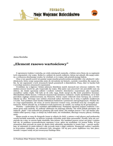 Anna Kociuba „Element rasowo wartościowy” Z ogromnym trudem i rozterką, po wielu miesiącach namysłu, z bólem serca biorę się za napisanie tych wspomnień z lat wojny. Robię to z miłości do moich rodziców, którzy już odeszli, dla mojej rodziny, a zwłaszcza ukochanego wnuka, by wiedział, co to wojna i jak przeżyła ją jego babcia. Chcę w ten sposób uczcić też pamięć mojej zmarłej przedwcześnie przyjaciółki z lat szkolnych i młodzieńczych, która wciąż namawiała mnie do utrwalenia tej historii, a przede wszystkim dla samej siebie, by nie zapomnieć o tych strasznych latach przeżytych w dzieciństwie. Piszę, choć to bardzo boli i wywołuje mnóstwo strasznych wspomnień. Urodziłam się w Zgierzu i byłam jedynym dzieckiem moich starszych już wówczas rodziców. Nie miałam jeszcze trzech lat, gdy rozpoczęła się wojna. Mój ojciec sam pracował i nie powodziło nam się dobrze, ale dzięki ogromnej miłości i czułości rodziców dzieciństwo wspominam jako wspaniałe, szczęśliwe i pełne ciepła. Tak było aż do roku 1943, kiedy zaczął się dla mnie prawdziwy koszmar. Mieszkaliśmy blisko koszar, w których stacjonowali niemieccy żołnierze. Często myśleliśmy, że to było powodem nagłego zainteresowania się Niemców, którzy często widywali mnie bawiącą się z rówieśnikami na ulicy. Pewnego razu rodzice otrzymali nakaz stawienia się ze mną w szpitalu wojskowym w Łodzi. Tam poddano mnie bardzo dokładnym badaniom i pomiarom antropologicznym. Niezbyt dużo z tego zapamiętałam, ale wiem, że nawet mierzono rozstaw oczu, szerokość nosa itp. szczegóły anatomiczne. Potem okazało się, że badania te były konieczne, by ustalić, czy nadaję się do germanizacji. Niestety – nadawałam się i zostałam zakwalifikowana. Pamiętam ogromną rozpacz rodziców i czynione przez nich zachody, by uniknąć odebrania im jedynego dziecka. Nie mieli jednak pieniędzy ani żadnych „dojść” i tak nadszedł ten pamiętny dla mnie dzień. Nie miałam jeszcze 7 lat i nie bardzo zdawałam sobie sprawę z tego, co dzieje się wokół mnie, nie wiedziałam, dlaczego wszyscy płaczą i ściskają mnie. Mama poszła ze mną do fotografa (mam to zdjęcie do dziś), a potem w mój płaszcz pod podszewkę wszyła kawałek materiału, na którym wypisała wszystkie moje dane personalne. Prosiła, bym nie rozstawała się z nim, to zawsze będę wiedziała, kim jestem. Nie umiałam jeszcze czytać ani pisać i rodzice bali się, że poddana wynarodowieniu zapomnę o tym, gdzie się urodziłam i że jestem Polką. W tym strasznym dniu przyszły po mnie do domu dwie zakonnice niemieckie (o ironio losu – zawsze myślałam, że zakonnice to sama dobroć) i siłą wyrwały mnie z objęć rodziców. Rozpaczali rodzice i sąsiedzi, ja krzyczałam i płakałam, ale zakonnice były nieugięte. Od tej pory przez najbliższe trzy lata płacz, smutek i rozpacz miały mi już towarzyszyć każdego dnia. © Fundacja Moje Wojenne Dzieciństwo, 1999 Anna Kociuba, „Element rasowo wartościowy” 2 Zostałam zawieziona do Kalisza i wraz z innymi dziećmi umieszczona w klasztorze, gdzie siostry zakonne od świtu do nocy poddawały nas intensywnemu wynaradawianiu. „Wychowywały nas”, stosując pruski rygor, kazały mówić, a nawet myśleć po niemiecku. Należałam do grona małych dzieci i nie umiałam się w żaden sposób przystosować do nowego życia. Choć chowałam się w biednej rodzinie jako jedynaczka, byłam ogromnie rozpieszczana, wszystko robili za mnie rodzice. Nie chciałam uczyć się języka niemieckiego, nie mogłam zapomnieć o rodzicach, przyjaciółkach z ulicy i sąsiadach, nie umiałam być samodzielna i zadbać o siebie. Całymi dniami płakałam, karano mnie za to biciem i zamykaniem w piwnicy. Te metody budziły coraz więcej rozpaczy, łez i strachu. Nigdy nie zdążyłam dopchać się do talerza z kromkami chleba, posmarowanymi margaryną czy marmoladą. Chodziłam głodna, a jeśli zmyliłam czujność zakonnic, podkradałam jedzenie przygotowywane dla świń, czasem mi się udało. Byłam mała i przeraźliwie chuda, nie wyglądałam na swoje 7 lat. Otoczona w domu gronem przyjaciółek i koleżanek, tu nie potrafiłam z nikim nawiązać serdeczniejszych stosunków. Do głodu, strachu przed karą, rozpaczy dołączyło jeszcze jedno uczucie straszne dla tak małego dziecka – ogromna samotność, która była nie do zniesienia. Tymczasem moi rodzice nie ustawali w poszukiwaniach swojego dziecka i tak pewnego dnia mój ojciec przyszedł pieszo do Kalisza i odnalazł mnie. Ubłagał siostry, żeby zgodziły się na kilkunastominutowe widzenie w rozmównicy. To było wielkie szczęście, ale i straszna rozpacz, kiedy po upływie czasu przeznaczonego na rozmowę siłą nas rozrywano, ojca odciągano ode mnie, mnie od ojca. Oboje rozpaczaliśmy i krzyczeliśmy – nigdy tego nie zapomnę. Po tej wizycie nic dobrego już mnie nie spotkało, ale zachowałam chociaż wspomnienie w sercu i myśl, że może znów coś takiego może mnie spotkać. Miałam czym żyć i o czym rozmyślać, choć warunki bytowe się nie zmieniły. Wciąż chodziłam zapłakana, głodna i zastraszona, ale miałam już nadzieję, że kiedyś może ten koszmar się skończy i wrócę do domu. W Kaliszu byłam kilka miesięcy, nie pamiętam, czy już wtedy nauczyłam się języka niemieckiego, ale myślę, że jeszcze umiałam po polsku i pamiętam, jak się nazywam, choć nazwisko też mi odebrano i nazywałam się odtąd Anna Zachertm. Tak więc straciłam swoją tożsamość po raz pierwszy. Potem odesłano mnie do obozu w Oberweis koło Salzburga na terenie Austrii. Było jeszcze gorzej, większa dyscyplina, obowiązywał wyłącznie język niemiecki, panował głód i często stosowano kary cielesne za każde drobne „wykroczenie”. Do samotności i głodu byłam przyzwyczajona, ale strasznie bałam się zamknięcia w piwnicy (lęk przed ciemnością pozo