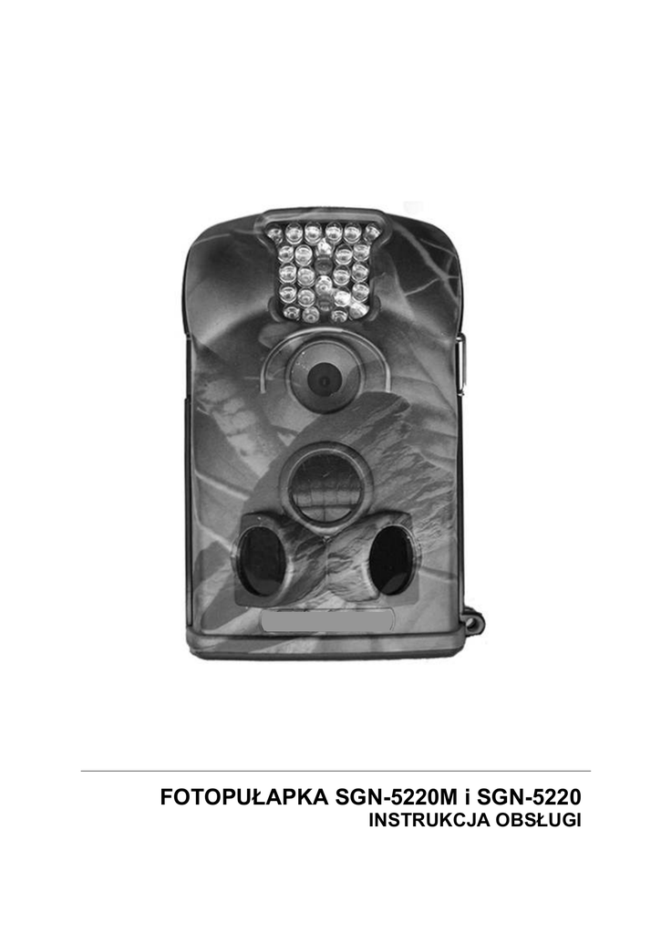 FOTOPUŁAPKA SGN-5220M i SGN-5220 INSTRUKCJA OBSŁUGI SPIS TREŚCI: Informacje ogólne 1.1 Charakterystyka 1.2 Zastosowanie 1.3 Wygląd Początek pracy 2.1 Wkładanie karty SIM (model SGN-5220M) 2.2 Wkładanie baterii 2.3 Wkładanie karty SD 2.4 Tryb testowy 2.5 Tryb live view 2.6 Zalety czujników przygotowujących Ustawienia zaawansowane 3.1 Ustawienia parametrów 3.2 Format plików 3.3 Podłączanie do komputera 3.4 Ustawianie funkcji MMS na komputerze 3.5 Wysyłanie MMS-ów z Fotopułapki SGN-5220M 3.6 Ustawianie lokalnego operatora sieci komórkowej i sprawdzanie siły sygnału Produkty z serii SGN 4.1 Dostępne produkty WaŜne informacje 5.1 Zapobieganie zwarciom 5.2 Zasilanie i pojemnik na baterie 5.3 Karta SD 5.4 Zasilanie urządzenia a nagrywanie filmów 5.5 940 nm IR LED 5.6 Mocowanie na statywie 5.7 FAQ do funkcji MMS Załącznik I: Specyfikacja techniczna Załącznik II: Zawartość zestawu Załącznik III: Instrukcja instalacji dodatkowego uchwytu na baterie 1.1 Charakterystyka Główne cechy: • Zdjęcia w wysokiej 12-megapikselowej rozdzielczości. • Diody podczerwone LED niewidoczne dla ludzkiego oka. • Tryb "Cam + Video" w którym aparat wykonuje zarówno zdjęcie i film przy kaŜdym wykrytym ruchu. • Bardzo niski pobór mocy. Bardzo długi czas działania (w trybie czuwania, aŜ do 3 miesięcy z 4 bateriami AA i 6 miesięcy z 8 bateriami AA). • Unikalny czujnik boczny zwiększający kąt wykrywania ruchu dzięki czemu poprawia szybkość reakcji aparatu. • Aparat działa w ekstremalnych temperaturach od -30° C do +70° C. • Kompaktowy rozmiar (135 x 90 x 5 cm) oraz barwy ochronne pozwalają na wygodniejsze ukrycie fotopułapki. • Szybki czas wyzwalania (~1 sekunda). • W trybie „Time Lapse” aparat automatycznie i ciągle robi zdjęcia / filmy wideo w określonym przedziale czasu. Jest to bardzo przydatne podczas obserwacji przyrodniczych jak np. kwitnienie roślin oraz do monitoringu terenu bez nadzoru (np. parkingi). • W przypadku ustawienia czasu pracy, aparat moŜe być zaprogramowany do pracy w określonych godzinach doby. Funkcja ta moŜe współpracować z funkcja „Time Lapse”. • Wyglądający jak uprząŜ od plecaka system pasków pozwala na szybkie i łatwe zamontowanie np. na drzewie. • Ustawienie opcji „Serial Number” umoŜliwia nadawanie kodu dla danej lokalizacji. Kody te są wyświetlane na zdjęciach. Pomaga to przy przeglądaniu zdjęć z wielu kamer/ lokalizacji . • Wbudowany kolorowy wyświetlacz LCD (2.36") do przeglądania zdjęć i filmów. • MoŜliwość naniesienia na zdjęcia informacji jak: data, czas, temperatura i faza księŜyca . • MoŜliwość ochrony dostępu do Menu 4-cyfrowym hasłem. • Do wybory dwa rozmiary obrazu MMS: 640 x 480 lub 320 x 240. • W zestawie płyta CD z programem dzięki któremu uŜytkownicy mogą skonfigurować aparat i funkcja MMS. • Rozdzielenie aparatu i modułu MMS zapewnia uŜytkownikom dowolność uŜytkowania: jako zwykły aparat lub jako zaawansowany rejestrator z funkcją MMS. • Dzięki wbudowanemu w uchwyt na baterie modułowi MMS, fotopułapka przesyła zdjęcia do wybranego telefonu komórkowego i/lub konto e-mail, zachowując duŜą szybkość transmisji i niski pobór energii w porównaniu do innych produktów tego typu dostępnych na rynku. • Automatyczny alarm tekstowy SMS przy niskim stanie baterii. • MoŜliwość sprawdzenia informacji na wbudowanym wyświetlaczu LCD o sile sygnału i wybranym operatorze sieci komórkowej. • Wszystkie zdjęcia MMS zapisywane są w osobnym folderze. • Wewnętrzna antena emituje silny sygnał polepszając zasięg urządzenia. • Działa na całym świecie za pośrednictwem sieci GSM / GPRS. Obsługuje cztery pasma: 850 / 900 1800 / 1900MHz. 1.2 Zastosowanie • • • • • Leśnictwo (monitoring drewna/ nielegalny wywóz śmieci) Badania przyrodnicze (badania faunistyczne, behawioralne) Myślistwo Monitoring obiektów (dom, biuro, parking) Oraz wszystkie inne wymagające zdalnego monitoringu Doświetlające diody IR Czujnik światła Wskaźnik ruchu Obiektyw Główny czujnik ruchu Przygotowujące czujniki ruchu Uszko na kłódkę Pokrywa pojemnika na baterie USB 6V DC Dolna pokrywa Pociągnij by otworzyć pokrywę TV Włącznik Naciśnij by zamknąć pokrywę Fotopułapka posiada następujące złącza: USB 2.0, gniazdo kart SD, wyjście TV (jack) i zewnętrznego zasilania (jack). 3 pozycyjny włącznik: OFF/ON/TEST którym moŜna wybrać tryb pracy. Zasilanie: uŜyj 4 nowych wysokiej jakość baterii AA. Producent rekomenduje uŜywanie baterii Litowych Energizer AA. By przedłuŜyć pracę urządzenia podłącz dodatkowy pojemnik z bateriami (patrz Załącznik III – Instrukcja instalowania dodatkowego pojemnika na baterie). Wyświetlacz LCD Klawiatura Klamra zamykająca Dodatkowy pojemnik na baterie Śruba UWAGA: jeśli nie uŜywasz fotopułapki przez dłuŜszy okres zalecane jest usunięcie baterii z urządzenia by zapobiec ich wycieknięciu co uszkodziłoby fotopułapkę oraz spowodowało utratę gwarancji. POCZĄTEK PRACY 2.1 Wkładanie karty SIM (tylko z modułem SGN-MMS) NaleŜy zaopatrzyć się w kartę SIM lokalnego operatora, upewniając się czy ma on moŜliwość wysyłania MMS-ów. Przy okazji zapytaj sprzedawcy o istotne informacje niezbędne do skonfigurowania funkcji MMS w fotopułapce. Przed instalacją karty zaleca się sprawdzenie karty SIM w telefonie komórkowym wysyłając dowolną wiadomość MMS. Otwórz pojemnik na baterię, wsuń kartę SIM w gniazdo i zamknij pokrywę. 2.2 Wkładanie baterii Aby umieścić baterie w fotopułapce postępuj wg. poniŜszej instrukcji: • Otwórz dolną pokrywę ciągnąc za uszko zamknięcia. • Naciśnij pokrywkę pojemnika na baterie. Powinna się otworzyć. • WłóŜ 4 baterie AA. Upewnij się, Ŝe końce + i – umieszczasz zgodnie z instrukcją na pokrywie. Zamknij ponownie pokrywę. Aby zainstalować uchwyt na baterie - patrz Załącznik III: