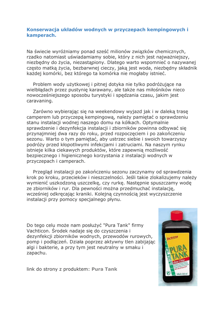 Konserwacja układów wodnych w przyczepach kempingowych i kamperach. Na świecie wyróżniamy ponad sześć milionów związków chemicznych, rzadko natomiast uświadamiamy sobie, który z nich jest najważniejszy, niezbędny do życia, niezastąpiony. Dlatego warto wspomnieć o nazywanej często matką życia, bezbarwnej cieczy, jaką jest woda, niezbędny składnik każdej komórki, bez którego ta komórka nie mogłaby istnieć. Problem wody użytkowej i pitnej dotyka nie tylko podróżujące na wielbłądach przez pustynię karawany, ale także nas miłośników nieco nowocześniejszego sposobu turystyki i spędzania czasu, jakim jest caravaning. Zarówno wybierając się na weekendowy wyjazd jak i w daleką trasę camperem lub przyczepą kempingową, należy pamiętać o sprawdzeniu stanu instalacji wodnej naszego domu na kółkach. Optymalnie sprawdzenie i dezynfekcja instalacji i zbiorników powinna odbywać się przynajmniej dwa razy do roku, przed rozpoczęciem i po zakończeniu sezonu. Warto o tym pamiętać, aby ustrzec siebie i swoich towarzyszy podróży przed kłopotliwymi infekcjami i zatruciami. Na naszym rynku istnieje kilka ciekawych produktów, które zapewnią możliwość bezpiecznego i higienicznego korzystania z instalacji wodnych w przyczepach i camperach. Przegląd instalacji po zakończeniu sezonu zaczynamy od sprawdzenia krok po kroku, przecieków i nieszczelności. Jeśli takie zlokalizujemy należy wymienić uszkodzoną uszczelkę, czy rurkę. Następnie spuszczamy wodę ze zbiorników i rur. Dla pewności można przedmuchać instalację, wcześniej odkręcając kraniki. Kolejną czynnością jest wyczyszczenie instalacji przy pomocy specjalnego płynu. Do tego celu może nam posłużyć "Pura Tank" firmy Vachticon. Środek nadaje się do czyszczenia i dezynfekcji zbiorników wodnych, przewodów rurowych, pomp i podłączeń. Działa poprzez aktywny tlen zabijając algi i bakterie, a przy tym jest neutralny w smaku i zapachu. link do strony z produktem: Pura Tank Można również użyć środka o podobnym działaniu "Schleimpur" znanej marki DR.KEDDO, który także pokonuje śluz, osad i algi, oraz związane z nimi dokuczliwe zapachy. link do strony z produktem: Schleimpur Zalecany jest również demontaż pompek wodnych. Dla przedłużenia ich żywotności możemy przez okres zimowy przechowywać je w domu. Istnieje również możliwość zastosowania środka "Certinox FrostSchutz", który chroni przewody i pompy przed działaniem niskich temperatur, poprzez zawarty w nim glikol, oraz zapobiega rozwijaniu się bakterii za pomocą jonów srebra. Tak przygotowana instalacja zapewni bezpieczny i bezawaryjny postój w czasie zimy. link do strony z produktem: FrostSchutz Przed rozpoczęciem sezonu także czeka nas kilka czynności związanych z pielęgnacja kanałów wodnych i zbiorników. Pamiętajmy, że podczas dłuższego postoju w instalacji zawsze istnieje możliwość pojawienia się bakterii. Dlatego dla pewności możemy kolejny raz użyć środków czyszczących, które stosowaliśmy przed "zimowaniem". Następnie montujemy pompki wodne i napełniamy zbiorniki czysta wodą. Aby instalacja była gotowa do użytku należy ją odpowietrzyć, oraz użyć środków uzdatniających wodę. Na rynku pojawia się kilka firm oferujących szereg tego typu produktów. Jedną z nich jest Certinox, proponujący środki przedłużające zdatność wody do picia na okres 6 miesięcy. Oferta zawiera do wyboru środki z chlorem, oraz bez. Każdy może wybrać interesujący go produkt w zależności od warunków termicznych i klimatycznych, w jakich woda będzie użytkowana. Także DR.KEDDO w swojej ofercie proponuje dodatki do zbiorników wodnych, redukujące nieprzyjemne zapachy, oraz środki do odkażania i przedłużania wodzie zdatności do picia. Kolejnymi firmami, które proponują środki uzdatniające i konserwujące wodę są Katadyn i Vachticon, ich produkty dostępne są zarówno w płynie jak i w tabletkach. Na szczególną uwagę zasługuje "Aqua Clean" Vachticon. Środek konserwuje wodę na bazie jonów srebra i skutecznie zabija niebezpieczne bakterie takie jak np. cholera czy salmonella. Woda jest czysta i gotowa do picia po upływie dwóch godzin od momentu użycia "Aqua Clean". link do strony z produktem : Aqua Clean Drugim ciekawym produktem tym razem firmy Katadyn jest "Micropur Forte". Dezynfekuje i konserwuje wodę za pomocą chloru i jonów srebra przedłużając jej zdatność do picia na okres 6 miesięcy. Wystarczy 30 min. od momentu użycia "Micropur Forte", aby wszystkie bakterie, zarazki chorobotwórcze i wirusy zginęły. Ze względu na swoją skuteczność i szybkość działania jego użycie jest szczególnie zalecane przy podróżach po krajach południowych i tropikach. link do strony z produktem: Micropur Forte Przy wyborze odpowiednich środków uzdatniających należy pamiętać, że od nich zależy nasze bezpieczeństwo i zdrowie. Więcej produktów można odnaleźć na stronach sklepu internetowego Elcamp w kategori: artykuły sanitarne Artykuł dzięki uprzejmości Red. Naczelnego strony internetowej www.karawaning.pl