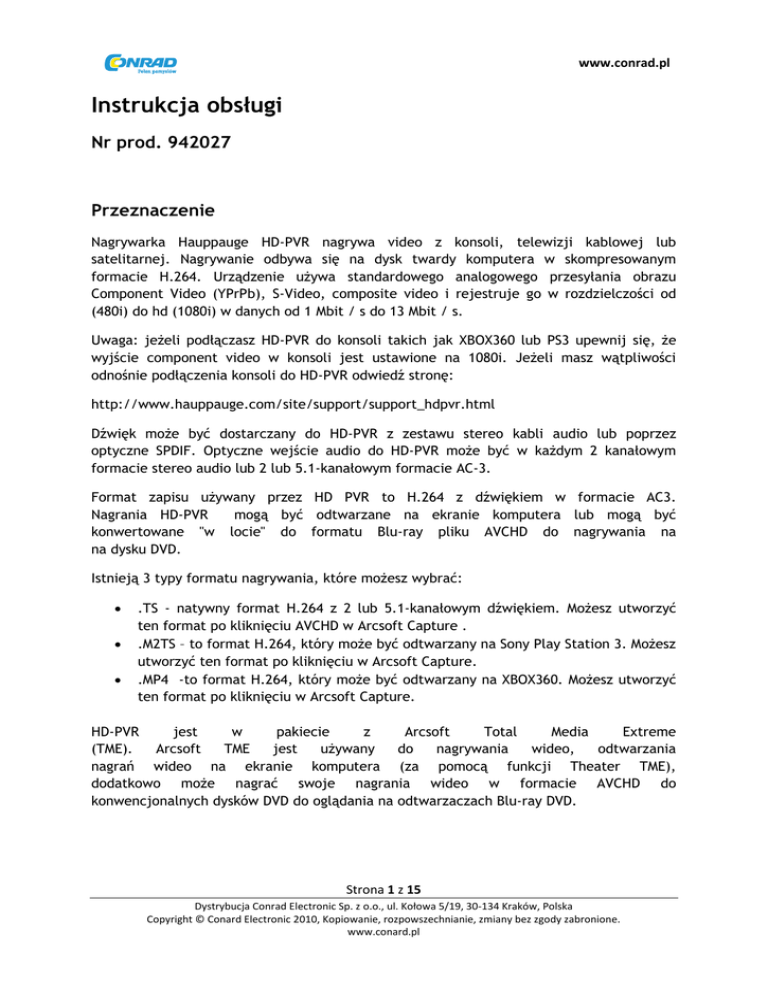 www.conrad.pl Instrukcja obsługi Nr prod. 942027 Przeznaczenie Nagrywarka Hauppauge HD-PVR nagrywa video z konsoli, telewizji kablowej lub satelitarnej. Nagrywanie odbywa się na dysk twardy komputera w skompresowanym formacie H.264. Urządzenie używa standardowego analogowego przesyłania obrazu Component Video (YPrPb), S-Video, composite video i rejestruje go w rozdzielczości od (480i) do hd (1080i) w danych od 1 Mbit / s do 13 Mbit / s. Uwaga: jeżeli podłączasz HD-PVR do konsoli takich jak XBOX360 lub PS3 upewnij się, że wyjście component video w konsoli jest ustawione na 1080i. Jeżeli masz wątpliwości odnośnie podłączenia konsoli do HD-PVR odwiedź stronę: http://www.hauppauge.com/site/support/support_hdpvr.html Dźwięk może być dostarczany do HD-PVR z zestawu stereo kabli audio lub poprzez optyczne SPDIF. Optyczne wejście audio do HD-PVR może być w każdym 2 kanałowym formacie stereo audio lub 2 lub 5.1-kanałowym formacie AC-3. Format zapisu używany przez HD PVR to H.264 z dźwiękiem w formacie AC3. Nagrania HD-PVR mogą być odtwarzane na ekranie komputera lub mogą być konwertowane "w locie" do formatu Blu-ray pliku AVCHD do nagrywania na na dysku DVD. Istnieją 3 typy formatu nagrywania, które możesz wybrać: .TS - natywny format H.264 z 2 lub 5.1-kanałowym dźwiękiem. Możesz utworzyć ten format po kliknięciu AVCHD w Arcsoft Capture . .M2TS – to format H.264, który może być odtwarzany na Sony Play Station 3. Możesz utworzyć ten format po kliknięciu w Arcsoft Capture. .MP4 -to format H.264, który może być odtwarzany na XBOX360. Możesz utworzyć ten format po kliknięciu w Arcsoft Capture. HD-PVR jest w pakiecie z Arcsoft Total Media Extreme (TME). Arcsoft TME jest używany do nagrywania wideo, odtwarzania nagrań wideo na ekranie komputera (za pomocą funkcji Theater TME), dodatkowo może nagrać swoje nagrania wideo w formacie AVCHD do konwencjonalnych dysków DVD do oglądania na odtwarzaczach Blu-ray DVD. Strona 1 z 15 Dystrybucja Conrad Electronic Sp. z o.o., ul. Kołowa 5/19, 30-134 Kraków, Polska Copyright © Conard Electronic 2010, Kopiowanie, rozpowszechnianie, zmiany bez zgody zabronione. www.conard.pl www.conrad.pl Instalacja HD-PVR 1. Podłączenie kabli Podłączenie poprzez USB: Podłącz jeden koniec (kwadratowy koniec) dołączonego w opakowaniu kabla USB do HD-PVR przez złącze USB. HD PVR jest kompatybilny tylko z USB 2.0 (high speed). Podłączenie wejścia wideo: Z konsoli do gier, telewizji kablowej lub satelitarnej. Istnieją trzy sposoby podłączenia wideo do HD-PVR. Potrzebujesz tylko jednego połączenia audio / video z urządzenia zewnętrznego do HD PVR: component video (YCrCb, YPrPb lub zielony/niebieski/czerwony). Podłącz component video z konsoli, dekodera satelitarnego do wejścia componemt video z tyłu HD-PVR (zobacz rysunek). Strona 2 z 15 Dystrybucja Conrad Electronic Sp. z o.o., ul. Kołowa 5/19, 30-134 Kraków, Polska Copyright © Conard Electronic 2010, Kopiowanie, rozpowszechnianie, zmiany bez zgody zabronione. www.conard.pl www.conrad.pl Uwaga: component video jest ograniczony do formatu HD 1080i. S-video – podłącz wyjście S-video z urządzenia do wejścia S-Video z przodu HD-PVR. Composit video – podłącz urządzenie z wyjścia composite video (żółte złącze RCA) z żółtym wejściem composit video z przodu HD-PVR. Przepustowość sygnału video bez opóźnienia w nagrywaniu (opcjonalne): Aby oglądać wideo na żywo z konsoli do gier lub dekodera na TV zestaw bez żadnych opóźnień, można podłączyć wyjście component video z HD-PVR do wejścia component video na ekranie telewizora. Uwaga: Twój Poprzez włączony wyłączony. HD-PVR musi być wyjście wideo. wtedy będzie działać, włączony Jeśli nawet jeśli do HD-PVR komputer pracy jest jest Podłączenie audio: Audio z dekodera jest podłączone, gdy zostało podłączone wejście wideo: albo optyczne wejście audio (z tyłu), wejście RCA audio (z tyłu) lub wejście RCA audio (z przodu). Optyczne wyjście audio jest podłączone na tylnym panelu. 1. Uruchom komputer 2. Podłącz dostarczony kabel zasilający do HD-PVR Strona 3 z 15 Dystrybucja Conrad Electronic Sp. z o.o., ul. Kołowa 5/19, 30-134 Kraków, Polska Copyright © Conard Electronic 2010, Kopiowanie, rozpowszechnianie, zmiany bez zgody zabronione. www.conard.pl www.conrad.pl Po uruchomieniu komputera (z systemem Windows) podłącz zasilacz (5 VDC, 2 Amp.) do wejścia zasilania HD-PVR. 3. Instalacja sterowników i aplikacji HD-PVR. Uwaga: HD-PVR musi być włączony i podłączony do komputera podczas instalacji sterowników. Włącz komputer i uruchom system Windows. Jeżeli pojawi się kreator „Znaleziono nowy sprzęt”, anuluj go i pozwól systemowi Windows załadować się w pełni. Wsadź płytę CD-ROM WinTV do napędu CD-ROM w Twoim komputerze. Uwaga: Jeżeli CD-ROM nie uruchomi się automatycznie, otwórz zawartość płyty CD i uruchom plik „Setup.exe” Instalator „Hauppauge WinTV” pojawi się na ekranie monitora. Zainstaluj sterowniki HD-PVR: Wciśnij przycisk oznaczony jako „Step 1: Install Drivers” Otworzy się niebieski obraz i zacznie się instalacja sterowników na Twoim komputerze. Po zakończeniu instalacji wciśnij przycisk „Finish” Zainstaluj aplikacje: Wciśnij przycisk oznaczony jako „Step 2: Install Software”. Wybierz język i naciśnij dalej, potem naciśnij Install. Zostaną zainstalowane składniki: Arcsoft Total Media Extreme, HD-PVR, IR Blaster. Po wszystkim naciśnij OK., a potem EXIT. Uwaga: ostania wersja aplikacji dostępna jest pod adresem www.hauppauge.com w sekcji Support. 4. Instalacja kabli IR Blaster (gdy używane HD-PVR z kablem TV lub dekoderem) Włóż końcówkę kabla IR Blaster (typu jack) na koniec nadajnika do wyjścia IR Blaster w HD-PVR. Zainstaluj nadajnik IR Blaster w swoim dekoderze. Przyłącz koniec nadajnika IR na czujnik zdalnego sterowania dekodera, który będzie kontrolowany.