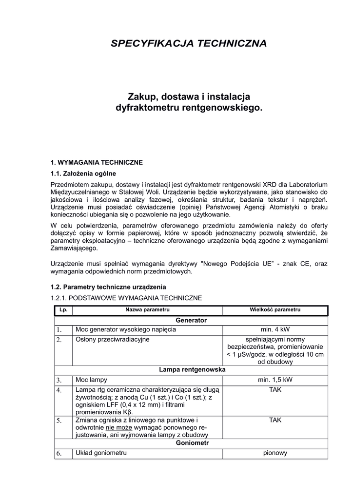 SPECYFIKACJA TECHNICZNA Zakup, dostawa i instalacja dyfraktometru rentgenowskiego. 1. WYMAGANIA TECHNICZNE 1.1. Założenia ogólne Przedmiotem zakupu, dostawy i instalacji jest dyfraktometr rentgenowski XRD dla Laboratorium Międzyuczelnianego w Stalowej Woli. Urządzenie będzie wykorzystywane, jako stanowisko do jakościowa i ilościowa analizy fazowej, określania struktur, badania tekstur i naprężeń. Urządzenie musi posiadać oświadczenie (opinię) Państwowej Agencji Atomistyki o braku konieczności ubiegania się o pozwolenie na jego użytkowanie. W celu potwierdzenia, parametrów oferowanego przedmiotu zamówienia należy do oferty dołączyć opisy w formie papierowej, które w sposób jednoznaczny pozwolą stwierdzić, że parametry eksploatacyjno – techniczne oferowanego urządzenia będą zgodne z wymaganiami Zamawiającego. Urządzenie musi spełniać wymagania dyrektywy "Nowego Podejścia UE” - znak CE, oraz wymagania odpowiednich norm przedmiotowych. 1.2. Parametry techniczne urządzenia 1.2.1. PODSTAWOWE WYMAGANIA TECHNICZNE Lp. 1. 2. Nazwa parametru Generator Moc generator wysokiego napięcia Osłony przeciwradiacyjne Wielkość parametru min. 4 kW spełniającymi normy bezpieczeństwa, promieniowanie < 1 μSv/godz. w odległości 10 cm od obudowy Lampa rentgenowska 3. 4. 5. 6. Moc lampy Lampa rtg ceramiczna charakteryzująca się długą żywotnością; z anodą Cu (1 szt.) i Co (1 szt.); z ogniskiem LFF (0,4 x 12 mm) i filtrami promieniowania Kβ. Zmiana ogniska z liniowego na punktowe i odwrotnie nie może wymagać ponownego rejustowania, ani wyjmowania lampy z obudowy Goniometr Układ goniometru min. 1,5 kW TAK TAK pionowy Lp. 7. 8. 9. Nazwa parametru Sterowany ruch lampy i detektora z rozdzielczością kątową 0.0001˚, niezależnym napędem kątów Theta i 2Theta i potwierdzeniem wartości szerokości połówkowej pierwszego refleksu dla wzorca NIST SRM660a LaB6 = 0.026˚ 2Θ Zakres kątowy 2Theta Wielkość parametru TAK co najmniej od -110˚ do 168˚ Promień goniometru 240 mm Optyka wiązki pierwotnej 10. 11. 12. 13. 14. 15. 16. 17. 18. 19. 20. 21. 22. 23. Programowana OPTYKA wiązki pierwotnej z kompletem szczelin Szczeliny Sollera TAK 0,04 radiana Zwierciadło paraboliczne dające wiązkę równoległą dla promieniowania Cu z zestawem szczelin niskokątowych i masek wiązki Monokapilara (cylindryczny kolimator wiazki pierwotnej) o średnicy 0.1 mm Specjalna szczelina z molibdenu 1/32˚ do badań SAX Optyka wiązki ugiętej i detekcja TAK Zespół optyki Bragg-Brentano zawierający stałe szczeliny przeciwrozproszeniowe detektora paskowego Zespół optyki Bragg-Brentano zawierający stałe szczeliny przeciwrozproszeniowe, zapewniające badania odbiciowe jak i niskokątowe (SAXS) w trybie transmisyjnym detektora 2D Szczeliny Sollera TAK TAK TAK TAK 0,05 radiana Kolimator wiązki ugiętej 0.18 stopnia do reflektometrii i tekstury z kanałem szczelin Sollera Szybki, półprzewodnikowy, liniowy detektor rastrowy 2D z krystalicznym monochromatorem dla promieniowania Cu o parametrach: - maksymalna ilość zliczeń, do co najmniej 9.000.000.000 impulsów/sek. na cały detektor - liniowość, do co najmniej 3.000.000.000 impulsów/sek. na cały detektor - rozdzielczość detektora poniżej – 60 µm - apertura szczeliny odbiorczej – programowany zakres szerokości aktywnej - możliwości pracy 0D, 1D, 2D i 3D - niewypełniony gazem Stoliki prób TAK Stolik próbek proszkowych, do pomiaru próbek płaskich w geometrii odbiciowej i transmisyjnej, próbka rotująca Stolik do mikrodyfrakcji TAK Stolik z uchwytem do badań próbek w kapilarach TAK Stolik do przygotowywania prób proszkowych TAK TAK TAK Lp. Nazwa parametru Wielkość parametru 24. Koło z przesuwem osi chi-phi i z. Wszystkie osie sterowane komputerowo. Zakres obrotu Phi 720º, chi 95º, maksymalna wysokość próbki (Z) 64 mm, maksymalna waga próbki 2 kg Uchwyty próbek TAK 25. Uchwyty do próbek proszkowych o średnicy 16 mm z możliwością obrotu Uchwyty do próbek stałych o max. średnicy 46 mm z możliwością obrotu Uchwyty próbek wraz z wkładami do badań transmisyjnych z możliwością obrotu Podkłady bezodbiciowe Si 3 szt. Folia mylarowa do badań SAXS (rolka 2500 m) 1 szt. 26. 27. 28. 29. 3 szt. 3 szt. 2 szt. Oprogramowanie 30. 31. 32. 33. 34. 35. 36. 37. 38. 39. 40. 41. 42. 43. 44. 45. Program sterujący pracą dyfraktometru i zbieraniem danych Program do identyfikacji fazowej i analizy Rietvelda współpracujący z kartoteka ICDD (na min. 5 stanowisk komp.) Program do konwertowania danych w 2D (na min. 5 stanowisk komp.) Program do analizy naprężeń z możliwością analizy naprężeń między warstwami (na min. 5 stanowisk komp.) Program do analizy tekstury (na min. 5 stanowisk komp.) Program do analizy badań SAXS (na min. 5 stanowisk komp.) Program do reflektometrii (na min. 5 stanowisk komp.) Program do analizy warstw epitaksjalnych (na min. 5 stanowisk komp.) Baza danych PDF-4+ TAK Komputer zgodny z konfiguracją ZALECANĄ (nie minimalną) przez producenta, monitor LCD min. 21”, drukarka laserowa, mysz optyczna Podstawowe oprogramowanie biurowe: arkusz kalkulacyjny i edytor tekstu, z możliwością pełnej edycji dokumentów w formatach .xlsx i .docx, z możliwością bezpośredniego zapisu do formatu .pdf Wyposażenie dodatkowe TAK TAK TAK TAK TAK TAK TAK TAK TAK TAK w języku polskim Układ chłodzenia zapewniający chłodzenie dyfraktometru pracujący w trybie woda-woda Kompresor bezolejowy lub olejowy z filtrem oleju, poziom hałasu ≤ 45dB, 230V/50Hz Próbki weryfikująca do badań SAXS TAK Mikroskop centrujący TAK Wszystkie elementy optyki oraz stoliki muszą zapewniać możliwość szybkiej wymiany bez konieczności re-justowania dyfraktometru TAK TAK TAK Lp. Nazwa parametru Wielkość parametru 46. Wymienione elementy dyfraktometru powinny być fabrycznie prejustowane i wykonane z materiału o wysokiej trwałości (stal hartowana) zapewniającego pracę bez k