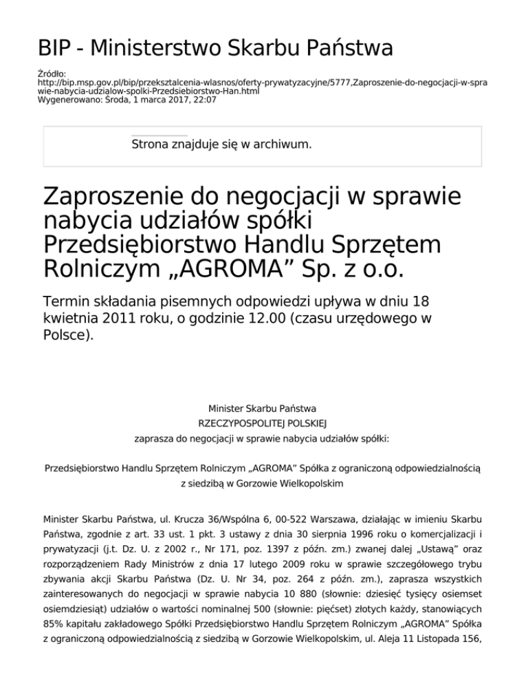 BIP - Ministerstwo Skarbu Państwa Źródło: http://bip.msp.gov.pl/bip/przeksztalcenia-wlasnos/oferty-prywatyzacyjne/5777,Zaproszenie-do-negocjacji-w-spra wie-nabycia-udzialow-spolki-Przedsiebiorstwo-Han.html Wygenerowano: Środa, 1 marca 2017, 22:07 Strona znajduje się w archiwum. Zaproszenie do negocjacji w sprawie nabycia udziałów spółki Przedsiębiorstwo Handlu Sprzętem Rolniczym „AGROMA” Sp. z o.o. Termin składania pisemnych odpowiedzi upływa w dniu 18 kwietnia 2011 roku, o godzinie 12.00 (czasu urzędowego w Polsce). Minister Skarbu Państwa RZECZYPOSPOLITEJ POLSKIEJ zaprasza do negocjacji w sprawie nabycia udziałów spółki: Przedsiębiorstwo Handlu Sprzętem Rolniczym „AGROMA” Spółka z ograniczoną odpowiedzialnością z siedzibą w Gorzowie Wielkopolskim Minister Skarbu Państwa, ul. Krucza 36/Wspólna 6, 00-522 Warszawa, działając w imieniu Skarbu Państwa, zgodnie z art. 33 ust. 1 pkt. 3 ustawy z dnia 30 sierpnia 1996 roku o komercjalizacji i prywatyzacji (j.t. Dz. U. z 2002 r., Nr 171, poz. 1397 z późn. zm.) zwanej dalej „Ustawą” oraz rozporządzeniem Rady Ministrów z dnia 17 lutego 2009 roku w sprawie szczegółowego trybu zbywania akcji Skarbu Państwa (Dz. U. Nr 34, poz. 264 z późn. zm.), zaprasza wszystkich zainteresowanych do negocjacji w sprawie nabycia 10 880 (słownie: dziesięć tysięcy osiemset osiemdziesiąt) udziałów o wartości nominalnej 500 (słownie: pięćset) złotych każdy, stanowiących 85% kapitału zakładowego Spółki Przedsiębiorstwo Handlu Sprzętem Rolniczym „AGROMA” Spółka z ograniczoną odpowiedzialnością z siedzibą w Gorzowie Wielkopolskim, ul. Aleja 11 Listopada 156, 66-400 Gorzów Wielkopolski, zwanej dalej „Spółką”. Zgodnie z art. 36 Ustawy uprawnionym pracownikom przysługuje prawo do nieodpłatnego nabycia do 15% udziałów Spółki, objętych przez Skarb Państwa w dniu wpisania Spółki do rejestru. Minister Skarbu Państwa przewiduje możliwość sprzedaży udziałów nie nabytych przez uprawnionych pracowników wyłonionemu w trybie niniejszych negocjacji Inwestorowi, w przypadku wygaśnięcia prawa uprawnionych pracowników do nieodpłatnego nabycia tych udziałów. Podstawowym przedmiotem działalności Spółki jest prowadzenie działalności handlowej i usługowej, przede wszystkim handel sprzętem rolniczym, w tym ciągnikami i maszynami rolniczymi oraz częściami do maszyn rolniczych i ciągników, ogumieniem, łożyskami i paskami klinowymi, świadczenie usług serwisu samochodowego, naprawy i remonty sprzętu rolniczego. Spółka prowadzi aktywną sprzedaż na terenie województwa lubuskiego wraz z powiatem myśliborskim (województwo zachodnio-pomorskie). Wszyscy zainteresowani, zwani dalej „Potencjalnymi Inwestorami” proszeni są o składanie pisemnego potwierdzenia zainteresowania uczestnictwem w negocjacjach do Spółki ABC Consulting Sp. z o.o., reprezentującej Ministra Skarbu Państwa w procesie prywatyzacji spółki Przedsiębiorstwo Handlu Sprzętem Rolniczym „AGROMA” Spółka z o.o. z siedzibą w Gorzowie Wielkopolskim, pod adresem: ABC Consulting Sp. z o.o. ul. Grunwaldzka 102, 80-244 Gdańsk, tel. (58) 341-43-65, (58) 346-15-58, fax (58) 344-16-08, mail: [email protected]. Osobami odpowiedzialnymi za przyjmowanie zgłoszeń po stronie Doradcy są: Małgorzata Okołotowicz, Dariusz Łapiński. Po przedstawieniu aktualnych dokumentów korporacyjnych, tj. odpisu z rejestru przedsiębiorców Krajowego Rejestru Sądowego /zaświadczenia o wpisie do ewidencji działalności gospodarczej, odzwierciedlających aktualną reprezentację Potencjalnego Inwestora (z datą wystawienia nie wcześniejszą niż trzy miesiące przed przedstawieniem dokumentu), a w przypadku gdy zainteresowanym jest osoba fizyczna nie będąca przedsiębiorcą – okazaniu dokumentu potwierdzającego tożsamość, a także ewentualnego pełnomocnictwa oraz po podpisaniu przez odpowiednio umocowanych przedstawicieli Potencjalnego Inwestora dokumentu „Zobowiązanie do zachowania poufności”, zostanie udostępnione, począwszy od dnia następnego po dniu ukazania się niniejszego zaproszenia, „Memorandum Informacyjne o Spółce” (zwane dalej „Memorandum”), zawierające informacje o sytuacji prawnej i ekonomiczno-finansowej Spółki oraz o strukturze odpowiedzi na publicznie ogłoszone zaproszenie do negocjacji. Osobami odpowiedzialnymi za udostępnianie Memorandum będą: Małgorzata Okołotowicz, Dariusz Łapiński. „Memorandum” będzie udostępniane do dnia bezpośrednio poprzedzającego ostatni dzień składania pisemnych odpowiedzi na publicznie ogłoszone zaproszenie do negocjacji w sprawie nabycia udziałów Spółki. Przedmiotem negocjacji będzie w szczególności: cena za nabywane udziały, program rozwoju Spółki obejmujący m.in. zobowiązania inwestycyjne, zobowiązania w zakresie ochrony środowiska, zobowiązania dotyczące ochrony interesów pracowników i innych osób związanych ze Spółką oraz sposoby zabezpieczenia wykonania tych zobowiązań. Termin składania pisemnych odpowiedzi na publicznie ogłoszone zaproszenie do negocjacji w sprawie nabycia udziałów Spółki przez Potencjalnych Inwestorów, którzy odebrali „Memorandum Informacyjne o Spółce”, upływa w dniu 18 kwietnia 2011 roku, o godzinie 12.00 (czasu urzędowego w Polsce). Odpowiedzi Potencjalnych Inwestorów powinny być sporządzone w języku polskim. Należy je składać w dwóch egzemplarzach, w zaklejonej kopercie, w Ministerstwie Skarbu Państwa, ul. Krucza 36/Wspólna 6, 00-522 Warszawa, w Sekretariacie Departamentu Prywatyzacji, pokój nr 501. Na kopercie należy umieścić napis: „Odpowiedź na publiczne zaproszenie do negocjacji w sprawie nabycia udziałów Spółki Przedsiębiorstwo Handlu Sprzętem Rolniczym „AGROMA” Spółka z o.o. z siedzibą w Gorzowie Wielkopolskim – NIE OTWIERAĆ" oraz dane umożliwiające identyfikację Potencjalnego Inwestora. Rozpatrywane będ