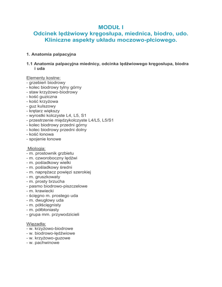 MODUŁ I Odcinek lędźwiowy kręgosłupa, miednica, biodro, udo