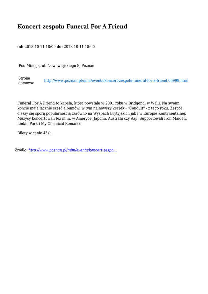Koncert zespołu Funeral For A Friend od: 2013-10-11 18:00 do: 2013-10-11 18:00 Pod Minogą, ul. Nowowiejskiego 8, Poznań Strona domowa: http://www.poznan.pl/mim/events/koncert-zespolu-funeral-for-a-friend,66998.html Funeral For A Friend to kapela, która powstała w 2001 roku w Bridgend, w Walii. Na swoim koncie mają łącznie sześć albumów, w tym najnowszy krążek - "Conduit" - z tego roku. Zespół cieszy się sporą popularnością zarówno na Wyspach Brytyjskich jak i w Europie Kontynentalnej. Muzycy koncertowali też m.in. w Ameryce, Japonii, Australii czy Azji. Supportowali Iron Maiden, Linkin Park i My Chemical Romance. Bilety w cenie 45zł. Źródło: http://www.poznan.pl/mim/events/koncert-zespo…