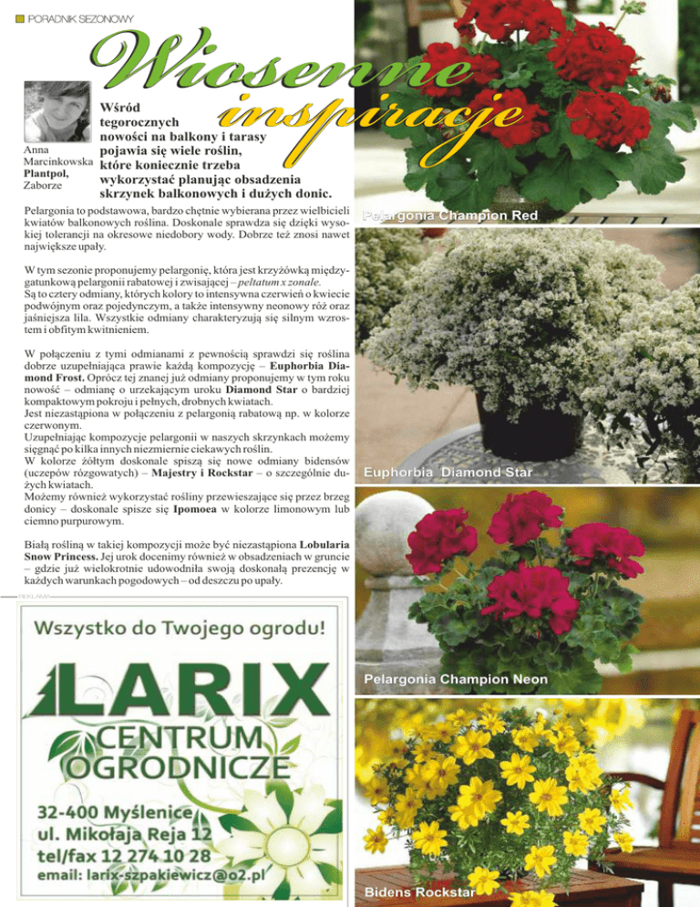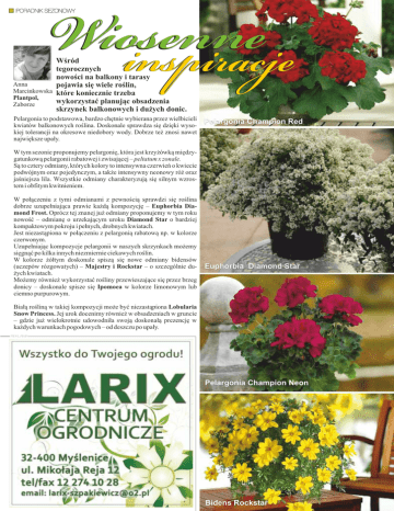 Wiosenne inspiracje PORADNIK SEZONOWY Wśród tegorocznych nowości na balkony i tarasy Anna pojawia się wiele roślin, Marcinkowska które koniecznie trzeba Plantpol, wykorzystać planując obsadzenia Zaborze skrzynek balkonowych i dużych donic. Pelargonia to podstawowa, bardzo chętnie wybierana przez wielbicieli kwiatów balkonowych roślina. Doskonale sprawdza się dzięki wysokiej tolerancji na okresowe niedobory wody. Dobrze też znosi nawet największe upały. Pelargonia Champion Red W tym sezonie proponujemy pelargonię, która jest krzyżówką międzygatunkową pelargonii rabatowej i zwisającej – peltatum x zonale. Są to cztery odmiany, których kolory to intensywna czerwień o kwiecie podwójnym oraz pojedynczym, a także intensywny neonowy róż oraz jaśniejsza lila. Wszystkie odmiany charakteryzują się silnym wzrostem i obfitym kwitnieniem. W połączeniu z tymi odmianami z pewnością sprawdzi się roślina dobrze uzupełniająca prawie każdą kompozycję – Euphorbia Diamond Frost. Oprócz tej znanej już odmiany proponujemy w tym roku nowość – odmianę o urzekającym uroku Diamond Star o bardziej kompaktowym pokroju i pełnych, drobnych kwiatach. Jest niezastąpiona w połączeniu z pelargonią rabatową np. w kolorze czerwonym. Uzupełniając kompozycje pelargonii w naszych skrzynkach możemy sięgnąć po kilka innych niezmiernie ciekawych roślin. W kolorze żółtym doskonale spiszą się nowe odmiany bidensów (uczepów rózgowatych) – Majestry i Rockstar – o szczególnie dużych kwiatach. Możemy również wykorzystać rośliny przewieszające się przez brzeg donicy – doskonale spisze się Ipomoea w kolorze limonowym lub ciemno purpurowym. Euphorbia Diamond Star Białą rośliną w takiej kompozycji może być niezastąpiona Lobularia Snow Princess. Jej urok docenimy również w obsadzeniach w gruncie – gdzie już wielokrotnie udowodniła swoją doskonałą prezencję w każdych warunkach pogodowych – od deszczu po upały. REKLAMA Pelargonia Champion Neon Bidens Rockstar W przestrzeni miejskiej często wykorzystana jest na rabatach jako obwódka nasadzeń np. z Sunpatiensem – niecierpkiem bardzo odpornym na pełne słońce i intensywne deszcze. W skrzynkach balkonowych nie może zabraknąć Superbells® i Petunii kaskadowej. Te pierwsze zachwycają niezwykłymi kolorami kwiatów – często dwubarwnymi bądź niespotykanie dotychczas przebarwionymi poprzecznymi, jasnymi paskami. Niezaprzeczenie królują wśród nich Cherry Star i Lemon Slice, ale także tegoroczna nowość: Banana Chocolate. Warte zauważenia jest także Superbells® TrioMio Superbells - to właściwie program: TrioMio w jednej dużej donicy sadzimy 3 rośliny o kontrastowych barwach. Oferta begonii też jest bardzo bogata na ten sezon. Do pięknych begonii o zwisającym pokroju - Belleconia dochodzi nowa seria Begonia Cottage w mocnych, pięknych barwach. Cztery odmiany tej serii szybko rosną i mocno się krzewią, kwitną niezwykle obficie przez całe lato. REKLAMA PORADNIK SEZONOWY Superbells® Cherry Star Superbells® Lemon Slice
