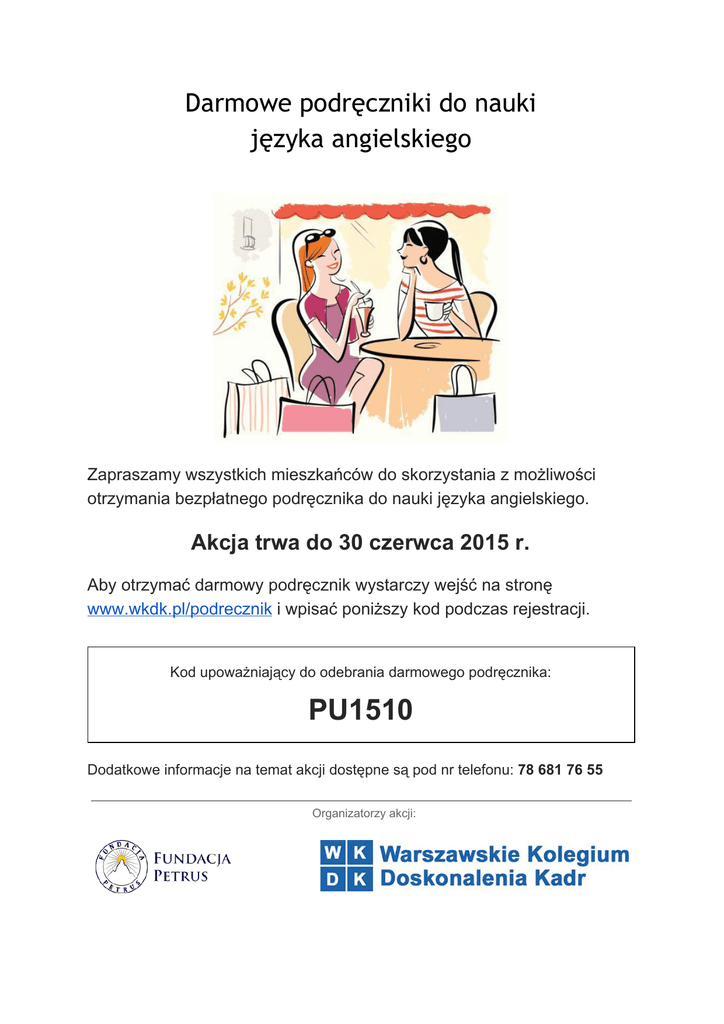 Darmowe podręczniki do nauki języka angielskiego Zapraszamy wszystkich mieszkańców do skorzystania z możliwości otrzymania bezpłatnego podręcznika do nauki języka angielskiego. Akcja trwa do 30 czerwca 2015 r. Aby otrzymać darmowy podręcznik wystarczy wejść na stronę www.wkdk.pl/podrecznik i wpisać poniższy kod podczas rejestracji. Kod upoważniający do odebrania darmowego podręcznika: PU1510 Dodatkowe informacje na temat akcji dostępne są pod nr telefonu: 78 681 76 55 Organizatorzy akcji: