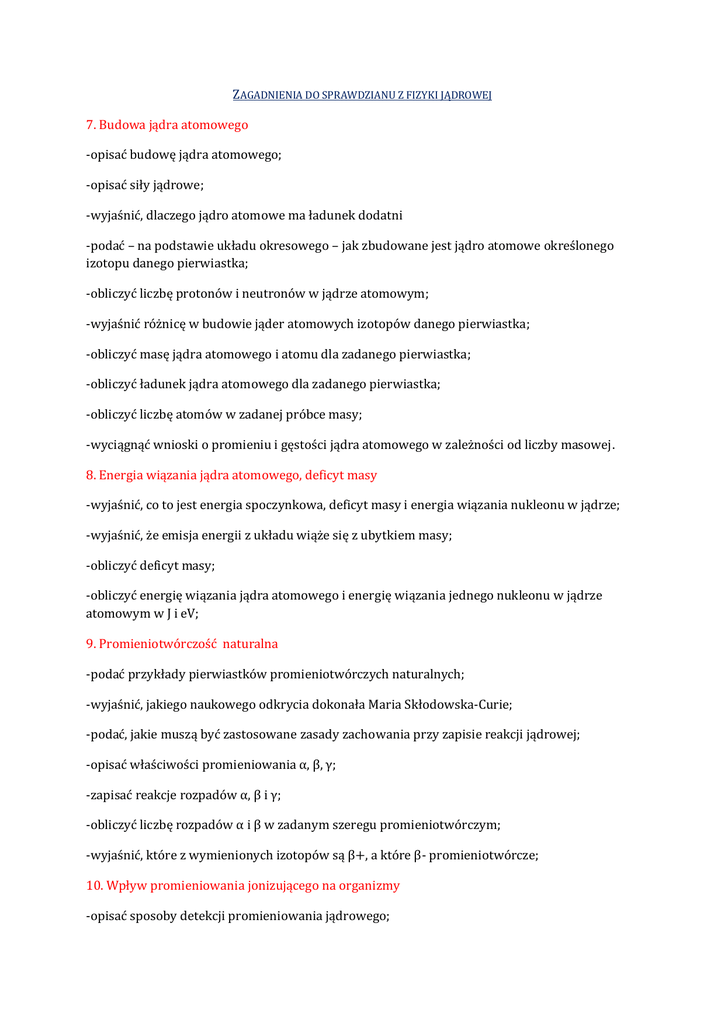 ZAGADNIENIA DO SPRAWDZIANU Z FIZYKI JĄDROWEJ 7. Budowa jądra atomowego -opisać budowę jądra atomowego; -opisać siły jądrowe; -wyjaśnić, dlaczego jądro atomowe ma ładunek dodatni -podać – na podstawie układu okresowego – jak zbudowane jest jądro atomowe określonego izotopu danego pierwiastka; -obliczyć liczbę protonów i neutronów w jądrze atomowym; -wyjaśnić różnicę w budowie jąder atomowych izotopów danego pierwiastka; -obliczyć masę jądra atomowego i atomu dla zadanego pierwiastka; -obliczyć ładunek jądra atomowego dla zadanego pierwiastka; -obliczyć liczbę atomów w zadanej próbce masy; -wyciągnąć wnioski o promieniu i gęstości jądra atomowego w zależności od liczby masowej. 8. Energia wiązania jądra atomowego, deficyt masy -wyjaśnić, co to jest energia spoczynkowa, deficyt masy i energia wiązania nukleonu w jądrze; -wyjaśnić, że emisja energii z układu wiąże się z ubytkiem masy; -obliczyć deficyt masy; -obliczyć energię wiązania jądra atomowego i energię wiązania jednego nukleonu w jądrze atomowym w J i eV; 9. Promieniotwórczość naturalna -podać przykłady pierwiastków promieniotwórczych naturalnych; -wyjaśnić, jakiego naukowego odkrycia dokonała Maria Skłodowska-Curie; -podać, jakie muszą być zastosowane zasady zachowania przy zapisie reakcji jądrowej; -opisać właściwości promieniowania α, β, γ; -zapisać reakcje rozpadów α, β i γ; -obliczyć liczbę rozpadów α i β w zadanym szeregu promieniotwórczym; -wyjaśnić, które z wymienionych izotopów są β+, a które β- promieniotwórcze; 10. Wpływ promieniowania jonizującego na organizmy -opisać sposoby detekcji promieniowania jądrowego; -wyjaśnić, że promieniowanie jądrowe jest zabójcze dla bakterii; -opisać objawy choroby popromiennej; -analizować wpływ promieniowania α, β i γ na człowieka, zwierzęta i organizmy jednokomórkowe; -oszacować dawkę równoważną promieniowania w Sv; -przeanalizować, czy dana ilość promieniowania jest groźna dla człowieka; 11. Czas połowicznego zaniku, aktywność próbki -podać, co oznacza czas połowicznego rozpadu; -opisać rozpad pierwiastka promieniotwórczego, posługując się pojęciem czasu połowicznego rozpadu; -odczytać z wykresu czas połowicznego rozpadu; -narysować wykres zależności liczby jąder promieniotwórczych w próbce od czasu ; -oszacować aktywność próbki. 12. Zastosowanie izotopów promieniotwórczych -wymienić izotopy promieniotwórcze wykorzystywane w datowaniu izotopowym; -podać, gdzie stosuje się znaczniki promieniotwórcze; -wymienić zastosowanie izotopów promieniotwórczych w urządzeniach kontrolnopomiarowych; -wyjaśnić, dlaczego w datowaniu szczątków organicznych stosuje się 14C, a w geologii 40K; -oszacować wiek próbki na podstawie zawartości 14C; -analizować, który rodzaj promieniowania jądrowego należy zastosować do pomiaru grubości warstwy; 13. Reakcje jądrowe, rozszczepienie jąder ciężkich -podać, na czym polega reakcja rozszczepienia; -wymienić warunki przeprowadzania reakcji jądrowych; -zapisać reakcje jądrowe zgodnie z zasadami zachowania liczby nukleonów, ładunku i energii; -obliczyć energię wydzieloną podczas rozszczepienia zadanej masy izotopu rozszczepialnego. 14. Reakcja łańcuchowa, masa krytyczna -podać warunek konieczny, aby nastąpiła reakcja łańcuchowa; - wymienić materiały rozszczepialne; -zapisać schemat reakcji łańcuchowej; -wyjaśnić pojęcie masy krytycznej; -analizować zjawiska fizyczne towarzyszące wybuchowi jądrowemu; -opisać skutki wybuchu jądrowego; -wyjaśnić, w jaki sposób otrzymuje się materiały rozszczepialne; 15. Reaktor jądrowy, procesy zachodzące w reaktorze -podać, jakie paliwo stosuje się w reaktorach jądrowych; -podać, jak kontroluje się reakcje rozszczepienia w reaktorze; -analizować przemiany energii zachodzące podczas pracy reaktora jądrowego; -obliczyć masę paliwa potrzebnego do pracy reaktora o zadanej mocy na określony czas; -analizować informacje o awarii reaktora; - przeanalizować szereg przemian jądrowych zachodzących wewnątrz reaktora i wyjaśnić, w których reakcjach uwalniana jest energia; 16. Reaktory jądrowe w gospodarce i nauce -podać, że źródłem energii w elektrowniach jądrowych są reaktory o dużej mocy; -podać, że reaktory o mniejszej mocy są źródłem neutronów do badań jądrowych i wytwarzania izotopów promieniotwórczych; -porównać pracę elektrowni jądrowej z pracą elektrowni węglowej; -porównać ilość odpadów z elektrowni jądrowej i z elektrowni węglowej o podobnej mocy. 17. Synteza jądrowa -opisać plazmę; -podać warunki konieczne dla zajścia syntezy jądrowej; -analizować reakcję syntezy jądrowej we wnętrzu gwiazdy w zależności od jej masy.