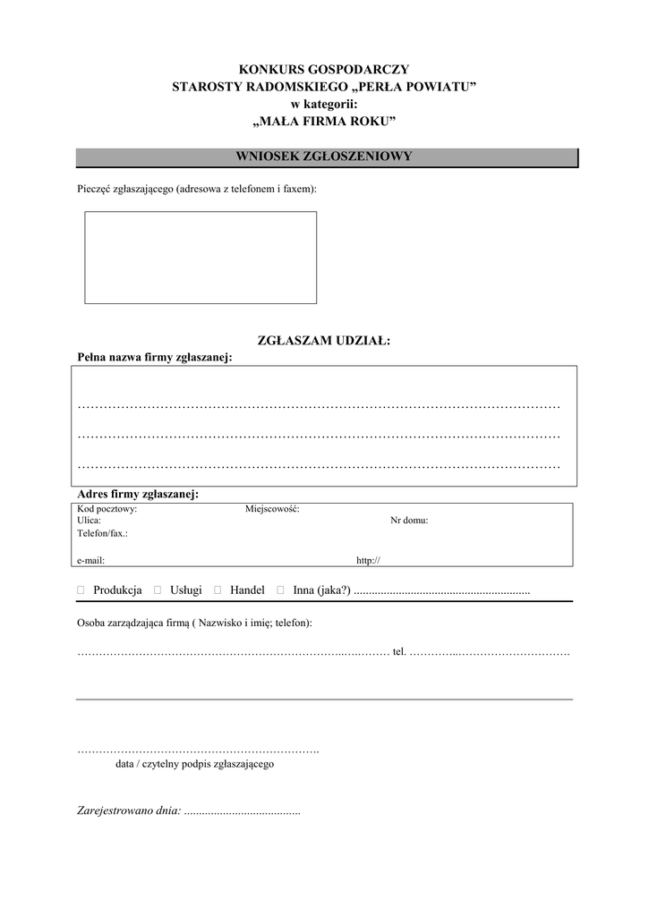 KONKURS GOSPODARCZY STAROSTY RADOMSKIEGO „PERŁA POWIATU” w kategorii: „MAŁA FIRMA ROKU” WNIOSEK ZGŁOSZENIOWY Pieczęć zgłaszającego (adresowa z telefonem i faxem): ZGŁASZAM UDZIAŁ: Pełna nazwa firmy zgłaszanej: ………………………………………………………………………………………………… ………………………………………………………………………………………………… ………………………………………………………………………………………………… Adres firmy zgłaszanej: Kod pocztowy: Ulica: Telefon/fax.: Miejscowość: Nr domu: e-mail: Produkcja http:// Usługi Handel Inna (jaka?) ........................................................... Osoba zarządzająca firmą ( Nazwisko i imię; telefon): ………………………………………………………………..….……… tel. …………..…………………………. …………………………………………………………. data / czytelny podpis zgłaszającego Zarejestrowano dnia: ....................................... KONKURS GOSPODARCZY STAROSTY RADOMSKIEGO „PERŁA POWIATU” w kategorii: „MAŁA FIRMA ROKU” ANKIETA ZGŁOSZENIOWA Pełna nazwa przedsiębiorcy: ................................................................................................. ......................................... rok założenia: ..................... Dokładny adres: ..................................................................................................................... ............................................................. tel.: .....................................fax.: .............................. Nazwisko i imię osoby zarządzającej: ................................................................................... Podstawowe dziedziny działalności: ..................................................................................... ................................................................................................................................................ ................................................................................................................................................ Dane podstawowe dotyczące wyników ekonomicznych kandydata: w 2015 r. w 2016 r. Ilość zatrudnionych Sprzedaż w zł Eksport w zł Środki przeznaczone na inwestycje w zł Dane uzupełniające – dodatkowe: Środki przeznaczone na ochronę środowiska w zł Środki na działalność prospołeczną i charytatywną w zł Środki przeznaczone na innowacje i podnoszenie jakości Posiadane certyfikaty i znaki jakości przyznane w okresie ostatnich 5 lat: Nazwa certyfikatu Instytucja wydająca Rok Posiadane nagrody i wyróżnienia przyznane w okresie ostatnich 5 lat: Nazwa Instytucja przyznająca Rok Posiadane patenty, własne rozwiązania, nowoczesne technologie i produkty wdrożone i uzyskane w okresie ostatnich 5 lat: Nazwa opracowania Rok wdrożenia Uwaga: dane zawarte w tabelach używane będą wyłącznie dla potrzeb prac Kapituły Konkursu i nie będą udostępniane osobom trzecim. Przynależność do związków, zrzeszeń, organizacji bądź stowarzyszeń: ………………………………………………………………………………………………… ………………………………………………………………………………………………… ………………………………………………………………………………………………… Pozyskane środki unijne: ………………………………………………………………………………………………… ………………………………………………………………………………………………… ………………………………………………………………………………………………… Załączniki do ankiety: 1. Informacja o innych osiągnięciach nie uwzględnionych we wniosku oraz działalności prospołecznej i charytatywnej (nie więcej niż 1 strona). 2. Charakterystyka firmy niezbędna do wykorzystania w prezentacji i folderze promocyjnym Konkursu (nie więcej niż 1 strona). Wyrażam zgodę na przetwarzanie moich danych osobowych dla potrzeb konkursu zgodnie z Ustawą z dnia 29.08.1997 roku o Ochronie Danych Osobowych; (tekst jednolity: Dz. U. 2016 r. poz. 922). .............................................................................. Podpis i pieczęć zgłaszanego .............................................. dnia .............................................. Uwaga! Wnioski wypełnione oraz podpisane przez zgłaszającego wraz ze wszystkimi wymaganymi załącznikami należy złożyć w siedzibie organizatora: Starostwo Powiatowe w Radomiu Wydział Promocji i Rozwoju Powiatu ul. Domagalskiego 7 26 – 600 Radom lub przesłać pocztą z dopiskiem: Konkurs Gospodarczy Starosty Radomskiego „Perła Powiatu” – w nieprzekraczalnym terminie do dnia 5 stycznia 2017 r.