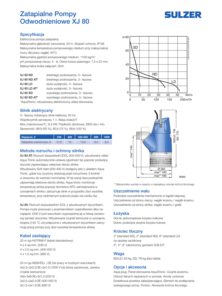 Zatapialne Pompy Odwodnieniowe XJ 80 Elektryczna pompa zatapialna. Maksymalna głębokość zanurzenia: 20 m. Stopień ochrony: IP 68. Maksymalna temperatura pompowanego medium przy maksymalnej mocy dla pracy ciągłej: 40°C. Maksymalna gęstość pompowanego medium: 1100 kg/m3. pH pompowanej cieczy: 5 - 8. Otwór kosza ssawnego: 7,5 x 22 mm. Maksymalna liczba załączeń: 30/h. m 80 XJ80-ND-AC/LD-AC/SD-AE 50Hz Specyfikacja SD 60 40 ND XJ 80 ND średniego podnoszenia, 3~ fazowa XJ 80 ND AT* średniego podnoszenia, 3~ fazowa XJ 80 LD duża wydajność, 3~ fazowa XJ 80 LD AT* duża wydajność, 3~ fazowa XJ 80 SD wysokiego podnoszenia, 3~ fazowa XJ 80 SD AT* wysokiego podnoszenia, 3~ fazowa *AquaTronic: wbudowany elektroniczny układ sterowania. 20 0 LD 0 0 10 20 50 30 40 100 50 60 l/s 200 m3/h 150 Silnik elektryczny 230 400 500-550 690 1000 Natężenie znamionowe, A 27,8 16 13,8 9,3 6,4 max** 444 Napięcie, V ND/LD: 746 SD: 775 3~ fazowy indukcyjny silnik klatkowy, 50 Hz. Współczynnik serwisowy 1.1. Klasa izolacji F. Moc znamionowa P2: 8,3 kW. Prędkość obrotowa: 2920 obr./ min. Sprawność: 89,9 (50 %), 90,6 (75 %), 89,6 (100 %) Metoda rozruchu i ochrony silnika XJ 80 AT: Rozruch bezpośredni (DOL 500-550 V), wbudowany układ Aqua Tronic automatycznie ustawia zgodność faz poprzez podwójny stycznik zapewniający właściwe obroty silnika. Wbudowany Soft start (230-400 V) dostępny jest z układem Aqua Tronic, gdzie trzy tyrystory redukują prąd rozruchowy 3-krotnie w stosunku do wartości nominalnej. W tej wersji dwa przekaźniki zapewniają właściwe obroty silnika. Aqua tronic monitoruje temperaturę silnika poprzez termistory NTC zainstalowane w uzwojeniach silnika i zatrzymuje silnik w przypadku zbyt wysokiej temperatury, przy nadmiernym poborze prądu lub zaniku faz. XJ 80: Rozruch bezpośrednim DOL z wbudowanym stycznikiem. Pompa może pracować z przemiennikiem częstotliwości albo na napięcie 1000 V pod warunkiem wyposażenia jej w listwę zaciskową zamiast stycznika. Wbudowane czujniki termiczne w uzwojeniu stojana (140 °C ±5) połączone z wbudowanym stycznikiem zatrzymują pracę pompy przy zbyt wysokiej temperaturze silnika. Kabel zasilający 20 m typ H07RN8-F (kabel standardowy): 4 x 4 sq.mm. (230 V) 4 x 2,5 sq.mm. (400-550 V) 4 x 1,5 sq.mm. (690 V) Ø 285 max** 440 max** 466 mm ** Maksymalny wymiar w oparciu o największy rozmiar króćca tłocznego. Uszczelnienie wału Podwójne uszczelnienie mechaniczne w kąpieli olejowej. Uszczelnienie od strony cieczy: węglik krzemu / węglik krzemu. Uszczelnienie od strony silnika: węglik krzemu / grafit. Łożyska Górne: jednorzędowe łożysko kulkowe Dolne: podwójne skośne łożysko kulowe Króciec tłoczny 3" (standard SD), 4" (standard ND), 6" (standard LD) na opaskę zaciskową 3", 4", 6" zakończony gwintem G/B.S.P. Waga ND/LD: 63 kg, SD: 78 kg (bez kabla) 20 m typ NSSHÖU.../3E (do pracy w trudnych warunkach): 3x2,5+3x2,5/3E+3x1,5 (1000 V lub listwa zaciskowa), zawiera 3 kable sterownicze 3x6+3x6/3E+3x1,5 (230 V) 3x2,5+3x2,5/3E (400-550 V) 3x1,5+3x1,5/3E (690 V) Opcje i akcesoria Aqua plug. Panel sterowania AquaTronic. Czujnik poziomu. Odczyt danych zapisanych w pompie. Anody cynkowe. Dodatkowa powłoka zabezpieczająca. Element do podłączenia szeregowego pomp. Ponton. Akcesoria króćca tłocznego. Kontrola pracy pompy Wykaz kontrolowanych parametrów XJ 80 XJ 80 AT AT AT + Czujnik poziomu AT + AquaPlug / Panel sterowania AquaTronic AT + AquaPlug / Panel sterowania AquaTronic + Czujnik poziomu Odczyt danych zapisanych w pompie Praca urządzenia X X X X X Zintegrowane wyposażenie startowe X X X X X X X X X X X X X X Ochrona silnika przy wys.natężeniu prądu X X X X X Ochrona silnika przy zanikaniu fazy X X X X X Automatyczne wykrywanie obrotów Ochrona silnika przy wys. temperaturze X Kontrola poziomu X X Ochrona silnika przed suchobiegiem X X Automatyczne wznowienie pracy pompy X X Zatrzymanie pracy pompy X Automatyczna praca i zatrzymanie X X Inf. o zawilgoceniu X X X Inf. o niskiej wartości rezystancji izolacji X X X Inf. o zbyt wysokim lub niskim napięciu XX XX X Inf. o przekroczeniu dop. temp. pracy XX XX X Inf. o przekroczeniu dop. natężenia prądu XX XX X Inf. o asymetrii napięcia XX XX X X X X Podłączenie kabla USB X X Inf. o 10 ostatnich zdarzeniach X Dokumentacja (lista części, instr. warsztatowa) X XX = Sygnalizacja awarii- pompa jest automatycznie zatrzymana w celu ochrony silnika. Wykonanie materiałowe Opis Materiał EN ASTM Elementy odlewane Aluminium EN 1706:AC-43100 ASTM AlSi10mg Kosz ssawny / Uchwyt Stal nierdzewna 10088:X5CrNi18-10 (1.4301) AISI 304 Wał Stal nierdzewna 10088:X20Cr13 (1.4021) AISI 420 Wirnik / Pierścień wymienny Żeliwo białe EN-GJN-HV600(XCr23) ASTM A 532: Alloy III A Elementy złączne Stal nierdzewna 10088:X5CrNiMo 17122 (1.4401) AISI 316 Części zużywające się / O-ringi Kauczuk nitrylowy Powłoka zabezpieczająca 2 skł. farba epoksydowa 120 µm www.sulzer.com XJ 80 50Hz pl (12.2016), Copyright © Sulzer Ltd 2016 Ten dokument nie zapewnia żadnego rodzaju rękojmi lub gwarancji. Wszelkich informacji dotyczących gwarancji i poręczeń możemy udzielić po otrzymaniu zapytania. Dokumentacja techniczno-ruchowa zostanie przekazana oddzielnie. Wszystkie informacje zawarte w niniejszym dokumencie mogą bez uprzedzenia ulec zmianie.