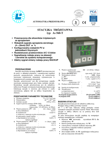AUTOMATYKA PRZEMYSŁOWA STACYJKA TRÓJSTAWNA typ As 560-T • Przeznaczona dla siłowników trójstawnych ze sprzężeniem • Wskaźnik sygnału sprzężenia zwrotnego (4 ÷ 20mA) OUT w % • Konfigurowalny wskaźnik PV w jednostkach fizycznych • Rozdzielczość przetworników A/C 12 bitów • Sygnalizacja rodzaju pracy na elewacji i zwrotnie do systemu komputerowego • Zdalny sygnał zmiany rodzaju pracy BACKUP PRZEZNACZENIE Stacyjka sterowania ręcznego As560-T przeznaczona jest do pracy w układach pomiarów i automatycznej regulacji procesów przemysłowych, zwłaszcza do rezerwowego sterowania trójstawnym elementem wykonawczym w komputerowych systemach automatyki. Stacyjka „przezroczysta” jest dla zewnętrznego sygnału sterowania automatycznego przy braku zasilania stacyjki. Konstrukcja stacyjki przystosowana jest do zabudowy tablicowej. Przyjęte rozwiązania konstrukcyjne dopuszczają lokalizację stacyjki w sterowni, jak również w szafie sterowniczej, pulpicie lub na tablicy bezpośrednio na obiekcie. PODSTAWOWE PARAMETRY TECHNICZNE 1. 2. 3. 4. Wymiary urządzenia 72 x 72 x 116,5 mm Wykrój tablicy 68 +0,7 x 68+0,7mm Zasilanie stacyjki 230Vac / 6VA Sygnał wyjściowy sterujący DOH i DOL: 24Vdc do 100mA - nominalny - dopuszczalny 12V÷80Vdc/ac do 500mA 5. Wejście pomiarowe „PV” (AI) 0/4 ÷ 20mA / 100Ω 0,25 % a. klasa dokładności b. rozdzielczość < 0,025 % c. różnicowe z separacją wysoko-rezystancyjną d. maksymalny sygnał wspólny ± 60V e. błąd dodatkowy od wartości 0,02% / V napięcia wspólnego 6. Wejście pomiarowe „OUT” (YI) 4 ÷ 20mA / 100Ω a. klasa dokładności 0,25 % b. rozdzielczość < 0,1 % c. różnicowe z separacją wysoko-rezystancyjną d. maksymalny sygnał wspólny ± 60V e. błąd dodatkowy od wartości 0,04% / V napięcia wspólnego 7. Wyjście sygnalizacyjne rodzaju pracy (DO) 8. Wejście BACKUP (BU) 9. Wyświetlacze cyfrowe a. „PV” b. „OUT” 10. Wyjście zasilania obiektowego „Uz” 11. Przyłącze kabli obiektowych 12. Interfejs do konfigurowania 13. Warunki pracy a. temperatura pracy b. wilgotność względna Wymagania bezpieczeństwa Wymagania EMC OC 4,5÷36Vdc / 100mA - typu zestyk 24V / 6mA LED - 10mm 4 cyfry, programowalny 3 cyfry, sygnał w [ % ] 24Vdc / 70mA 0,5÷1,5mm2 5 par rozłącznych zacisków RS232 0 ÷+65°C do 90% PN-EN 61010-1:2002 PN-EN 61000-6-1 PN-EN 61000-6-3 BUDOWA STACYJKI Stacyjka przystosowana jest do zabudowy tablicowej. Wymiary okna w tablicy powinny wynosić 68 +0,7 x 68+0,7mm. Zalecany odstęp pomiędzy osiami sąsiednich wykrojów powinien wynosić 76mm. Mocowanie stacyjki w tablicy odbywa się za pomocą dwu śrub dociskowych. W polu elewacyjnym stacyjki znajdują się następujące elementy manipulacyjne i wskaźniki: • Klawisze ◄► sterowania stycznikami H / L dla rodzaju pracy M • klawisz przełączenia rodzaju pracy A / M • czterocyfrowy wskaźnik wielkości mierzonej PV • trzycyfrowy wskaźnik wielkości sprzężenia zwrotnego OUT • dwie lampki (LED) A i M sygnalizujące rodzaj pracy • pole na oznaczenie obwodu PiA Na tylnej płycie stacyjki znajduje się 5 par + 5 rozłącznych zacisków do podłączenia kabli obiektowych, złącze interfejsu RS232, kabel zasilania sieciowego. PV do PLC OPIS DZIAŁANIA DO PLC A _ Stan braku zasilania stacyjki: Przy braku zasilania stacyjki, sygnały sterowania automatycznego DIH / DIL podawane są na wyjście DOH/DOL, a wszystkie wskaźniki i przełączniki są nieaktywne. A/M + Automatyczny rodzaj pracy A: – zewnętrzne sygnały sterujące DIH / DIL podawane są na wyjście DOH / DOL, klawisze ◄ ► są nieaktywne. Ręczny rodzaj pracy M: – na wyjścia DOH / DOL podawany jest sygnał sterujący cewkami styczników elementu wykonawczego. Przyciśnięcie klawisza ◄ lub ► powoduje wysterowanie odpowiedniej cewki stycznika. Kierunek sterowania strzałkami ◄ ► można odwrócić programowo. Rodzaj pracy sygnalizowany jest lampkami A i M na elewacji stacyjki oraz zwrotnie do systemu cyfrowego przez wyjście dwustanowe DO. Wejście BU umożliwia zdalne przełączenie stacyjki na rodzaj pracy M. Na wyświetlaczu OUT wyświetlany jest zawsze sygnał z nadajnika położenia elementu wykonawczego. Sygnał wyświetlany jest w % wprost lub odwrotnie (parametr programowalny). Dolna najmniej znacząca kropka wyświetlacza sygnalizuje działanie stycznika DOL. Górna najbardziej znacząca kropka sygnalizuje działanie stycznika DOH. Jednoczesne miganie obu kropek sygnalizuje brak podłączenia styczników, lub brak ich zasilania. Wciśnięcie jednoczesne klawiszy ◄ ► w rodzaju pracy A pozwala na odczytanie zaprogramowanych parametrów stacyjki P1÷P7. Wciśnięcie klawisza A/M powoduje odczyt następnego parametru. Wciśniecie klawisza ► powoduje powrót do normalnego trybu pracy stacyjki. Czterocyfrowy wskaźnik umożliwia wyświetlanie wielkości mierzonej w jednostkach fizycznych. Jej zakresy oraz położenie kropki kodowane są w programie. BW H z PLC DIH BW BW PLC DOH M BU DOL OUT BW - biegun wspólny PLC - sterownik do PLC Schemat ideowy stacyjki. stycznik H AS560-T DIH DOH BW DOL DIL stycznik zasilanie L DOH DOL BW masa zasilania PLC Typowy przykład podłączenia styczników sterujących. PARAMETRY KONFIGUROWANE W PROGRAMIE AsSETUP: • Dolny zakres wielkości mierzonej PV: „-999”...„+9999” • Górny zakres wielkości mierzonej PV: „-999”...„+9999” • Położenie kropki wyświetlacza: 0 – bez kropki ; 1 – XXX.X ; 2 – XX.XX ; 3 – X.XXX • Współczynnik filtracji sygnału PV (stała czasowa) 0 – bez filtracji 2 – 1 sek. 4 – 4 sek. 6 – 16 sek. 8 – 64 sek. 1 – 0,5 sek. 3 – 2 sek. 5 – 8 sek. 7 – 32 sek. • Sygnalizacja stanu pracy wyjścia dwustanowego 0 – aktywny OC sygnalizuje M 1 – aktywny OC sygnalizuje A • Odwracanie sposobu wyświetlania sygnału sprzężenia zwrotnego 0 – sygnał wyświetlany wprost 1 – sygnał odwrotny (4mA = 100% , 20mA = 0%) • Odwracanie k