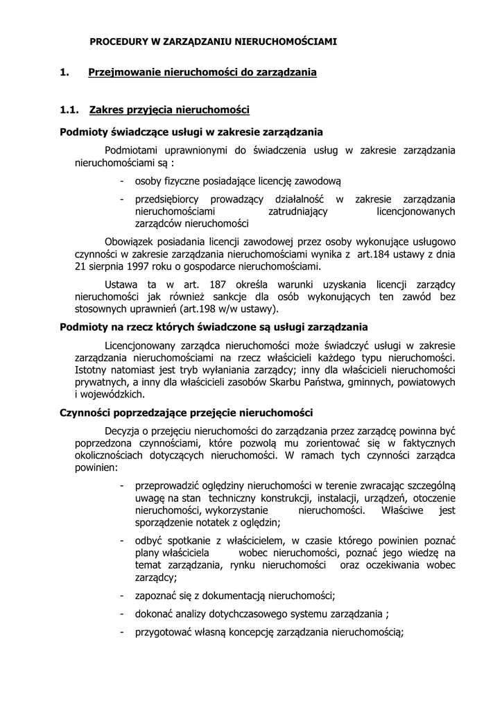 PROCEDURY W ZARZĄDZANIU NIERUCHOMOŚCIAMI 1. Przejmowanie nieruchomości do zarządzania 1.1. Zakres przyjęcia nieruchomości Podmioty świadczące usługi w zakresie zarządzania Podmiotami uprawnionymi do świadczenia usług w zakresie zarządzania nieruchomościami są : - osoby fizyczne posiadające licencję zawodową - przedsiębiorcy prowadzący działalność w nieruchomościami zatrudniający zarządców nieruchomości zakresie zarządzania licencjonowanych Obowiązek posiadania licencji zawodowej przez osoby wykonujące usługowo czynności w zakresie zarządzania nieruchomościami wynika z art.184 ustawy z dnia 21 sierpnia 1997 roku o gospodarce nieruchomościami. Ustawa ta w art. 187 określa warunki uzyskania licencji zarządcy nieruchomości jak również sankcje dla osób wykonujących ten zawód bez stosownych uprawnień (art.198 w/w ustawy). Podmioty na rzecz których świadczone są usługi zarządzania Licencjonowany zarządca nieruchomości może świadczyć usługi w zakresie zarządzania nieruchomościami na rzecz właścicieli każdego typu nieruchomości. Istotny natomiast jest tryb wyłaniania zarządcy; inny dla właścicieli nieruchomości prywatnych, a inny dla właścicieli zasobów Skarbu Państwa, gminnych, powiatowych i wojewódzkich. Czynności poprzedzające przejęcie nieruchomości Decyzja o przejęciu nieruchomości do zarządzania przez zarządcę powinna być poprzedzona czynnościami, które pozwolą mu zorientować się w faktycznych okolicznościach dotyczących nieruchomości. W ramach tych czynności zarządca powinien: - przeprowadzić oględziny nieruchomości w terenie zwracając szczególną uwagę na stan techniczny konstrukcji, instalacji, urządzeń, otoczenie nieruchomości, wykorzystanie nieruchomości. Właściwe jest sporządzenie notatek z oględzin; - odbyć spotkanie z właścicielem, w czasie którego powinien poznać plany właściciela wobec nieruchomości, poznać jego wiedzę na temat zarządzania, rynku nieruchomości oraz oczekiwania wobec zarządcy; - zapoznać się z dokumentacją nieruchomości; - dokonać analizy dotychczasowego systemu zarządzania ; - przygotować własną koncepcję zarządzania nieruchomością; PROCEDURY W ZARZĄDZANIU NIERUCHOMOŚCIAMI - przygotować, wynegocjować i podpisać umowę o zarządzanie; - przygotować protokół przejęcia nieruchomości. Umowa o zarządzanie jako czynność w procesie przejęcia nieruchomości Zawarcie umowy na zarządzanie nieruchomością jest podstawą do realnego przejęcia nieruchomości do zarządzania. Umowa o zarządzanie powinna być obszerna, szczegółowa a nawet zawierać zapisy dotyczące sytuacji hipotetycznych. Szczegółowe określenie stosunków pomiędzy zarządcą a właścicielem leży w interesie obydwu stron, gdyż w przypadku wystąpienia różnic zdań na tle wykonywanych obowiązków przez zarządcę, będzie ona podstawą rozstrzygającą spór. Umowa powinna określać warunki przejęcia nieruchomości oraz jej przekazania w przypadku zakończenia działalności zarządcy. Po jej podpisaniu zarządca przejmujący nieruchomość sporządza protokół przejęcia nieruchomości a następnie przystępuje do wykonywania czynności przejęcia nieruchomości. 1.2. Zakres i forma protokołu przejęcia nieruchomości Właściwe określenie stron w protokole przejęcia nieruchomości Właściwe określenie stron umowy jest niezbędne ze względu na ważność dokumentów, co wynika z przepisów Kodeksu Cywilnego. Ze strony właściciela, przekazania nieruchomości dokonuje bezpośrednio on sam lub upoważniona przez niego osoba prawna lub fizyczna. Podobnie strona przejmująca powinna dokonywać przejęcia bezpośrednio lub na podstawie pełnomocnictw. W przypadku osób prowadzących działalność gospodarczą powinna być właściwie zapisana reprezentacja – zgodnie z aktami prawnymi regulującymi ich działalność. Opis nieruchomości nieruchomości przejmowanej w oparciu o źródła informacji o Podstawowymi źródłami informacji o stanie prawnym nieruchomości są: - księgi wieczyste; - ewidencja gruntów i budynków. Informacje podane w tej części protokołu dotyczą: - właściciela lub właścicieli nieruchomości; - sądu i numeru księgi wieczystej nieruchomości; - obręb, numer i powierzchni działki; - podstawowe parametry użytkowe nieruchomości. Opis nieruchomości w oparciu o dokumentację techniczną Potrzebne informacje o stanie technicznym nieruchomości zawarte są w prawidłowo prowadzonej książce obiektu budowlanego jak również dokumentacji technicznej. W oparciu o te dokumenty dokonywany jest opis poszczególnych elementów budynku oraz wyposażenia technicznego. Z dokumentów tych uzyskuje się informacje o przeprowadzanych w nieruchomości remontach, inwestycjach, PROCEDURY W ZARZĄDZANIU NIERUCHOMOŚCIAMI obowiązkowych przeglądach i kontrolach stanu technicznego obiektu i jego elementów. Informacje zawarte w tej części protokołu dotyczą: - roku rozpoczęcia i zakończenia budowy; - daty odbioru i oddania do użytkowania obiektu; - system konstrukcyjno-materiałowy konstrukcyjnych, stropów i dachu; - rodzaju posadzek, schodów, tynków wewnętrznych, stolarki itp. - rodzaju urządzeń technicznych stanowiących wyposażenie budynku itp. fundamentów, ścian Opis nieruchomości w oparciu o inwentaryzację w terenie Informacje w tej części protokołu dotyczą : - wykaz urządzeń urządzeniach; pomiarowych z wartością wskazań na tych - wykazu pomieszczeń z ich opisem; - inne informacje będące następstwem przeglądu nieruchomości w terenie. Wykazy przejętej dokumentacji nieruchomości: o prawnej (ewidencje lokali, najemców, właścicieli, umowy na dostawy, usługi, najmu dzierżawy, regulaminy, dopuszczenie nieruchomości do użytkowania, itd.) o technicznej (książka obiektu, dokumentacja techniczna) o finansowej (ewidencje finansowe, sprawozdawczość finansowa itd.). zaświadczenie o NIP, RE