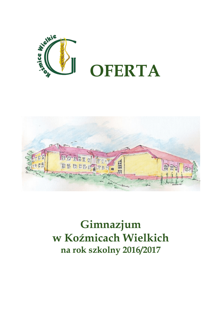 OFERTA Gimnazjum w Koźmicach Wielkich na rok szkolny 2016/2017 PROPOZYCJE KLAS Klasa DSD ─ drugim językiem obowiązkowym jest niemiecki w wymiarze 6 godzin tygodniowo (intensywna nauka j. niemieckiego zakończona uzyskaniem certyfikatu DSD). Doskonalenie umiejętności językowych odbywa się m.in. poprzez wyjazdy zagraniczne. 36 uczniów naszego gimnazjum wzięło udział w projekcie językowo- edukacyjnym, który był realizowany w terminie 26 IX – 3 X 2015 r. w Niemczech, Belgii i Holandii. Uczestnicy projektu dużo zwiedzili, nabyli nowe wiadomości, a co najważniejsze rozwinęli swoje umiejętności językowe. Nawiązana została wymiana ze szkołą niemiecką. W październiku 2016 r. Będziemy gościć uczniów z Berlina, a w maju 2017 r. młodzież naszego gimnazjum uda się z rewizytą do Niemiec. Klasa z drugim językiem niemieckim jako obowiązkowym w wymiarze dwóch godzin tygodniowo. Klasa z drugim językiem hiszpańskim jako obowiązkowym w wymiarze dwóch godzin tygodniowo. Klasa z możliwością zwiększenia ilości godzin z informatyki (w przypadku odpowiedniej ilości osób zainteresowanych). Klasa integracyjna ─ z nauczycielem wspomagającym (maksymalnie 20 uczniów, w tym do 5 z orzeczeniem o potrzebie kształcenia specjalnego). Gimnazjum w Koźmicach Wielkich 2016 PROPONUJEMY Bogatą, ciekawą, dostosowaną do potrzeb uczniów ofertę bezpłatnych zajęć pozalekcyjnych, m.in.: zajęcia sportowo-rekreacyjne na terenie szkoły i poza szkołą prowadzone przez nauczycieli - trenerów, instruktorów (m.in.: lekka atletyka, piłka koszykowa, piłka siatkowa, piłka ręczna, piłka nożna, tenis stołowy, badminton, szachy), liczne koła przedmiotowe, w tym: polonistyczne, historyczne, biologiczne, geograficzne, chemiczne, fizyczne, informatyczne, zajęcia rozwijające i hiszpański), zajęcia uzdolnienia przygotowujące przedmiotów objętych do językowe egzaminu egzaminem, w (język angielski, gimnazjalnego tym niemiecki ze wszystkich indywidualne konsultacje z nauczycielami, zajęcia rozwijające możliwości twórcze i uzdolnienia: teatr szkolny, chór, młodzieżowe centrum dziennikarstwa, koło artystyczno-kulturalne, koło fotograficzne, koło recytatorsko- teatralno- filmowe, koło prac ręcznych, koło filmowe, koło taneczne, koło wokalno-instrumentalne, internetową platformę edukacyjną, która w sposób atrakcyjny wspomaga nauczanie dziecka w domu, przygotowanie do lekcji, pracę wyrównawczą z uczniami mającymi problemy w nauce oraz z różnego typu dysfunkcjami, zajęcia terapii pedagogicznej i rewalidacyjne – prowadzone przez nauczycieli specjalistów, opiekę przed lekcjami i po lekcjach, którą zapewnia świetlica szkolna. Podczas przebywania w świetlicy szkolnej (również w czasie długich przerw) uczniowie mają do wykorzystania: komputery z dostępem do Internetu, bilard stołowy, piłkarzyki stołowe, różnorodne gry planszowe. Gimnazjum w Koźmicach Wielkich 2016 ZAPEWNIAMY kadrę nauczycielską o wysokich kwalifikacjach, stałą i specjalistyczną opiekę pedagogiczną, różnorodne, nowoczesne metody nauczania (z wykorzystaniem technologii informacyjnych), naukę języków obcych (angielskiego, niemieckiego, hiszpańskiego) w nowoczesnej pracowni językowej, intensywną pracę z uczniami zdolnymi, możliwość udziału w projektach realizowanych przy współpracy z partnerami szkoły (NBP, WBK, BS), fachowe przygotowanie do konkursów przedmiotowych i tematycznych, możliwość uczestniczenia w różnorodnych, ciekawych projektach edukacyjnych, bibliotekę z centrum multimedialnym (możliwość korzystania z Internetu), nowoczesną, pełnowymiarową salę gimnastyczną, możliwość uczestniczenia w wycieczkach turystycznych i edukacyjnych, możliwość korzystania ze stołówki szkolnej, możliwość kontroli frekwencji i postępów dziecka w dzienniku elektronicznym, bogate wyposażenie pracowni przedmiotowych w sprzęt i pomoce, zestawy multimedialne w każdej sali, bezpłatne dowozy. Gimnazjum w Koźmicach Wielkich 2016 DORADZTWO ZAWODOWE W ramach innowacji pedagogicznej we wszystkich klasach proponujemy zajęcia i konsultacje z doradcą zawodowym. „Mój wybór – moja przyszłość” Jak pomóc uczniom zaplanować własną karierę edukacyjno – zawodową? Zajęcia mają na celu podniesienie u uczniów zdolności do podejmowania właściwych decyzji dotyczących dalszej edukacji oraz zdolności do przyszłego zatrudnienia zgodnie z posiadanymi predyspozycjami. Corocznie w naszej szkole organizowane są Targi Edukacyjne, podczas których szkoły ponadgimnazjalne prezentują swoją ofertę edukacyjną naszym uczniom i ich rodzicom. Uczniowie klas III uczestniczą w Festiwalu Zawodów. POSIADAMY CERTYFIKATY Certyfikat „Szkoły z klasą” Certyfikat „Szkoła promująca bezpieczeństwo” Certyfikat Polskiego Towarzystwa Dysleksji za realizację programu edukacyjno-terapeutycznego „Ortograffiti” Certyfikat kampanii „Zachowaj trzeźwy umysł” Certyfikat „Szkoła odkrywców talentów” Certyfikat „WF z klasą” Gimnazjum w Koźmicach Wielkich 2016 UCZNIOWIE NASZEJ SZKOŁY MAJĄ NA SWOIM KONCIE SZEREG ZNACZĄCYCH SUKCESÓW, M.IN.: są laureatami lub finalistami wojewódzkich konkursów przedmiotowych (laureaci zwolnieni są z określonej części egzaminu gimnazjalnego i są przyjmowani do wybranych przez siebie szkół ponadgimnazjalnych w pierwszej kolejności), zdobywają medale w powiatowych i wojewódzkich zawodach sportowych w różnych dyscyplinach, uczestniczą w etapach ogólnopolskich różnego typu konkursów, I miejsce w konkursie ogólnopolskim „Nakręceni na czytanie” organizowanym przez MEN, wysoki przyrost wiedzy naszych uczniów badany egzaminem gimnazjalnym, potwierdzony dodatnimi wynikami EWD (edukacyjnej wartości dodanej), udział grup artystycznych (tanecznych, recytatorskich), w konkursach, pokazach i występach. Gimnazjum w Koźmicach Wielkich 2016 UCZNIOWIE NASZEGO GIMNAZJUM ucz