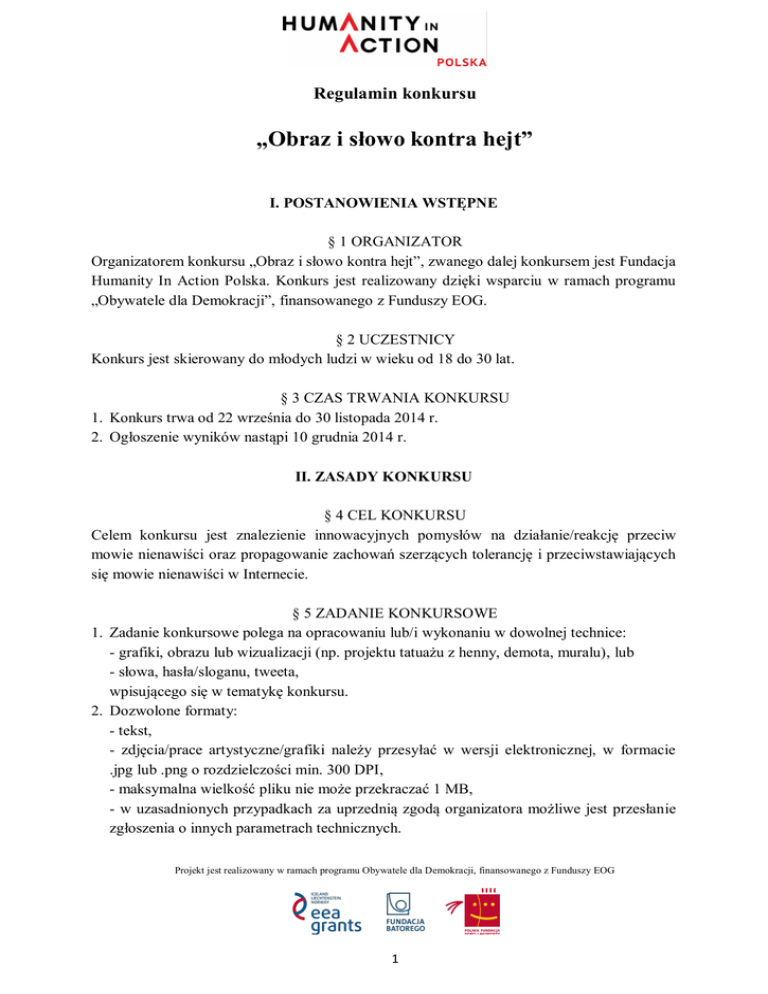 Regulamin konkursu „Obraz i słowo kontra hejt” I. POSTANOWIENIA WSTĘPNE § 1 ORGANIZATOR Organizatorem konkursu „Obraz i słowo kontra hejt”, zwanego dalej konkursem jest Fundacja Humanity In Action Polska. Konkurs jest realizowany dzięki wsparciu w ramach programu „Obywatele dla Demokracji”, finansowanego z Funduszy EOG. § 2 UCZESTNICY Konkurs jest skierowany do młodych ludzi w wieku od 18 do 30 lat. § 3 CZAS TRWANIA KONKURSU 1. Konkurs trwa od 22 września do 30 listopada 2014 r. 2. Ogłoszenie wyników nastąpi 10 grudnia 2014 r. II. ZASADY KONKURSU § 4 CEL KONKURSU Celem konkursu jest znalezienie innowacyjnych pomysłów na działanie/reakcję przeciw mowie nienawiści oraz propagowanie zachowań szerzących tolerancję i przeciwstawiających się mowie nienawiści w Internecie. § 5 ZADANIE KONKURSOWE 1. Zadanie konkursowe polega na opracowaniu lub/i wykonaniu w dowolnej technice: - grafiki, obrazu lub wizualizacji (np. projektu tatuażu z henny, demota, muralu), lub - słowa, hasła/sloganu, tweeta, wpisującego się w tematykę konkursu. 2. Dozwolone formaty: - tekst, - zdjęcia/prace artystyczne/grafiki należy przesyłać w wersji elektronicznej, w formacie .jpg lub .png o rozdzielczości min. 300 DPI, - maksymalna wielkość pliku nie może przekraczać 1 MB, - w uzasadnionych przypadkach za uprzednią zgodą organizatora możliwe jest przesłanie zgłoszenia o innych parametrach technicznych. Projekt jest realizowany w ramach programu Obywatele dla Demokracji, finansowanego z Funduszy EOG 1 § 6 KRYTERIA OCENY 1. Ocenie będzie podlegać: - wartość merytoryczna, - oryginalność pomysłu w zakresie treści i formy, - estetyka wykonania. 1. 2. 3. 4. 1. 2. 3. 4. § 7 PRZEBIEG KONKURSU Warunkiem udziału w konkursie jest wysłanie zadania konkursowego poprzez elektroniczny formularz konkursowy podany przez organizatora w terminie do 30 listopada 2014 r. Do konkursu można zgłaszać wyłącznie prace dotąd nigdzie nie publikowane, nie nagrodzone i nie wyróżnione w innych konkursach. Organizator nie bierze odpowiedzialności za naruszenie praw autorskich przez uczestników konkursu. Odpowiedzialność ta spoczywa wynika tylko i wyłącznie na uczestnikach konkursu. Rozstrzygnięcie konkursu nastąpi w dniu 10 grudnia 2014 r. Oficjalne ogłoszenie wyników konkursu nastąpi 10 grudnia 2014 r. § 8 NAGRODY Jury konkursu wybiera zwycięskie prace, wyłonione w wyniku głosowania członków Jury. Zwycięskie prace mogą zdobyć pierwsze, drugie, trzecie miejsce lub wyróżnienie. Nagrodami konkursu są 4 tablety multimedialne. Jury może podjąć decyzję o nagrodzeniu większej ilości prac i przyznaniu dodatkowych nagród. III. ODPOWIEDZIAŁNOŚĆ ORGANIZATORA § 9 OPŁATY I PODATKI Organizator nie ponosi odpowiedzialności za jakiekolwiek ewentualne opłaty i podatki, do uiszczenia, których mogą być zobowiązani zwycięzcy konkursu. § 10 ODPOWIEDZIALNOŚĆ ZA PRZESYŁKI POCZTOWE Organizator nie ponosi odpowiedzialności za doręczenia i terminowość korespondencji wysyłanej za pomocą poczty, formularza elektronicznego lub poczty elektronicznej. § 11 DECYZJE JURY 1. Decyzje Jury są ostateczne i nie przysługuje od nich odwołanie. Projekt jest realizowany w ramach programu Obywatele dla Demokracji, finansowanego z Funduszy EOG 2 2. Jury może zrezygnować z przyznania którejkolwiek z nagród w przypadku, gdy uzna, że przedstawione prace nie spełniają wymagań konkursowych. 3. Opinie Jury o poszczególnych pracach nie będą udostępniane. IV. POSTANOWIENIA KOŃCOWE 1. 2. 3. 4. § 12 Wszelkie materiały związane z konkursem, w tym prace konkursowe, przekazane Organizatorowi przez uczestników konkursu nie podlegają zwrotowi. Z chwilą przekazania zadania konkursowego Organizatorowi, uczestnik konkursu przenosi na Organizatora prawo własności wraz z prawami autorskimi. Organizator zastrzega sobie prawo do rozpowszechniania prac konkursowych w mediach (prasie, radiu i telewizji, Internecie) i w innych materiałach promocyjnych konkursu opracowywanych przez Organizatora oraz Operatora Programu „Obywatele dla Demokracji”, jak również materiałach edukacyjnych. Organizator zastrzega sobie prawo do opublikowania imion, nazwisk, zdjęć i innych informacji o zwycięzcach konkursu na stronach internetowych, blogach, newsletterze, stronie na serwisie Facebook oraz Twitter Fundacji Humanity In Action Polska oraz Operatora Programu „Obywatele dla Demokracji”, a także w innych mediach. Poprzez zgłoszenie Organizatorowi chęci udziału w konkursie uczestnik wyraża zgodę na publikacje określone w § 12. § 13 We wszystkich sprawach nieuregulowanych w niniejszym Regulaminie zastosowanie mają przepisy Kodeksu Cywilnego, Ustawy o ochronie danych osobowych oraz Ustawy o prawie autorskim i prawach pokrewnych. § 14 Przystąpienie i udział w konkursie oraz wyrażenie zgody na przetwarzanie danych osobowych oznacza akceptację warunków niniejszego Regulaminu. § 15 Organizator zastrzega sobie możliwość zmiany postanowień Regulaminu. Projekt jest realizowany w ramach programu Obywatele dla Demokracji, finansowanego z Funduszy EOG 3