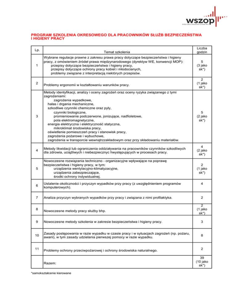 PROGRAM SZKOLENIA OKRESOWEGO DLA PRACOWNIKÓW SŁUŻB BEZPIECZEŃSTWA I HIGIENY PRACY Lp. Temat szkolenia Liczba godzin Wybrane regulacje prawne z zakresu prawa pracy dotyczące bezpieczeństwa i higieny pracy, z omówieniem źródeł prawa międzynarodowego (dyrektyw WE, konwencji MOP): przepisy dotyczące bezpieczeństwa i higieny pracy, przepisy dotyczące ochrony pracy kobiet i młodocianych, problemy związane z interpretacją niektórych przepisów. 5 (3 jako sk*) 2 Problemy ergonomii w kształtowaniu warunków pracy. 2 (1 jako sk*) 3 Metody identyfikacji, analizy i oceny zagrożeń oraz oceny ryzyka związanego z tymi zagrożeniami: zagrożenia wypadkowe, hałas i drgania mechaniczne, szkodliwe czynniki chemiczne oraz pyły, czynniki biologiczne, promieniowanie podczerwone, jonizujące, nadfioletowe, pola elektromagnetyczne, energia elektryczna i elektryczność statyczna, mikroklimat środowiska pracy, oświetlenie pomieszczeń pracy i stanowisk pracy, zagrożenia pożarowe i wybuchowe, zagrożenia w transporcie wewnątrzzakładowym oraz przy składowaniu materiałów. 5 (2 jako sk*) 4 Metody likwidacji lub ograniczenia oddziaływania na pracowników czynników szkodliwych dla zdrowia, uciążliwych i niebezpiecznyc hwystępujących w procesach pracy. 4 (2 jako sk*) 5 Nowoczesne rozwiązania techniczno - organizacyjne wpływające na poprawę bezpieczeństwa i higieny pracy, w tym: urządzenia wentylacyjno-klimatyzacyjne, urządzenia zabezpieczające, środki ochrony indywidualnej. 2 (1 jako sk*) 6 Ustalenie okoliczności i przyczyn wypadków przy pracy (z uwzględnieniem programów komputerowych). 4 7 Analiza przyczyn wybranych wypadków przy pracy i związana z nimi profilaktyka. 2 1 8 Nowoczesne metody pracy służby bhp. 2 (1 jako sk*) 9 Nowoczesne metody szkolenia w zakresie bezpieczeństwa i higieny pracy. 3 10 Zasady postępowania w razie wypadku w czasie pracy i w sytuacjach zagrożeń (np. pożaru, awarii), w tym zasady udzielania pierwszej pomocy w razie wypadku. 8 11 Problemy ochrony przeciwpożarowej i ochrony środowiska naturalnego. Razem: *samokształcenie kierowane 2 39 (10 jako sk*)