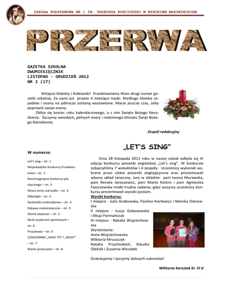SZKOŁA PODSTAWOWA NR 1 IM. TADEUSZA KOŚCIUSZKI W WYSOKIEM MAZOWIECKIEM GAZETKA SZKOLNA DWUMIESIĘCZNIK LISTOPAD - GRUDZIEŃ 2012 NR 2 (17) Witajcie Koledzy i Koleżanki! Przedstawiamy Wam drugi numer gazetki szkolnej. Za nami już prawie 4 miesiące nauki. Niedługo klamka zapadnie i oceny na półrocze zostaną wystawione. Macie jeszcze czas, żeby poprawić swoje oceny. Zbliża się koniec roku kalendarzowego, a z nim Święta Bożego Narodzenia. Życzymy wesołych, pełnych wiary i rodzinnego klimatu Świąt Bożego Narodzenia. Zespół redakcyjny W numerze: Let’s sing – str. 1 Wojewódzkie Konkursy Przedmiotowe – str. 2 Rozstrzygnięcie konkursu plastycznego – str. 3 Wiara mnie uskrzydla – str. 3 Mikołajki – str. 4 Dyskoteka andrzejkowa – str. 4 Zabawy matematyczne – str. 5 Warto obejrzeć – str. 5 Skrót wydarzeń sportowych – str. 6 Przysłowia – str. 6 CZASOWNIKI „HAVE TO” I „MUST” – str. 7 Warto przeczytać – str. 8 „LET’S SING” Dnia 28 listopada 2012 roku w naszej szkole odbyła się IV edycja konkursu piosenki angielskiej „Let’s sing”. W konkursie zobaczyliśmy 7 wokalistów i 4 zespoły. Uczestnicy wykonali wybrane przez siebie piosenki anglojęzyczne oraz prezentowali własny układ taneczny. Jury w składzie: pani Iwona Murawska, pani Renata Jaroszewicz, pani Marta Kostro i pani Agnieszka Faszczewska miało trudne zadanie, gdyż wszyscy uczestnicy konkursu prezentowali wysoki poziom. Wyniki konkursu: I miejsce - Julia Grabowska, Paulina Kierlewicz i Monika Ostrowska II miejsce - Łucja Gołaszewska i Alicja Parmańczuk III miejsce - Natalia Wojciechowska Wyróżnienia: Anna Wojciechowska Wiktoria Mruszczyk Natalia Przychodzeń, Klaudia Oleksik i Zuzanna Wiczołek Gratulujemy i życzymy dalszych sukcesów! Wiktoria Korszlak kl. VI d SZKOŁA PODSTAWOWA NR 1 IM. TADEUSZA KOŚCIUSZKI W WYSOKIEM MAZOWIECKIEM PRZERWA – GAZETKA SZKOLNA NR 2 (17) WOJEWÓDZKIE KONKURSY PRZEDMIOTOWE W dniach 19.11.2012r. - 03.12.2012r. w naszej szkole w odbyły się Wojewódzkie Konkursy Przedmiotowe – etap szkolny z następujących przedmiotów: język polski, język angielski, matematyka, historia, przyroda, informatyka. Do etapu rejonowego zakwalifikowały się następujące osoby: z języka polskiego: 1. Grodzka Aleksandra – kl. VI c 2. Gołaszewska Maryla – kl. VI d 3. Biała Weronika – kl. VI d 4. Kaliszczyk Karolina – kl. VI e 5. Brzósko Patrycja – kl. VI b 6. Motybel Anna – kl. VI a z języka angielskiego: 1. Grodzka Aleksandra – kl. VI c 2. Biała Weronika – kl. VI d 3. Kaliszczyk Karolina – kl. VI e 4. Kierlewicz Paulina – VI b z historii: 1. Wróblewski Jakub – kl. VI e 2. Kaliszczyk Karolina – kl. VI e 3. Grodzka Aleksandra – kl. VI c 4. Nowak Bartłomiej – kl. VI b 5. Kalinowski Konrad – kl. VI c z przyrody: 1. Motybel Anna – kl. VI a 2. Grodzka Aleksandra – kl. VI c 3. Biała Weronika – kl. VI d 4. Stypułkowska Sylwia – kl. VI e 5. Ogrodnik Magdalena – kl. VI a 6. Kaliszczyk Karolina – kl. VI e z matematyki: 1. Grodzka Aleksandra – kl. VI c 2. Kaczyński Andrzej – kl. V c 3. Ogrodnik Magdalena – kl. VI a 4. Górski Jakub – kl. VI z informatyki: 1. Grodzka Aleksandra – kl. VI c 2. Buczyński Jakub – kl. VI c 3. Socik Jakub – kl. VI c 4. Różański Marcin – kl. V c 5. Żebrowski Jakub – kl. V c Gratulujemy i życzymy powodzenia na etapie rejonowym! Zespół redakcyjny 2|Strona SZKOŁA PODSTAWOWA NR 1 IM. TADEUSZA KOŚCIUSZKI W WYSOKIEM MAZOWIECKIEM PRZERWA – GAZETKA SZKOLNA NR 2 (17) ROZSTRZYGNIĘCIE KONKURSU PLASTYCZNEGO SZCZEBLA POWIATOWEGO O TEMATYCE POŻARNICZEJ „ZAPOBIEGAJMY POŻAROM” 7 grudnia 2012 roku w Komendzie Powiatowej PSP w Wysokiem Mazowieckiem rozstrzygnięto kolejną edycję ogólnopolskiego konkursu plastycznego o tematyce pożarniczej „Zapobiegajmy pożarom”. Na konkurs wpłynęło ogółem 98 prac z wszystkich miast i gmin powiatu wysokomazowieckiego. Miło nam poinformować, że z naszej szkoły zostały nagrodzone następujące osoby: w II grupie wiekowej – kl. I - III: I miejsce – Gabriela Kaczyńska wyróżnienie – Anna Kosieradzka Nagrodzone i wyróżnione prace będą reprezentowały nasz powiat na etapie wojewódzkim konkursu. Trzymamy kciuki i życzymy powodzenia! Zespół redakcyjny WIARA MNIE USKRZYDLA Dnia 6 grudnia 2012 roku w Centrum Kultury przy Szkołach Katolickich w Łomży odbyło się uroczyste wręczenie nagród uczniom z terenu naszej diecezji, którzy wzięli udział w konkursie „Wiara mnie uskrzydla”. W uroczystej gali uczestniczył Biskup Łomżyński Janusz Stepnowski oraz Wicekurator Kuratorium Oświaty w Białymstoku pani Wiesława Ćwiklińska. Na konkurs wpłynęło 266 prac, a wśród wyróżnionych znalazły się prace dziewcząt z naszej szkoły: Magdaleny Zalewskiej z kl. II b i Natalii Wojciechowskiej z kl. VI d. Julia Grabowska zajęła I miejsce w kategorii muzycznej. Jej utwór wybrano spośród 28 utworów nadesłanych na konkurs. Podczas gali wręczenia nagród naszym uczennicom towarzyszyły pani dyrektor Małgorzata Koc i siostra Lilianna. Zespół redakcyjny 3|Strona SZKOŁA PODSTAWOWA NR 1 IM. TADEUSZA KOŚCIUSZKI W WYSOKIEM MAZOWIECKIEM PRZERWA – GAZETKA SZKOLNA NR 2 (17) MIKOŁAJKI 6 grudnia jest to dzień lubiany przez wszystkie dzieci, a nawet przez dorosłych. Dostajemy w tym dniu przeróżne dary. W naszej szkole również obchodzone były Mikołajki. Wszystkie klasy odwiedził „najzupełniej prawdziwy” Mikołaj, któremu towarzyszyły dwie śnieżynki. Każdemu uczniowi podarował on drobny upominek, którym była słodka czekolada. Najfajniejszym punktem programu była możliwość zrobienia zdjęcia z brodatym panem. Dodatkowo w większości klas dzieci nawzajem wymieniały się prezentami. W tym wyjątkowym dniu każdy zasługuje na paczkę, a w szczególności św. Mikołaj. Zadajecie sobie teraz pytanie dlaczego Mikołaj? Chyba popełnili tu jakiś błąd? Ależ nie! To jest p