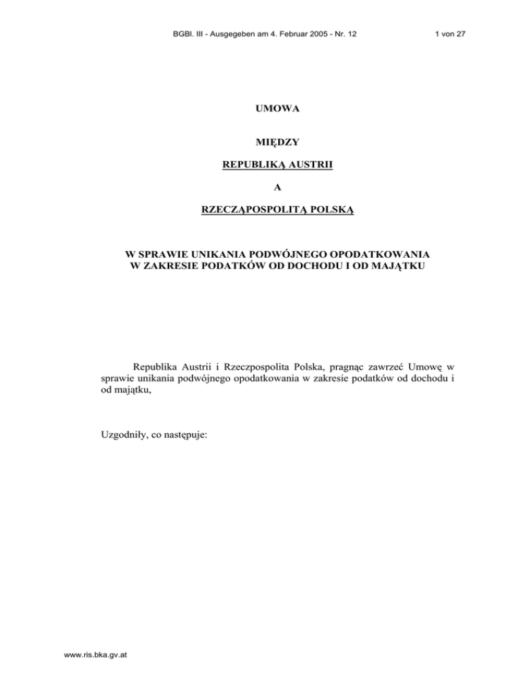 BGBl. III - Ausgegeben am 4. Februar 2005 - Nr. 12 1 von 27 UMOWA MIĘDZY REPUBLIKĄ AUSTRII A RZECZĄPOSPOLITĄ POLSKĄ W SPRAWIE UNIKANIA PODWÓJNEGO OPODATKOWANIA W ZAKRESIE PODATKÓW OD DOCHODU I OD MAJĄTKU Republika Austrii i Rzeczpospolita Polska, pragnąc zawrzeć Umowę w sprawie unikania podwójnego opodatkowania w zakresie podatków od dochodu i od majątku, Uzgodniły, co następuje: www.ris.bka.gv.at BGBl. III - Ausgegeben am 4. Februar 2005 - Nr. 12 2 von 27 2 Artykuł 1 ZAKRES PODMIOTOWY Niniejsza Umowa dotyczy osób mających miejsce zamieszkania lub siedzibę w jednym lub w obu Umawiających się Państwach. Artykuł 2 PODATKI, KTÓRYCH DOTYCZY UMOWA 1. Niniejsza Umowa dotyczy podatków od dochodu i majątku, bez względu na sposób ich poboru, pobieranych na rzecz każdego Umawiającego się Państwa, jego jednostek terytorialnych lub organów lokalnych. 2. Za podatki od dochodu i majątku uważa się wszystkie podatki, które pobiera się od całego dochodu, od całego majątku albo od części dochodu lub od części majątku, włączając podatki od zysku z przeniesienia tytułu własności majątku ruchomego lub nieruchomego, podatki od całkowitych kwot pensji lub wynagrodzeń wypłacanych przez przedsiębiorstwa, jak również podatki od przyrostu majątku. 3. Do obecnie istniejących podatków, których dotyczy Umowa, należą: a) w Polsce: 1) podatek dochodowy od osób fizycznych, i 2) podatek dochodowy od osób prawnych, b) w Austrii: 1) podatek dochodowy; 2) podatek od osób prawnych; 3) podatek gruntowy; 4) danina od gospodarstw rolnych i leśnych; 5) danina od wartości nie zabudowanych gruntów. 4. Niniejsza Umowa będzie miała także zastosowanie do wszystkich podatków takiego samego lub w istotnym stopniu podobnego rodzaju, które po podpisaniu niniejszej Umowy zostaną wprowadzone obok już istniejących podatków lub w ich miejsce. Właściwe organy Umawiających się Państw będą informowały się www.ris.bka.gv.at BGBl. III - Ausgegeben am 4. Februar 2005 - Nr. 12 3 von 27 3 wzajemnie o zasadniczych zmianach dokonanych w ich ustawodawstwach podatkowych. Artykuł 3 DEFINICJE OGÓLNE 1. W rozumieniu niniejszej Umowy, jeżeli z kontekstu nie wynika inaczej: www.ris.bka.gv.at a) określenie „Polska” użyte w sensie geograficznym oznacza terytorium Rzeczypospolitej Polskiej, w tym obszary poza wodami terytorialnymi, na których, na podstawie ustawodawstwa Rzeczypospolitej Polskiej i zgodnie z prawem międzynarodowym, Polska sprawuje jej suwerenne prawa do dna morskiego, jego podglebia i ich zasobów naturalnych; b) określenie „Austria” oznacza Republikę Austrii; c) określenia „Umawiające się Państwo” i „drugie Umawiające się Państwo” oznaczają, w zależności od kontekstu, Polskę lub Austrię; d) określenie „osoba” oznacza osobę fizyczną, spółkę oraz każde inne zrzeszenie osób; e) określenie „spółka” oznacza osobę prawną lub inną jednostkę organizacyjną, którą dla celów podatkowych traktuje się jako osobę prawną; f) określenia „przedsiębiorstwo Umawiającego się Państwa” oraz „przedsiębiorstwo drugiego Umawiającego się Państwa” oznaczają odpowiednio przedsiębiorstwo prowadzone przez osobę mającą miejsce zamieszkania lub siedzibę w jednym Umawiającym się Państwie i przedsiębiorstwo prowadzone przez osobę mającą miejsce zamieszkania lub siedzibę w drugim Umawiającym się Państwie; g) określenie „transport międzynarodowy” oznacza wszelki transport statkiem morskim lub statkiem powietrznym eksploatowanym przez przedsiębiorstwo, którego miejsce faktycznego zarządu znajduje się w Umawiającym się Państwie, z wyjątkiem przypadku, gdy taki statek morski lub statek powietrzny jest eksploatowany wyłącznie między miejscami położonymi w drugim Umawiającym się Państwie; BGBl. III - Ausgegeben am 4. Februar 2005 - Nr. 12 4 von 27 4 h) określenie „właściwy organ” oznacza: 1) w przypadku Polski - Ministra Finansów lub jego upoważnionego przedstawiciela; 2) w przypadku Austrii – Związkowego Ministra Finansów lub jego upoważnionego przedstawiciela; i) określenie „obywatel” oznacza: i) ii) każdą osobę fizyczną posiadającą obywatelstwo Umawiającego się Państwa, każdą osobę prawną, spółkę osobową lub stowarzyszenie utworzone na podstawie ustawodawstwa obowiązującego w Umawiającym się Państwie. 2. Przy stosowaniu niniejszej Umowy w dowolnym momencie przez Umawiające się Państwo, jeżeli z kontekstu nie wynika inaczej, każde określenie w niej nie zdefiniowane, będzie miało takie znaczenie, jakie ma ono w danym czasie w przepisach prawnych tego Państwa w zakresie podatków, do których ma zastosowanie niniejsza Umowa, przy czym znaczenie wynikające z ustawodawstwa podatkowego tego Państwa ma pierwszeństwo przed znaczeniem nadanym określeniu przez inne przepisy prawne tego Państwa. Artykuł 4 MIEJSCE ZAMIESZKANIA LUB SIEDZIBA 1. W rozumieniu niniejszej Umowy, określenie „osoba mająca miejsce zamieszkania lub siedzibę w Umawiającym się Państwie” oznacza każdą osobę, która zgodnie z prawem tego Państwa podlega tam opodatkowaniu z uwagi na jej miejsce zamieszkania, miejsce stałego pobytu, siedzibę zarządu albo inne kryterium o podobnym charakterze i obejmuje również to Państwo, jego jednostkę terytorialną lub organ lokalny. Określenie to jednak nie obejmuje osób, które podlegają opodatkowaniu w tym Państwie w zakresie dochodu osiąganego tylko ze źródeł w tym Państwie lub z tytułu majątku położonego w tym Państwie. 2. Jeżeli, stosownie do postanowień ustępu 1, osoba fizyczna ma miejsce zamieszkania w obu Umawiających się Państwach, to jej status określa się według następujących zasad: a) www.ris.bka.gv.at osobę uważa się za mającą miejsce zamieszkania w tym Państwie, w którym ma ona stałe miejsce zamieszkania; jeżeli ma ona stałe miejsce zamieszkania w obu Umawi