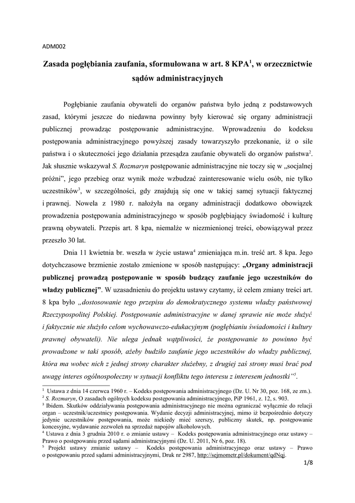 ADM002 Zasada pogłębiania zaufania, sformułowana w art. 8 KPA1, w orzecznictwie sądów administracyjnych Pogłębianie zaufania obywateli do organów państwa było jedną z podstawowych zasad, którymi jeszcze do niedawna powinny były kierować się organy administracji publicznej prowadząc postępowanie administracyjne. Wprowadzeniu do kodeksu postępowania administracyjnego powyższej zasady towarzyszyło przekonanie, iż o sile państwa i o skuteczności jego działania przesądza zaufanie obywateli do organów państwa2. Jak słusznie wskazywał S. Rozmaryn postępowanie administracyjne nie toczy się w „socjalnej próżni”, jego przebieg oraz wynik może wzbudzać zainteresowanie wielu osób, nie tylko uczestników3, w szczególności, gdy znajdują się one w takiej samej sytuacji faktycznej i prawnej. Nowela z 1980 r. nałożyła na organy administracji dodatkowo obowiązek prowadzenia postępowania administracyjnego w sposób pogłębiający świadomość i kulturę prawną obywateli. Przepis art. 8 kpa, niemalże w niezmienionej treści, obowiązywał przez przeszło 30 lat. Dnia 11 kwietnia br. weszła w życie ustawa 4 zmieniająca m.in. treść art. 8 kpa. Jego dotychczasowe brzmienie zostało zmienione w sposób następujący: „Organy administracji publicznej prowadzą postępowanie w sposób budzący zaufanie jego uczestników do władzy publicznej”. W uzasadnieniu do projektu ustawy czytamy, iż celem zmiany treści art. 8 kpa było „dostosowanie tego przepisu do demokratycznego systemu władzy państwowej Rzeczypospolitej Polskiej. Postępowanie administracyjne w danej sprawie nie może służyć i faktycznie nie służyło celom wychowawczo-edukacyjnym (pogłębianiu świadomości i kultury prawnej obywateli). Nie ulega jednak wątpliwości, że postępowanie to powinno być prowadzone w taki sposób, ażeby budziło zaufanie jego uczestników do władzy publicznej, która ma wobec nich z jednej strony charakter służebny, z drugiej zaś strony musi brać pod uwagę interes ogólnospołeczny w sytuacji konfliktu tego interesu z interesem jednostki”5. 1 Ustawa z dnia 14 czerwca 1960 r. – Kodeks postępowania administracyjnego (Dz. U. Nr 30, poz. 168, ze zm.). S. Rozmaryn, O zasadach ogólnych kodeksu postępowania administracyjnego, PiP 1961, z. 12, s. 903. 3 Ibidem. Skutków oddziaływania postępowania administracyjnego nie można ograniczać wyłącznie do relacji organ – uczestnik/uczestnicy postępowania. Wydanie decyzji administracyjnej, mimo iż bezpośrednio dotyczy jedynie uczestników postępowania, może niekiedy mieć szerszy, publiczny skutek, np. postępowanie koncesyjne, wydawanie zezwoleń na sprzedaż napojów alkoholowych. 4 Ustawa z dnia 3 grudnia 2010 r. o zmianie ustawy – Kodeks postępowania administracyjnego oraz ustawy – Prawo o postępowaniu przed sądami administracyjnymi (Dz. U. 2011, Nr 6, poz. 18). 5 Projekt ustawy zmianie ustawy – Kodeks postępowania administracyjnego oraz ustawy – Prawo o postępowaniu przed sądami administracyjnymi, Druk nr 2987, http://sejmometr.pl/dokument/qdNqj. 2 1/8 ADM002 Tym samym, ustawodawca zdjął z barków organów administracji publicznej brzemię pogłębiania świadomości i kultury prawnej obywateli. Ideologiczne założenia uspołeczniania administracji6, jakie legły u podstaw formułowania tej zasady, w sposób brutalny zderzyły się z rzeczywistością. Okazało się bowiem, że postępowanie administracyjne nie jest odpowiednim forum do pogłębiania świadomości i kultury prawnej obywateli w ogólności. Należy jednak wyraźnie podkreślić, że na skutek przedmiotowej zmiany interesy stron postępowania nie zostały narażone na żaden uszczerbek. Zachowano bowiem w mocy art. 9 kpa, który nakłada na organy administracji publicznej obowiązek należytego i wyczerpującego informowania stron o okolicznościach faktycznych i prawnych, które mogą mieć wpływ na ustalenie ich praw i obowiązków będących przedmiotem postępowania administracyjnego. Organy czuwają ponadto nad tym, aby strony i inne osoby uczestniczące w postępowaniu nie poniosły szkody z powodu nieznajomości prawa, udzielając im niezbędnych wyjaśnień i wskazówek. Istotnym wydaje się jednak ograniczenie obowiązku prowadzenia postępowania w sposób budzący zaufanie jedynie w odniesieniu do uczestników danego postępowania, nie jak zaś jak to miało miejsce dotychczas – w odniesieniu do ogółu obywateli. Dla oceny skutków przedmiotowej nowelizacji, niezbędna wydaje się odpowiedź na pytanie, jakie znaczenie zasadzie pogłębiania zaufania do obywateli przypisywały sądy administracyjne do tej pory. Zasada pogłębiania zaufania obywateli może być ujmowana zarówno od strony negatywnej, jako obowiązek powstrzymania się organów administracji przed działaniami, które mogłyby osłabiać zaufanie obywateli, jak i od strony pozytywnej – jako konieczność prowadzenia postępowania administracyjnego tak, aby zaufanie obywateli do aparatu administracyjnego wzrastało. Z rażącym naruszeniu zaufania obywateli mielibyśmy do czynienia wówczas, gdyby organy administracji nie zgromadziły w ogóle jakichkolwiek dowodów niezbędnych do poczynienia ustaleń faktycznych w sprawie, lub przeprowadziły jedynie szczątkowe postępowanie dowodowe, uniemożliwiające dokładne wyjaśnienie stanu faktycznego7. Brak zaufania obywateli do władzy państwowej jest zazwyczaj skutkiem 6 M. Szubiakowski, M. Wierzbowski, A. Wiktorowska, Postępowanie administracyjne – ogólne, podatkowe, egzekucyjne i przed sądami administracyjnymi, Warszawa 2008, s. 30. 7 Wyrok Naczelnego Sądu Administracyjnego w Warszawie z dnia 26 kwietnia 2010r., II OSK 715/09, „LEX” nr 597802 2/8 ADM002 naruszenia prawa przez organy prowadzące postępowanie, wydawanie rozstrzygnięć w sposób arbitralny z pominięciem podstawowych wartości, na jakich opiera się polski system prawny, takich jak równość i sp