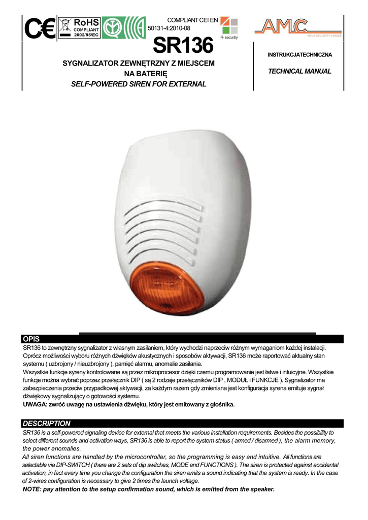 COMPLIANT CEI EN 50131-4:2010-08 C€ SR136 SYGNALIZATOR ZEWNĘTRZNY Z MIEJSCEM NA BATERIĘ SELF-POWERED SIREN FOR EXTERNAL INSTRUKCJATECHNICZNA TECHNICAL MANUAL OPIS SR136 to zewnętrzny sygnalizator z własnym zasilaniem, który wychodzi naprzeciw różnym wymaganiom każdej instalacji. Oprócz możliwości wyboru różnych dźwięków akustycznych i sposobów aktywacji, SR136 może raportować aktualny stan systemu ( uzbrojony / nieuzbrojony ), pamięć alarmu, anomalie zasilania. Wszystkie funkcje syreny kontrolowane są przez mikroprocesor dzięki czemu programowanie jest łatwe i intuicyjne. Wszystkie funkcje można wybrać poprzez przełącznik DIP ( są 2 rodzaje przełączników DIP , MODUŁ i FUNKCJE ). Sygnalizator ma zabezpieczenia przeciw przypadkowej aktywacji, za każdym razem gdy zmieniana jest konfiguracja syrena emituje sygnał dźwiękowy sygnalizujący o gotowości systemu. UWAGA: zwróć uwagę na ustawienia dźwięku, który jest emitowany z głośnika. DESCRIPTION SR136 is a self-powered signaling device for external that meets the various installation requirements. Besides the possibility to select different sounds and activation ways, SR136 is able to report the system status ( armed / disarmed ), the alarm memory, the power anomalies. All siren functions are handled by the microcontroller, so the programming is easy and intuitive. All functions are selectable via DIP-SWITCH ( there are 2 sets of dip switches, MODE and FUNCTIONS ). The siren is protected against accidental activation, in fact every time you change the configuration the siren emits a sound indicating that the system is ready. In the case of 2-wires configuration is necessary to give 2 times the launch voltage. NOTE: pay attention to the setup confirmation sound, which is emitted from the speaker. LISTA MODUŁÓW ( DIP ) - LIST OF ACTIVATION MODES (DIP MODE) SR136 posiada następujące moduły aktywujące: SR136 has the following modes of activation: - Polecenie START: TERMINAL S - Start trigger: S TERMINAL dip 1 1 2 3 4 ■ ■ ■ ■ Podanie + positive missing podanie – negative OFF dip missing ON Aktywacja1systemu UZBROJONY: TERMINAL A System status trigger ARMED: A TERMINAL dip2 OFF aktywacja – na terminalu A trigger on A terminal with Negative dip 2 ON aktywacja + na terminal A trigger on A terminal with Positive Oddzielne aktywacje Lampy I Głośnika : Lamp and speaker separated triggers: dip 3 OFF: uniwersalna aktywacja (głośnika I lampy na terminalu S) unique trigger ( speaker and lamp on S terminal ) dip 3 ON : głośnik na terminalu A I lampa na terminal S speaker on A terminal and lamp on S terminal funkcja 2 przewodów: 2 wires function: dip 4 OFF tradycyjne (2 przewody zasilające, 1 na alarm ) traditional ( 2 power supply wires, 1 wire for alarm trigger ) dip 4 ON 2 przewody zasilające z natychmiastowym startem 2 power supply wires with starting immediately Uwaga 1: polaryzacja oddzielnych aktywacji zawsze kontrolowana jest przez dip 1 i dip 2 Uwaga 2: włączenie funkcji 2-przewodowej następuje po drugiej aktywacji Uwaga 3: programowanie działania 2-przewodowego ( dip 4 ON ) zgodne z normą CEI-EN 50131-4: 2010-8 i zatwierdzone przez IMQ (Istituto Italiano del Marchio di Qualità ) note 1: the polarity for separated triggers is always controlled by dip 1 and dip 2 note 2: the starting of 2-wires function takes place after the second activation note 3: programming 2-wires operation (dip 4 ON) is lost compliance with CEI-EN 50131-4: 2010-8 and therefore IMQ marking LISTA FUNKCJI ( FUNKCJE DIP ) FUNCTIONS LIST ( DIP FUNCTIONS ) SR136 posiada następujące funkcje , które mogą być aktywowane INDYWIDULANIE WŁĄCZAJĄC ON na właściwym przełączniku DIP: SR136 has the following functions that can be activated INDIVIDUALLY BRINGING ON the corresponding dip: - Pamięć melodii alarmu (DIP 1 ON): - Sound alarm memory ( DIP 1 ON ): Melodie dźwięku po wyłączeniu systemu po alarmie Melody sounds when you switch off the system after an alarm 1 2 3 4 5 6 7 8 ■ ■ ■ ■ ■ ■ ■ ■ - Pamięć fleszy alarmu (DIP 2 ON): - Visual alarm memory ( DIP 2 ON ): Flesze po alarmie gdy system jest uzbrojony ( wyłączają się gdy system jest nieuzbrojony ) Continue fast flashes after an alarm when the system is armed ( it turn off when the system is disarmed) - Sygnalizacja dźwiękowa dla statusu systemu UZBROJONY / NIEUZBROJONY (DIP 3 ON): - Sound system status indication ARMED / DISARMED ( DIP 3 ON ): Emituje 3 krótkie dźwięki gdy system jest uzbrojony, 1 długi dźwięk podczas rozbrajania systemu emits 3 beep when you arm the system, 1 long beep when you disarm the system - Sygnalizacja flesz dla statusu systemu UZBROJONY/NIEUZBROJONY (DIP 4 ON): - Visual system status indication ARMED / DISARMED (DIP 4 ON): Emituje 3 flesze gdy uzbroisz system , 1 długi flesz podczas rozbrajania emits 3 flashes when you arm the system, 1 long flash when you disarm the system - Różne sygnały dla UZBROJENIA (DIP 5 ON): - Fixed signaling of system ARMED ( DIP 5 ON ): Gdy system jest uzbrojony system poda 2 flesze when the system is armed gives a double flash - Syrena OK w stanie gotowości (DIP 6 ON): - Siren OK indication “ stand by “ ( DIP 6 ON ): Emituje krótki flesz co 10 sek gdy syrena działa poprawnie Emits a short flash every 10 seconds when the siren is operating properly - Zmiana typu dźwięku (DIP 7 ON): - Change type sound ( DIP 7 ON ): loss of Omologation Zmiana typu dźwięku (od 1400Hz/1700Hz do 1600Hz/3500Hz) Change the type of sound ( from 1400Hz/1700Hz to 1600Hz/3500Hz) - Czas trwania sygnału (DIP 8 ON): - Timing of the siren ( DIP 8 ON ): Wydłuża maksymalny czas trwania sygnału bez kontroli systemu od 3’ do 15’ Increases the maximum duration of the siren sound without system control from 3’ to 15’ OPIS PŁYTKI - DESCRIPTION OF THE ELECTRONIC BOARD -- złącze + - = zasilanie syreny (13.8Vcc) -- TAMPER = złącza dla jednostki kontroli antysabotażowe