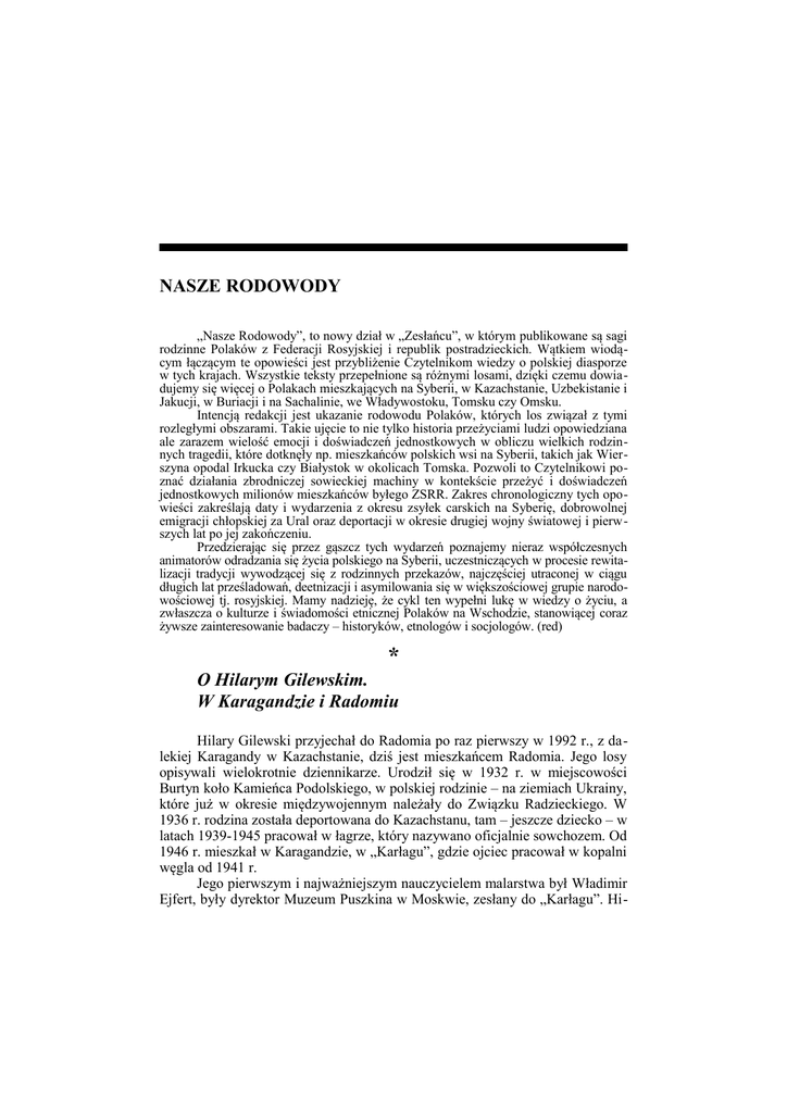 NASZE RODOWODY „Nasze Rodowody”, to nowy dział w „Zesłańcu”, w którym publikowane są sagi rodzinne Polaków z Federacji Rosyjskiej i republik postradzieckich. Wątkiem wiodącym łączącym te opowieści jest przybliżenie Czytelnikom wiedzy o polskiej diasporze w tych krajach. Wszystkie teksty przepełnione są różnymi losami, dzięki czemu dowiadujemy się więcej o Polakach mieszkających na Syberii, w Kazachstanie, Uzbekistanie i Jakucji, w Buriacji i na Sachalinie, we Władywostoku, Tomsku czy Omsku. Intencją redakcji jest ukazanie rodowodu Polaków, których los związał z tymi rozległymi obszarami. Takie ujęcie to nie tylko historia przeżyciami ludzi opowiedziana ale zarazem wielość emocji i doświadczeń jednostkowych w obliczu wielkich rodzinnych tragedii, które dotknęły np. mieszkańców polskich wsi na Syberii, takich jak Wierszyna opodal Irkucka czy Białystok w okolicach Tomska. Pozwoli to Czytelnikowi poznać działania zbrodniczej sowieckiej machiny w kontekście przeżyć i doświadczeń jednostkowych milionów mieszkańców byłego ZSRR. Zakres chronologiczny tych opowieści zakreślają daty i wydarzenia z okresu zsyłek carskich na Syberię, dobrowolnej emigracji chłopskiej za Ural oraz deportacji w okresie drugiej wojny światowej i pierwszych lat po jej zakończeniu. Przedzierając się przez gąszcz tych wydarzeń poznajemy nieraz współczesnych animatorów odradzania się życia polskiego na Syberii, uczestniczących w procesie rewitalizacji tradycji wywodzącej się z rodzinnych przekazów, najczęściej utraconej w ciągu długich lat prześladowań, deetnizacji i asymilowania się w większościowej grupie narodowościowej tj. rosyjskiej. Mamy nadzieję, że cykl ten wypełni lukę w wiedzy o życiu, a zwłaszcza o kulturze i świadomości etnicznej Polaków na Wschodzie, stanowiącej coraz żywsze zainteresowanie badaczy – historyków, etnologów i socjologów. (red) * O Hilarym Gilewskim. W Karagandzie i Radomiu Hilary Gilewski przyjechał do Radomia po raz pierwszy w 1992 r., z dalekiej Karagandy w Kazachstanie, dziś jest mieszkańcem Radomia. Jego losy opisywali wielokrotnie dziennikarze. Urodził się w 1932 r. w miejscowości Burtyn koło Kamieńca Podolskiego, w polskiej rodzinie – na ziemiach Ukrainy, które już w okresie międzywojennym należały do Związku Radzieckiego. W 1936 r. rodzina została deportowana do Kazachstanu, tam – jeszcze dziecko – w latach 1939-1945 pracował w łagrze, który nazywano oficjalnie sowchozem. Od 1946 r. mieszkał w Karagandzie, w „Karłagu”, gdzie ojciec pracował w kopalni węgla od 1941 r. Jego pierwszym i najważniejszym nauczycielem malarstwa był Władimir Ejfert, były dyrektor Muzeum Puszkina w Moskwie, zesłany do „Karłagu”. Hi- NASZE RODOWODY 72 lary Gilewski, po ukończeniu Centrum Lotniczego w Karagandzie, uczył się w Wyższej Szkole Lotniczej w mieście Arzamas, służbę w wojskach lotniczych na Wyspach Kurylskich (był pilotem odrzutowców) przerwał w 1956 r. wypadek. Studiował malarstwo w Wyższej Szkole Plastycznej w mieście Pienza w Rosji (1957-62), pracował przez 30 lat w pracowniach plastycznych Karagandy, w latach 1965-67 kontynuował studia w moskiewskim Instytucie Sztuk Pięknych im. Surikowa u profesorów Siemiona Czujkowa i Aleksieja Gricaja. W krajowych wystawach uczestniczył od 1963 r., malował obrazy, ale wykonywał też monumentalne malarstwo ścienne i mozaiki. Był artystą cenionym nie tylko w Karagandzie, uczestniczył w wystawach w Moskwie, w plenerach i wystawach w całym Związku Radzieckim, jego obrazy trafiły do muzeów Kazachstanu i kilku innych republik. Kiedy w 1992 r. przyjechała do Karagandy wystawa zorganizowana przez dwa muzea radomskie, Muzeum Wsi i Okręgowe, dyrektor Muzeum Okręgowego, Janusz Pulnar, zaproponował zorganizowanie w Radomiu wystawy artystów Karagandy. Hilary Gilewski po raz pierwszy przyjechał do Radomia, a w 1993 pokazał obrazy w Muzeum Sztuki Współczesnej na wystawie „Z Kazachstanu do Polski. Malarstwo Karagandy”. Od tego momentu związał się z tym miastem, i stąd podróżował do Karagandy, żeby skompletować dokumenty potrzebne do uzyskania polskiego obywatelstwa. Otrzymał obywatelstwo w 2002 r. (Dopiero wtedy otrzymał w Radomiu mieszkanie). Nikt nie przypuszczał, także on, że polskie prawo stworzyło barierę i będzie to takie trudne. Ten czas przetrwał dzięki stypendiom Ministerstwa Kultury (przez dwa lata) i zatrudnieniu w Muzeum Okręgowym. Niewiele obrazów z dawnych lat udało mu się przewieźć do Polski; ogromny dorobek artystyczny, biblioteka i rzeczy osobiste pozostały w Karagandzie. Z obrazów, które znamy, największe zainteresowanie budzą te, które nie tylko świadczą o dobrym przygotowaniu akademickim, ale są dokumentem dalekiej i egzotycznej rzeczywistości. Malował Gilewski nie istniejące już dziś dzielnice Karagandy, miejsca łagru i pierwszych kopalni, widoki stepu i architekturę miasta, portrety górników, artystów, dostojników, także Kazachów i ich obyczaje. W Polsce maluje przede wszystkim pejzaże, pola i łąki, rzadziej portrety; znakomity warsztat pozwolił mu na malowanie kopii obrazów, np. Matki Boskiej Częstochowskiej i Ostrobramskiej na wystawę organizowaną w radomskim Muzeum w 1998 r. Jego obrazy pokazywane są niezbyt często, były np. w kilku miastach na wystawie pejzaży województwa mazowieckiego, także w Budapeszcie na wystawie artystów polskich z krajów grupy wyszehradzkiej; miał kilka wystaw indywidualnych, m.in. w 2004 r. w Muzeum I.J. Paderewskiego i Wychodźstwa Polskiego w Warszawie, wspólną z innym repatriantem z Kazachstanu, Alfonsem Kułakowskim. * Data przyjazdu do Polski dzieli twórczość Hilarego Gilewskiego na dwa okresy. Mieszkając w Karagandzie tworzył obrazy świadczące o profesjonalnych umiejętnościach, ale podejmował też próby tworzenia obrazów bardziej nowoczesnych. Jest autorem zarówn