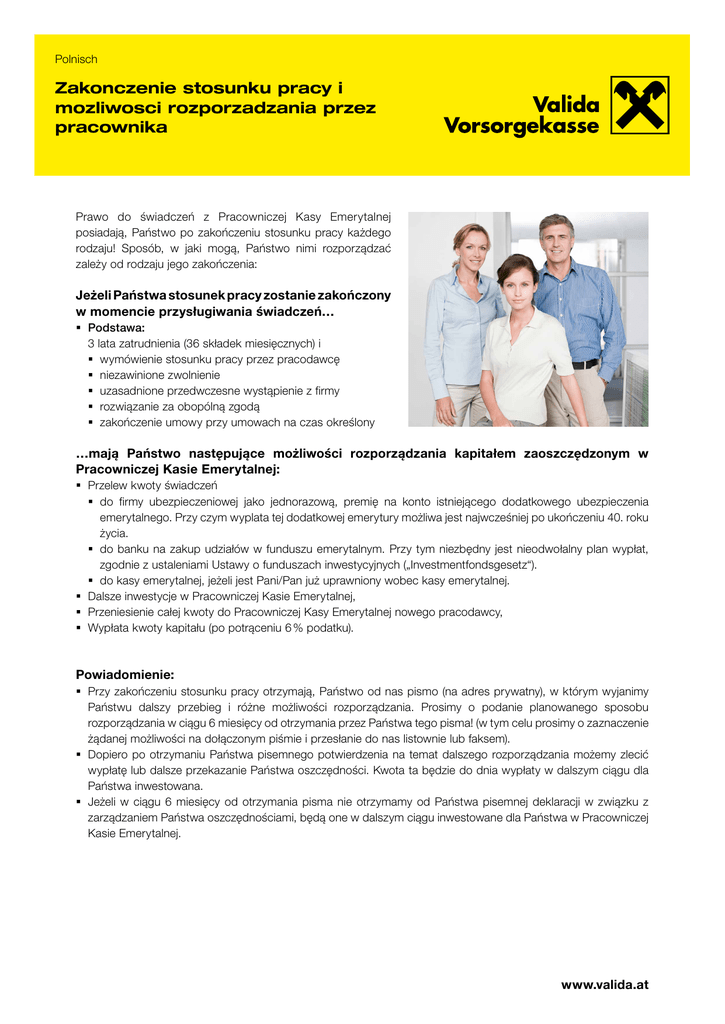 Polnisch Zakonczenie stosunku pracy i mozliwosci rozporzadzania przez pracownika Prawo do świadczeń z Pracowniczej Kasy Emerytalnej posiadają, Państwo po zakończeniu stosunku pracy każdego rodzaju! Sposób, w jaki mogą, Państwo nimi rozporządzać zależy od rodzaju jego zakończenia: Jeżeli Państwa stosunek pracy zostanie zakończony w momencie przysługiwania świadczeń… Podstawa: 3 lata zatrudnienia (36 składek miesięcznych) i w ymówienie stosunku pracy przez pracodawcę niezawinione zwolnienie uzasadnione przedwczesne wystąpienie z firmy rozwiązanie za obopólną zgodą zakończenie umowy przy umowach na czas określony …mają Państwo następujące możliwości rozporządzania kapitałem zaoszczędzonym w Pracowniczej Kasie Emerytalnej: Przelew kwoty świadczeń do firmy ubezpieczeniowej jako jednorazową, premię na konto istniejącego dodatkowego ubezpieczenia emerytalnego. Przy czym wyplata tej dodatkowej emerytury możliwa jest najwcześniej po ukończeniu 40. roku życia. do banku na zakup udziałów w funduszu emerytalnym. Przy tym niezbędny jest nieodwołalny plan wypłat, zgodnie z ustaleniami Ustawy o funduszach inwestycyjnych („Investmentfondsgesetz“). do kasy emerytalnej, jeżeli jest Pani/Pan już uprawniony wobec kasy emerytalnej. Dalsze inwestycje w Pracowniczej Kasie Emerytalnej, Przeniesienie całej kwoty do Pracowniczej Kasy Emerytalnej nowego pracodawcy, Wypłata kwoty kapitału (po potrąceniu 6 % podatku). Powiadomienie: Przy zakończeniu stosunku pracy otrzymają, Państwo od nas pismo (na adres prywatny), w którym wyjanimy Państwu dalszy przebieg i różne możliwości rozporządzania. Prosimy o podanie planowanego sposobu rozporządzania w ciągu 6 miesięcy od otrzymania przez Państwa tego pisma! (w tym celu prosimy o zaznaczenie żądanej możliwości na dołączonym piśmie i przesłanie do nas listownie lub faksem). Dopiero po otrzymaniu Państwa pisemnego potwierdzenia na temat dalszego rozporządzania możemy zlecić wypłatę lub dalsze przekazanie Państwa oszczędności. Kwota ta będzie do dnia wypłaty w dalszym ciągu dla Państwa inwestowana. Jeżeli w ciągu 6 miesięcy od otrzymania pisma nie otrzymamy od Państwa pisemnej deklaracji w związku z zarządzaniem Państwa oszczędnościami, będą one w dalszym ciągu inwestowane dla Państwa w Pracowniczej Kasie Emerytalnej. www.valida.at Zakonczenie stosunku pracy i mozliwosci rozporzadzania przez pracownika Termin wypłaty: Po tym jako poinformują nas Państwo o swoim życzeniu w związku z rozporządzaniem zaoszczędzoną kwotą, zostanie ona Państwu wypłacona lub przekazana pod koniec drugiego miesiąca, w ciągu 5 dni roboczych. W przypadku wszystkich możliwości rozporządzania mają Państwo prawo do jednokrotnego przesunięcia rozporządzania o jeden do sześciu miesięcy. Przesunięcie to jest tylko wtedy ważne, jeżeli otrzymamy ja najpóźniej 14 dni przed upływem dwumiesięcznego terminu. O wypłatę zaoszczędzonego kapitału mogą Państwo wystąpić: Przy zakończeniu stosunku pracy po osiągnięciu wieku emerytalnego dla wcześniejszych emerytur w ramach ubezpieczenia społecznego. Jeżeli w ciągu dwóch miesięcy od zakończenia stosunku pracy w związku z emeryturą, nie wyrażą nam Państwo swojego życzenia na temat dalszego postępowania, wypłacimy Państwu kwotę kapitału pomniejszoną o 6 % podatku. Jeżeli, od co najmniej pięciu lat nie były za Państwa płacone składki W przypadku śmierci świadczenia przysługuj, prawnym spadkobiercom. (Spadkobiercy uprawnieni do utrzymania np. dzieci). W przypadku braku spadkobierców świadczenia wchodzą w skład do masy spadkowej. Wszystkie składki, które płacone są przez pracodawcę są w 100 % gwarantowane przez Pracowniczą Kasę Emerytalną (w tym również przeniesienie wcześniejszych świadczeń emerytalnych). Nie mają Państwo prawa do rozporządzania zaoszczędzonym kapitałem: Złożenie wypowiedzenia przez pracownika (wyjątek urlop wychowawczy) Zwolnienia z winy pracownika Nieuzasadnione zakończenie stosunku pracy przez pracownika Okres zatrudnienia krótszy niż 3 lata (36 składek miesięcznych) Przy tej formie zakończenia stosunku pracy zaoszczędzony przez Państwa kapitał pozostanie w Pracowniczej Kasie Emerytalnej do dalszego inwestowania. Raz w roku otrzymają Państwo od nas wyciąg z konta (wraz reportingiem dotyczącym poczynionych inwestycji) na Państwa prywatny adres. Poza tym na naszej stronie internetowej po podaniu Państwa kodu PIN (widoczny na wyciągu z konta) mogą Państwo zasięgnąć informacji na temat stanu konta wraz z informacjami o naszych inwestycjach. Nasi pracownicy chętnie udzielą Państwu dalszych informacji również telefonicznie. Informacja Pracowniczej Kasy Emerytalnej Jeżeli w przyszłoci, u innego pracodawcy zdobędą Państwo po zakończeniu stosunku pracy prawo do wypłaty oszczędności, mogą Państwo zarządzać również oszczędnościami zgromadzonymi w Pracowniczej Kasie Emerytalnej. W przypadku, jeżeli, przez co najmniej 5 lat nie będą Państwo pozostawali w stosunku pracy, w związku, z którym byliby zobowiązani Państwo do płacenia składek zgodnie z BMSVG, mogą Państwo w każdym momencie zarządzać swoimi oszczędnościami. Impressum: Medieninhaber: Valida Plus AG, 1190 Wien, Hersteller: Eigenproduktion, Verlagsort: Wien, Foto © Image Source Limited, Stand: Oktober 2012 www.valida.at