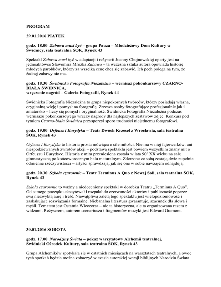 PROGRAM 29.01.2016 PIĄTEK godz. 18.00 Zabawa musi być – grupa Pauza – Młodzieżowy Dom Kultury w Świdnicy, sala teatralna ŚOK, Rynek 43 Spektakl Zabawa musi być w adaptacji i reżyserii Joanny Chojnowskiej oparty jest na jednoaktówce Sławomira Mrożka Zabawa – ta wczesna sztuka autora opowiada historię młodych parobków, którzy za wszelką cenę chcą się zabawić. Ich pech polega na tym, że żadnej zabawy nie ma. godz. 18.30 Świdnicka Fotografia Niezależna – wernisaż pokonkursowy CZARNOBIAŁA ŚWIDNICA, wręczenie nagród – Galeria Fotografii, Rynek 44 Świdnicka Fotografia Niezależna to grupa niepokornych twórców, którzy posiadają własną, oryginalną wizję i pomysł na fotografię. Zrzesza osoby fotografujące profesjonalnie jak i amatorsko – liczy się pomysł i oryginalność. Świdnicka Fotografia Niezależna podczas wernisażu pokonkursowego wręczy nagrody dla najlepszych zestawów zdjęć. Konkurs pod tytułem Czarno-biała Świdnica przysporzył sporo trudności niejednemu fotografowi. godz. 19.00 Orfeusz i Eurydyka – Teatr Dwóch Krzeseł z Wrocławia, sala teatralna ŚOK, Rynek 43 Orfeusz i Eurydyka to historia prosta mówiąca o sile miłości. Nie ma w niej fajerwerków, ani niespodziewanych zwrotów akcji – podstawą spektaklu jest bowiem wszystkim znany mit o Orfeuszu i Eurydyce. Historia z mitu przeniesiona została w lata 90’ XX wieku na salę gimnastyczną po końcoworocznym balu maturalnym. Zderzone ze sobą zostają dwie zupełnie odmienne rzeczywistości – artyści sprawdzają, jak się one w sobie nawzajem odnajdują. godz. 20.30 Szkoła czarownic – Teatr Terminus A Quo z Nowej Soli, sala teatralna ŚOK, Rynek 43 Szkoła czarownic to ważny a niedoceniony spektakl w dorobku Teatru „Terminus A Quo”. Od samego początku ekscytował i rozpalał do czerwoności aktorów i publiczność poprzez swą niezwykłą aurę i treść. Niewątpliwą zaletą tego spektaklu jest wielopoziomowość i zaskakujące rozwiązania formalne. Niebanalna literatura gwarantuje, szacunek dla słowa i myśli. Tematem jest Ostatnia Wieczerza – nie ta historyczna, ale ta organizowana razem z widzami. Reżyserem, autorem scenariusza i fragmentów muzyki jest Edward Gramont. 30.01.2016 SOBOTA godz. 17.00 Narodziny Świata – pokaz warsztatowy Alchemii teatralnej, Świdnicki Ośrodek Kultury, sala teatralna ŚOK, Rynek 43 Grupa Alchemików spotykała się w ostatnich miesiącach na warsztatach teatralnych, a owoc tych spotkań będzie można zobaczyć w czasie autorskiej wersji biblijnych Narodzin Świata. Siedem obrazów, siedem różnych stylów opowiadania, siedem odsłon, podczas których rodził się świat, ale też grupa teatralna w trakcie tworzenia scenicznego świata. godz. 17.45 Ederlezi – Pracownia Teatru Tańca Młodzieżowe Centrum Kultury i Edukacji w Zielonej Górze, sala teatralna ŚOK, Rynek 43 Pracownia Teatru Tańca działa pod artystycznym kierownictwem Marka Zadłużnego. Jest to przestrzeń skupiająca młodych twórców, których poszukiwania zogniskowane są wokół tanecznych sztuk performatywnych i fizyczności w działaniach scenicznych. O spektaklu Ederlezi w reżyserii Małgorzaty Kazińskiej i Marka Zadłużnego (również autora choreografii) autorzy piszą w formie wiersza: Zima na ramiona moje spadła/Niewinnością białym śniegiem/Pierwsza gwiazda już na niebie/Nie ma nie ma ciebie Ogień tańczyć zaczął już w kominie/A choinka się zieleni/Serca ludziom opromieni Moje w kamień zmieni Śnieg zasypał dzisiaj wszystkie drogi /Niewinnością białym płaszczem Twoich śladów nie wypatrzę/Nie mam cię na zawsze godz. 18.30 CO2 – Set audiowizualny – Slime & Marek Straszak, Galeria Fotografii, Rynek 44 Set audiowizualny autorstwa Sławomira Jeśko (Slime), Marka Straszaka i Agaty Elsner inspirowany sztuką latania to twórcza metafora nawiązująca do historii praprapradziadka A. Elsner, który pasjonował się lotnictwem i próbował konstruować własne maszyny latające. Na wizualizacje złożyły się filmy z performansem A. Elsner, animacje 3d wykonane przez M. Straszaka i archiwalne filmy przedstawiające prekursorów lotnictwa i ich próby uruchomienia pierwszych, prymitywnych maszyn latających. godz. 19.30 BYĆ – Trzeci Teatr z Teatru Dramatycznego w Wałbrzychu, sala teatralna ŚOK, Rynek 43 Trzeci Teatr jest młodzieżową grupą działającą od 2002 r. w Teatrze Dramatycznym im. J. Szaniawskiego w Wałbrzychu. Spektakl Być w reżyserii Grzegorza Stawiaka jest próbą refleksji na temat tego, co definiuje człowieka jako wyemancypowany byt. Do spektaklu artyści napisali teksty własne oraz wykorzystali fragmenty Fausta Leszka Kołakowskiego oraz wierszy Tadeusza Nowaka.