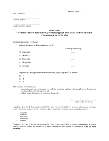 …………………………………. Kraków, dnia ……………… imię i nazwisko …………………………………. kierunek studiów …………………………………. katedra/instytut/wydział WNIOSEK o wydanie odpisów dokumentów poświadczających ukończenie studiów wyższych w tłumaczeniu na języki obce Uprzejmie proszę o wydanie: 1. odpisu dyplomu w tłumaczeniu na język1: liczba egzemplarzy: □ angielski ….. □ niemiecki ….. □ francuski ….. □ hiszpański ….. □ rosyjski ….. 2. suplementu do dyplomu w tłumaczeniu na język angielski2 w liczbie: □ 1 □ 2 □ 3 Jednocześnie oświadczam, iż: zapoznałem/am się z informacją o wysokości opłaty za wydanie odpisu dyplomu w tłumaczeniu na język obcy, obowiązującej na UJ zobowiązuję się dostarczyć potrzebne fotografie. ……………………………. podpis osoby wnioskującej 1 zgodnie z § 13 ust. 2 Rozporządzenia MNiSW z dnia 14 września 2011 r. w sprawie dokumentacji przebiegu studiów absolwent może się starać o wydanie odpisów dyplomu w tłumaczeniu na następujące języki: angielski niemiecki francuski hiszpański rosyjski 2 zgodnie z § 13 ust. 2 Rozporządzenia MNiSW z dnia 14 września 2011 r. w sprawie dokumentacji przebiegu studiów uczelnia wydaje nie więcej niż 3 odpisy suplementu do dyplomu w tłumaczeniu tylko na język angielski