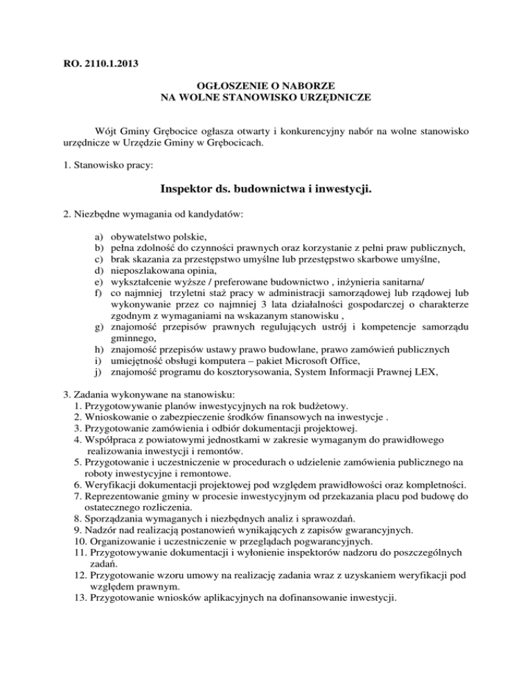 RO. 2110.1.2013 OGŁOSZENIE O NABORZE NA WOLNE STANOWISKO URZĘDNICZE Wójt Gminy Grębocice ogłasza otwarty i konkurencyjny nabór na wolne stanowisko urzędnicze w Urzędzie Gminy w Grębocicach. 1. Stanowisko pracy: Inspektor ds. budownictwa i inwestycji. 2. Niezbędne wymagania od kandydatów: a) b) c) d) e) f) g) h) i) j) obywatelstwo polskie, pełna zdolność do czynności prawnych oraz korzystanie z pełni praw publicznych, brak skazania za przestępstwo umyślne lub przestępstwo skarbowe umyślne, nieposzlakowana opinia, wykształcenie wyższe / preferowane budownictwo , inżynieria sanitarna/ co najmniej trzyletni staż pracy w administracji samorządowej lub rządowej lub wykonywanie przez co najmniej 3 lata działalności gospodarczej o charakterze zgodnym z wymaganiami na wskazanym stanowisku , znajomość przepisów prawnych regulujących ustrój i kompetencje samorządu gminnego, znajomość przepisów ustawy prawo budowlane, prawo zamówień publicznych umiejętność obsługi komputera – pakiet Microsoft Office, znajomość programu do kosztorysowania, System Informacji Prawnej LEX, 3. Zadania wykonywane na stanowisku: 1. Przygotowywanie planów inwestycyjnych na rok budżetowy. 2. Wnioskowanie o zabezpieczenie środków finansowych na inwestycje . 3. Przygotowanie zamówienia i odbiór dokumentacji projektowej. 4. Współpraca z powiatowymi jednostkami w zakresie wymaganym do prawidłowego realizowania inwestycji i remontów. 5. Przygotowanie i uczestniczenie w procedurach o udzielenie zamówienia publicznego na roboty inwestycyjne i remontowe. 6. Weryfikacji dokumentacji projektowej pod względem prawidłowości oraz kompletności. 7. Reprezentowanie gminy w procesie inwestycyjnym od przekazania placu pod budowę do ostatecznego rozliczenia. 8. Sporządzania wymaganych i niezbędnych analiz i sprawozdań. 9. Nadzór nad realizacją postanowień wynikających z zapisów gwarancyjnych. 10. Organizowanie i uczestniczenie w przeglądach pogwarancyjnych. 11. Przygotowywanie dokumentacji i wyłonienie inspektorów nadzoru do poszczególnych zadań. 12. Przygotowanie wzoru umowy na realizację zadania wraz z uzyskaniem weryfikacji pod względem prawnym. 13. Przygotowanie wniosków aplikacyjnych na dofinansowanie inwestycji. 4. Warunki pracy : Praca na przedmiotowym stanowisku nie jest narażona na występowanie uciążliwych i szkodliwych warunków pracy. 5. W miesiącu poprzedzającym datę upublicznienia ogłoszenia wskaźnik zatrudnienia osób niepełnosprawnych w urzędzie , w rozumieniu przepisów i rehabilitacji zawodowej i społecznej oraz zatrudnianiu osób niepełnosprawnych jest niższy niż 6%. 6. Wymagane dokumenty: 1) list motywacyjny, 2) CV z dokładnym opisem przebiegu pracy zawodowej, 3) kwestionariusz osobowy – według wzoru dostępnego na stronie internetowej Urzędu Gminy oraz w Referacie Organizacyjnym Urzędu Gminy w Grębocicachsekretariat pok. Nr 2 4) kserokopie świadectw pracy z dotychczasowych miejsc pracy/ poświadczone przez kandydata za zgodność z oryginałem/, 5) kserokopie dokumentów / poświadczone przez kandydata za zgodność z oryginałem/ potwierdzających wykształcenie i kwalifikacje zawodowe, 6) oświadczenie kandydata o braku skazania prawomocnym wyrokiem sądu za umyślne przestępstwo ścigane z oskarżenia publicznego lub umyślne przestępstwo skarbowe, 7) oświadczenie kandydata, że w przypadku wyboru jego oferty zobowiązuje się nie wykonywać zajęć pozostających w sprzeczności lub związanych z zajęciami, które wykonuje w ramach obowiązków służbowych, wywołujących uzasadnione podejrzenie o stronniczość lub interesowność oraz zajęć sprzecznych z obowiązkami wynikającymi z ustawy, 8) oświadczenie o pełnej zdolności do czynności prawnych i korzystaniu z pełni praw publicznych, 9) w przypadku gdy kandydatem jest osoba niepełnosprawna – kopie dokumentów potwierdzających niepełnosprawność, 10) inne dokumenty o posiadanych kwalifikacjach i umiejętnościach Dokumenty aplikacyjne : list motywacyjny, CV powinny być opatrzone klauzulą: Wyrażam zgodę na przetwarzanie moich danych osobowych zawartych w mojej ofercie pracy dla potrzeb niezbędnych do realizacji procesu rekrutacji, zgodnie z ustawą z dnia 29 sierpnia 1997r. o ochronie danych osobowych /Dz. U. z 2002r. nr 101, poz. 926 ze zmianami/. Przyjmuję do wiadomości fakt obowiązku publikacji w Biuletynie Informacji Publicznej moich danych osobowych, zgodnie z wymogami ustawy z dnia 21 listopada 2008r. o pracownikach samorządowych/ Dz. U. Nr 223, poz. 1458/. Kandydat wybrany w naborze do zatrudnienia będzie zobowiązany przedłożyć w Referacie Organizacyjnym Urzędu Gminy w Grębocicach przed zawarciem z nim umowy o pracę, oryginał ważnego zaświadczenia zawierającego informację o nie karalności za przestępstwo umyślne uzyskanego na koszt kandydata z Krajowego Rejestru Karnego. 6. Miejsce i termin złożenia dokumentów. Wymagane dokumenty aplikacyjne należy przesłać lub złożyć osobiście w zamkniętej kopercie w terminie do dnia 31 stycznia 2013r. do godz. 15.00 pod adresem : Urząd Gminy w Grębocicach, ul. Głogowska 3, 59 – 150 Grębocice, pok. Nr 2 w zaklejonych kopertach z dopiskiem : „ Nabór na wolne stanowisko urzędnicze w Urzędzie Gminy w Grębocicach – nazwa stanowiska: ”Inspektor ds. budownictwa i inwestycji.” Aplikacje, które wpłyną po wyżej określonym terminie/ decyduje data wpływu do urzędu/ nie będą rozpatrywane. Z Regulaminem naboru można się zapoznać w Urzędzie Gminy w Grębocicach pok. Nr 2. Dodatkowe informacje można uzyskać pod numerem telefonu 76 8315 – 501 Informacja o wyniku naboru będzie umieszczona na stronie internetowej Biuletynu Informacji Publicznej oraz na tablicy informacyjnej w Urzędzie Gminy w Grębocicach przy ul. Głogowskiej 3 Kandydaci spełniający wymogi formalne , będą informowani indywidualnie o dalszym etapie naboru. Grębocice, 8 styczeń 2013 