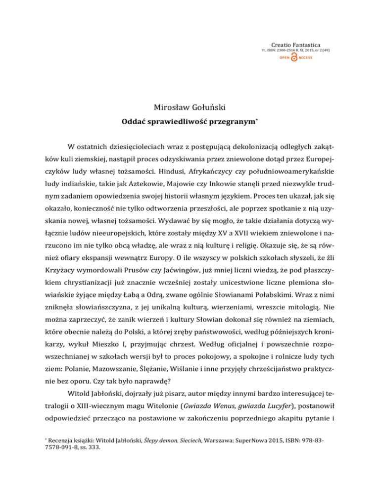 Creatio Fantastica PL ISSN: 2300-2514 R. XI, 2015, nr 2 (49) Mirosław Gołuński Oddać sprawiedliwość przegranym* W ostatnich dziesięcioleciach wraz z postępującą dekolonizacją odległych zakątków kuli ziemskiej, nastąpił proces odzyskiwania przez zniewolone dotąd przez Europejczyków ludy własnej tożsamości. Hindusi, Afrykańczycy czy południowoamerykańskie ludy indiańskie, takie jak Aztekowie, Majowie czy Inkowie stanęli przed niezwykle trudnym zadaniem opowiedzenia swojej historii własnym językiem. Proces ten ukazał, jak się okazało, konieczność nie tylko odtworzenia przeszłości, ale poprzez spotkanie z nią uzyskania nowej, własnej tożsamości. Wydawać by się mogło, że takie działania dotyczą wyłącznie ludów nieeuropejskich, które zostały między XV a XVII wiekiem zniewolone i narzucono im nie tylko obcą władzę, ale wraz z nią kulturę i religię. Okazuje się, że są również ofiary ekspansji wewnątrz Europy. O ile wszyscy w polskich szkołach słyszeli, że źli Krzyżacy wymordowali Prusów czy Jaćwingów, już mniej liczni wiedzą, że pod płaszczykiem chrystianizacji już znacznie wcześniej zostały unicestwione liczne plemiona słowiańskie żyjące między Łabą a Odrą, zwane ogólnie Słowianami Połabskimi. Wraz z nimi zniknęła słowiańszczyzna, z jej unikalną kulturą, wierzeniami, wreszcie mitologią. Nie można zaprzeczyć, że zanik wierzeń i kultury Słowian dokonał się również na ziemiach, które obecnie należą do Polski, a której zręby państwowości, według późniejszych kronikarzy, wykuł Mieszko I, przyjmując chrzest. Według oficjalnej i powszechnie rozpowszechnianej w szkołach wersji był to proces pokojowy, a spokojne i rolnicze ludy tych ziem: Polanie, Mazowszanie, Ślężanie, Wiślanie i inne przyjęły chrześcijaństwo praktycznie bez oporu. Czy tak było naprawdę? Witold Jabłoński, dojrzały już pisarz, autor między innymi bardzo interesującej tetralogii o XIII-wiecznym magu Witelonie (Gwiazda Wenus, gwiazda Lucyfer), postanowił odpowiedzieć przecząco na postawione w zakończeniu poprzedniego akapitu pytanie i Recenzja książki: Witold Jabłoński, Ślepy demon. Sieciech, Warszawa: SuperNowa 2015, ISBN: 978-837578-091-8, ss. 333. * rozpoczął pracę nad inną historią Polski epoki wczesnopiastowskiej. Nie mogę powiedzieć alternatywną, ponieważ w przeciwieństwie do licznych dziś (i na ogół mało udanych) historii alternatywnych (ostatni przykład to choćby Wysłanniczka bogini i Królowa Joanna d’Arc Konrada T. Lewandowskiego zawarte w tomie Utopie) Jabłoński nie zamierza opowiadać nam, co by było gdyby. Postawił sobie zadanie trudniejsze i zdecydowanie ambitniejsze – opowiedzieć historię tamtych czasów z perspektywy tych, którzy Chrystusa wcale przyjąć nie chcieli, uważając go za obcego i wrogiego boga. A zdaniem pisarza, wcale nie było ich tak mało. Dwa lata temu do rąk czytelników trafiła powieść Słowo i miecz, opowiadająca „wymazaną” przez kronikarzy-zakonników historię buntu Miecława, który w czasie bezkrólewia po nieoczekiwanej śmierci Mieszka II próbował wywalczyć dla siebie własne państwo – Mazowsze, ze stolicą w Płocku. Według niektórych badaczy bunt ten miał ścisły związek z reakcją pogańską wywołaną przez zwolenników dawnej wiary, która objęła niemal całą Polskę. Dopiero po blisko dekadzie zarówno reakcję, jak i bunt Miecława stłumił krwawo Kazimierz Odnowiciel, syn Mieszka II. Autor deklaruje w zakończeniu tej powieści, że nie wierzy przekazom kronikarzy, gdyż byli oni ideologicznie zainteresowani umniejszeniem „pogańskiego” oporu wobec nowej wiary i zohydzeniem (co szczególnie udało się Wincentemu Kadłubkowi) postaci Miecława (co ciekawe, tym zohydzającym tropem poszedł w XIX wieku Józef Ignacy Kraszewski, pisząc swego Masława – to oboczna wersja imienia Miecław). Jeżeli nieco miejsca poświęciłem poprzedniej powieści Jabłońskiego, to dlatego, że właśnie wydany Ślepy demon. Sieciech jest nie tylko ideologiczną, ale również fabularną kontynuacją Słowa i miecza. Przesuwamy się w czasie o mniej więcej pół wieku: w toku powieści przyglądamy się wydarzeniom rozgrywającym się między 1063 a 1076 rokiem. O ile pierwsza data wybrana jest nieco arbitralnie, zwieńczeniem tomu jest koronacja Bolesława Śmiałego (a więc syna Kazimierza Odnowiciela) na króla Polski. Podobnie jak w poprzedniej powieści narracyjną klamrą utworu są zarysowane w prologu wydarzenia, do których zmierza akcja całej powieści. Przed oczami czytelnika przewija się korowód postaci, które poznał w poprzedniej powieści: matka Miecława, Żywia (tym razem jako upiorzyca w Nawii), Boranin Andaj – wyśmienity łucznik i towarzysz Żywii w szalonej wyprawie ze Słowa i miecza, nadal zmuszony zabijać nie tylko w obronie własnej; jak i zupełnie nowych: wydobyty przez Żywię z Nawii mag, Kościej, Luba – żona zwolennika Miecława poległego w ostatniej bitwie buntu, wiedźma wierna starym bogom, wreszcie Sieciech – przyszły historycznie wszechmocny palatyn Władysława Hermana, dopiero wspinający się po stopniach kariery, pochodzący z możnego rodu szlachcic, którego ojciec też poległ we wspomnianej bitwie oraz Krystyna. Pochodzenie tej postaci jest bardzo interesujące, gdyż w różnych przekazach jej imię łączone jest z Bolesławem Śmiałym, którego miała być kochanką. Wspominają o niej również inni twórcy piszący o tych czasach, J. I. Kraszewski czy Karol Bunsch. Żaden z nich nie nadał jej jednak tak wielkiego znaczenia, jak Jabłoński, który czyni z niej kochankę zarówno obu Piastów, jak i Sieciecha, a także, tu jednak już wbrew prawdzie historycznej, matkę kluczowej dla całego konceptu opowiadanej nam historii postaci Zbigniewa (w tym sensie pełni ona rolę zbliżoną do Żywii, choć dzieli ją tym razem z Lubą). Oczywiś