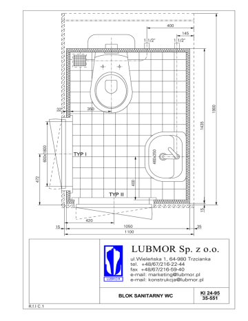 400 145 1 1/2" 1900 1 1/2" 350 460x350 600x1800 1435 32 400 472 TYP I 15 TYP II 420 1050 1100 15 35 LUBMOR Sp. z o.o. LUBMOR ul.Wieleñska 1, 64-980 Trzcianka tel. +48/67/216-22-44 fax +48/67/216-59-40 e-mail: [email protected] e-mail: [email protected] BLOK SANITARNY WC R.f.l C.1 KI 24-95 35-551 BLOK SANITARNY WC PRZEZNACZENIE WYROBU Blok sanitarny WC przeznaczony jest do montażu na statkach jako kompletna łazienka do obsługi kabin załogi lub pasażerów. Blok taki może być również zainstalowany w pomieszczeniach budynków lądowych. WYKONANIE WYROBU Korpus bloku wykonany jest ze ścianek o grubości 33 mm utworzonych z kaset z blachy stalowej ocynkowanej wypełnionych wełną mineralną. Kasety wewnętrzne ścianek o grubości 0,75 mm - pokryte folią PCV, lub o grubości 1,5 mm - wyklejone płytkami ceramicznymi. Kasety zewnętrzne mają grubość 0,75 mm. Podłoga wykonana jest z blachy stalowej o grubości 4mm i obustronnie zabezpieczona antykorozyjnie i wyklejona płytkami ceramicznymi przeciwpoślizgowymi. Sufit tworzą dwie blachy stalowe ocynkowane o grubości 0,75mm izolowane wewnątrz wełną mineralną. Kasety dolne ścianek sufitowych pokryte są folią PCV lub powłoką lakierniczą. W bloku zamontowane są drzwi klasy B-15 ze skrzydłem wykonanym z blachy pokrytej folią PCV i wypełnionym wełną mineralną lub z płyty mineralnej pokrytej laminatem dekoracyjnym. Wyposażenie bloku mogą stanowić : - uchwyty sztormowe - miska ustępowa wisząca - umywalka z baterią - wieszaki na ręcznik - anemostat wyciągowy ∅80mm/∅100mm - koszyk na mydło - grzejnik elektryczny 400W - szczotka WC - szafka toaletowa lub lustro - uchwyt na papier toaletowy + zapasowy - lampa naścienna z gniazdkiem do golarki - inne wg życzenia Rurociągi doprowadzające ciepłą i zimną wodę izolowane są przeciwpotnie. Rurociągi wewnątrz bloku pokryte są powłoką niklowo-chromową. ZAKRES DOSTAWY Dostawa obejmuje kompletnie wyposażony blok sanitarny przystosowany do podłączenia do instalacji wodnej i elektrycznej. Blok sanitarny może być dostarczony w całości lub w częściach (do zamontowania w miejscu przeznaczenia). OPAKOWANIE, TRANSPORT, MAGAZYNOWANIE Bloki sanitarne opakowane są folią, drzwi zabezpieczone są płytą pilśniową. Przemieszczanie bloków odbywa się za pomocą wózków widłowych lub dźwigów. Muszą być składowane w zamkniętych pomieszczeniach magazynowych. Bloki sanitarne dostarczane w częściach pakowane są w skrzynie drewniane. PODZIAŁ, OZNACZENIE I WYKOŃCZENIE Odmiany : P - prawy jak na rysunku L - lewy jako lustrzane odbicie Typy : I - jak na rysunku II - jak na rysunku Kierunki otwierania drzwi : A-L/P - drzwi otwierane na zewnątrz lewe lub prawe Wyposażenie : 1 - umywalka 5 - miska ustępowa Rodzaj spłukiwania : a - grawitacyjny c - podciśnieniowy PRZYKŁAD OZNACZENIA Blok sanitarny WC o wymiarach 1100x1900 prawy, typu I z drzwiami prawymi otwieranymi na zewnątrz wyposażony w umywalkę, miskę ustępową z grawitacyjnym spłukiwaniem. BLOK SANITARNY WC 1100x1900 P-IA-P-15a wg karty informacyjne nr KI 24-95/35-551.