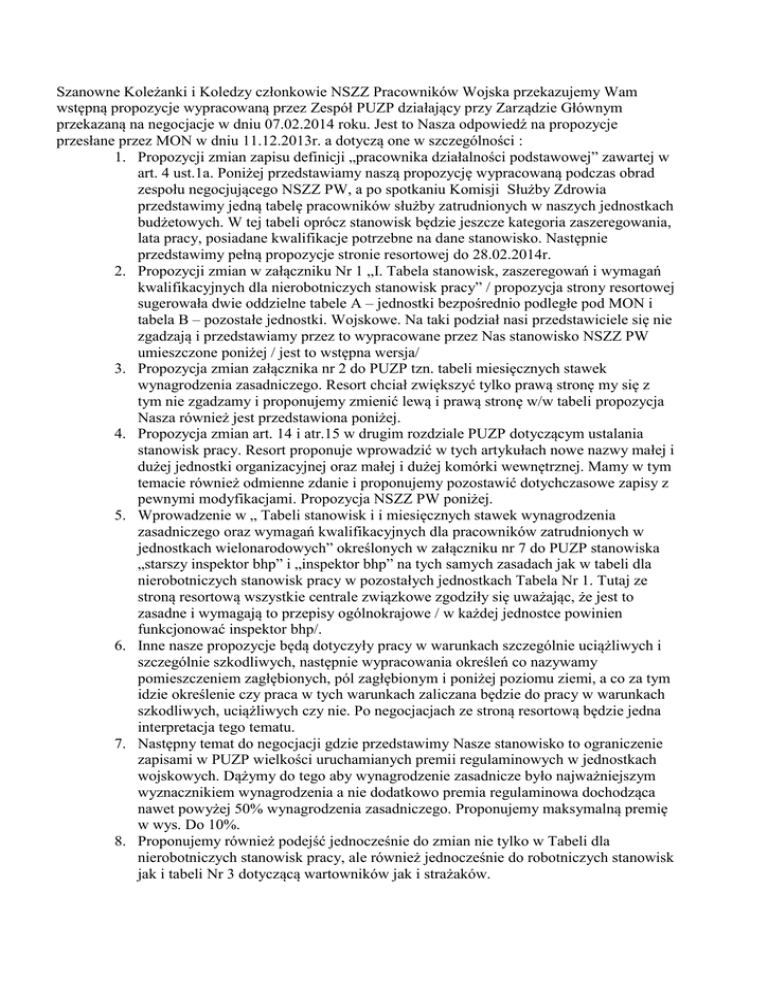 Szanowne Koleżanki i Koledzy członkowie NSZZ Pracowników Wojska przekazujemy Wam wstępną propozycje wypracowaną przez Zespół PUZP działający przy Zarządzie Głównym przekazaną na negocjacje w dniu 07.02.2014 roku. Jest to Nasza odpowiedź na propozycje przesłane przez MON w dniu 11.12.2013r. a dotyczą one w szczególności : 1. Propozycji zmian zapisu definicji „pracownika działalności podstawowej” zawartej w art. 4 ust.1a. Poniżej przedstawiamy naszą propozycję wypracowaną podczas obrad zespołu negocjującego NSZZ PW, a po spotkaniu Komisji Służby Zdrowia przedstawimy jedną tabelę pracowników służby zatrudnionych w naszych jednostkach budżetowych. W tej tabeli oprócz stanowisk będzie jeszcze kategoria zaszeregowania, lata pracy, posiadane kwalifikacje potrzebne na dane stanowisko. Następnie przedstawimy pełną propozycje stronie resortowej do 28.02.2014r. 2. Propozycji zmian w załączniku Nr 1 „I. Tabela stanowisk, zaszeregowań i wymagań kwalifikacyjnych dla nierobotniczych stanowisk pracy” / propozycja strony resortowej sugerowała dwie oddzielne tabele A – jednostki bezpośrednio podległe pod MON i tabela B – pozostałe jednostki. Wojskowe. Na taki podział nasi przedstawiciele się nie zgadzają i przedstawiamy przez to wypracowane przez Nas stanowisko NSZZ PW umieszczone poniżej / jest to wstępna wersja/ 3. Propozycja zmian załącznika nr 2 do PUZP tzn. tabeli miesięcznych stawek wynagrodzenia zasadniczego. Resort chciał zwiększyć tylko prawą stronę my się z tym nie zgadzamy i proponujemy zmienić lewą i prawą stronę w/w tabeli propozycja Nasza również jest przedstawiona poniżej. 4. Propozycja zmian art. 14 i atr.15 w drugim rozdziale PUZP dotyczącym ustalania stanowisk pracy. Resort proponuje wprowadzić w tych artykułach nowe nazwy małej i dużej jednostki organizacyjnej oraz małej i dużej komórki wewnętrznej. Mamy w tym temacie również odmienne zdanie i proponujemy pozostawić dotychczasowe zapisy z pewnymi modyfikacjami. Propozycja NSZZ PW poniżej. 5. Wprowadzenie w „ Tabeli stanowisk i i miesięcznych stawek wynagrodzenia zasadniczego oraz wymagań kwalifikacyjnych dla pracowników zatrudnionych w jednostkach wielonarodowych” określonych w załączniku nr 7 do PUZP stanowiska „starszy inspektor bhp” i „inspektor bhp” na tych samych zasadach jak w tabeli dla nierobotniczych stanowisk pracy w pozostałych jednostkach Tabela Nr 1. Tutaj ze stroną resortową wszystkie centrale związkowe zgodziły się uważając, że jest to zasadne i wymagają to przepisy ogólnokrajowe / w każdej jednostce powinien funkcjonować inspektor bhp/. 6. Inne nasze propozycje będą dotyczyły pracy w warunkach szczególnie uciążliwych i szczególnie szkodliwych, następnie wypracowania określeń co nazywamy pomieszczeniem zagłębionych, pól zagłębionym i poniżej poziomu ziemi, a co za tym idzie określenie czy praca w tych warunkach zaliczana będzie do pracy w warunkach szkodliwych, uciążliwych czy nie. Po negocjacjach ze stroną resortową będzie jedna interpretacja tego tematu. 7. Następny temat do negocjacji gdzie przedstawimy Nasze stanowisko to ograniczenie zapisami w PUZP wielkości uruchamianych premii regulaminowych w jednostkach wojskowych. Dążymy do tego aby wynagrodzenie zasadnicze było najważniejszym wyznacznikiem wynagrodzenia a nie dodatkowo premia regulaminowa dochodząca nawet powyżej 50% wynagrodzenia zasadniczego. Proponujemy maksymalną premię w wys. Do 10%. 8. Proponujemy również podejść jednocześnie do zmian nie tylko w Tabeli dla nierobotniczych stanowisk pracy, ale również jednocześnie do robotniczych stanowisk jak i tabeli Nr 3 dotyczącą wartowników jak i strażaków. Załącznik nr 1 do Ponadzakładowego Układu Zbiorowego Pracy dla Pracowników Wojskowych Jednostek Organizacyjnych Sfery Budżetowej z dnia 8 czerwca 1998 r. I. Lp. 1 2 3 4. 5 6 7 8 9 TABELA STANOWISK, ZASZEREGOWAŃ I WYMAGAŃ KWALIFIKACYJNYCH DLA NIEROBOTNICZYCH STANOWISK PRACY Nazwa stanowiska Kategoria zaszeregowania Wymagane kwalifikacje Stawka Liczba dodatku Wykształcenie lat pracy funkcyjnego ogółem Dyrektor/Kierownik/ jednostki budżetowej Zastępca Szefa Inspektoratu Uzbrojenia /XXI-XXIII/ XX-XXII 9-10 wyższe 8 XXI-XXIII 8-9 wyższe 8 Naczelny kapelan / ordynariusz XX-XXII 9-10 XX-XXII 9-10 wyższe 8 /XX-XXII/ XIX-XXI 7-8 wyższe 6 XIX-XXI 9-10 wyższe /5 8 /XX-XXII/ XIX-XXI 7-8 wyższe 6 XVIII-XX 8-9 wyższe /5 6 /XVIII-XX/ XVII-XIX /XVIII-XX/ XVII-XIX 1-3 /3 wg odrębnych przepisów 7-8 wg odrębnych przepisów Dyrektor/Kierownik./ jednostki organizacyjnej bezpośrednio podległej pod MON Zastępca dyrektora/kierownika/ jednostki budżetowej Dyrektor Centralnej Biblioteki Wojskowej Zastępca dyrektora/kierownika/ jednostki organizacyjnej podległej pod MON Zastępca Dyrektora Centralnej Biblioteki Wojskowej Kierownik audytu wewnętrznego 10 Główny księgowy Dyrektor/Kierownik/ innej 11 jednostki organizacyjnej niż wymieniona w lp. 4 /XVIII-XX/ XVII-XIX 7-8 12 Audytor wewnętrzny /XVII-XIX/ XVI-XVIII - Zastępca dyrektora/Kierownika/ 13 innej jednostki organizacyjnej niż wymieniona w lp. 4 /XVII-XIX/ XVI-XVIII 6-7 14 Zastępca głównego księgowego 15 Kierownik zespołu inspektorów nadzoru inwestorskiego 16 Główny analityk /XVI-XVIII/ XV-XVII /XVI-XVIII/ XV-XVII XVI-XVIII wg odrębnych przepisów wyższe /kierunkowe/ 8 wg odrębnych przepisów wyższe /kierunkowe/ 6 4-6 wg odrębnych przepisów 4-6 wg odrębnych przepisów 4-6 Wyższe 6 17 Główny informatyk 18 Główny specjalista 19 Główny specjalista bhp 20 Radca prawny Starszy inspektor nadzoru inwestorskiego Starszy inspektor technicznego 22 utrzymania nieruchomości Starszy inspektor dozoru 23 technicznego Psycholog - konsultant dowódcy 24 ds. profilaktyki psychologicznej 21 25 Kanclerz /6 26 Starszy kustosz dyplomowany /4 Pełnomocnik ds. ochrony informacji niejawnych Kierownik samodzielnej 28 komórki organizac