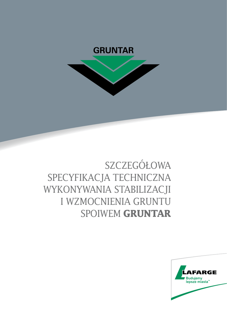 Szczegółowa specyfikacja techniczna wykonywania stabilizacji i wzmocnienia gruntu spoiwem Gruntar Spis treści 1. Wstęp���������������������������������������������������������������������������������������4 1.1 Zakres stosowania SST �����������������������������������������������������������4 1.2 Zakres robót objętych SST �������������������������������������������������������4 1.3 Definicje �������������������������������������������������������������������������������5 2. M ateriały do wykonywania ulepszenia podłoża i stabilizacji���������������������������������������������������������6 SZCZEGÓŁOWA SPECYFIKACJA TECHNICZNA WYKONYWANIA STABILIZACJI I WZMOCNIENIA GRUNTU SPOIWEM GRUNTAR 2.1 Spoiwo GRUNTAR �����������������������������������������������������������������6 2.2 Ulepszanie gruntu spoiwem GRUNTAR �������������������������������������7 2.3 Stabilizacja gruntu spoiwem GRUNTAR�������������������������������������7 3. W ykonawstwo robót z użyciem spoiwa GRUNTAR �����������������������������������������������������������������������������10 3.1 Warunki przystąpienia do robót wzmacniających podłoże�������������������������������������������������������������������������������10 3.2 Badania przydatności podłoża oraz jego ulepszenia�������������������10 3.3 Projektowanie składu mieszanki podłoża i stabilizacji�����������������14 3.4 Zagęszczanie wykonanej warstwy �������������������������������������������17 3.5 Pielęgnacja warstw wzmocnionego podłoża/stabilizacji���������������17 4. Badania laboratoryjne�����������������������������������������������������18 4.1 Przygotowanie próbek stabilizacji do badań wytrzymałości�����������������������������������������������������������������������18 4.2 Pielęgnacja próbek ���������������������������������������������������������������18 4.3 Badanie wytrzymałości próbek na ściskanie�����������������������������19 4.4 Klasyfikacja wyników badań stabilizacji�����������������������������������20 5. Bezpieczeństwo i higiena pracy�����������������������������������21 6. Normy i dokumenty odniesienia���������������������������������22 Małogoszcz, 25.02.2013 3 1. Wstęp 1.1 Zakres stosowania SST 1.3 Definicje Zakres stosowania szczegółowej specyfikacji technicznej (SST) stanowi podstawę do opracowywania technologii wykonywania i projektowania wzmocnień podłoży i stabilizacji, jak i prawidłowego wykorzystania spoiwa GRUNTAR w robotach drogowych, zgodnych z właściwościami technicznymi spoiwa, zawartymi w Aprobacie Technicznej IBDiM nr AT/2011-02-2775: Podłoże drogowe – grunt rodzimy lub nasypowy zalegający pod nawierzchnią drogową na głębokości poniżej strefy przemarzania lub do głębokości, na której naprężenia pionowe od projektowanych obciążeń ruchem wynoszą powyżej 0,02 MPa. 1.2 Zakres robót objętych niniejszą SST Zakres robót z zastosowaniem spoiwa GRUNTAR rekomendowanych Aprobatą Techniczną IBDiM nr AT/2011-02-2775: •wzmacnianie podłoży nawierzchni wg wymagań zawartych w PN-S-96012, •wykonywanie podbudowy pomocniczej i zasadniczej, stabilizowanej mechanicznie wg PN-S-06102, •wykonywanie stabilizowanej podbudowy pomocniczej i zasadniczej wg PN-S-06102 dla kategorii obciążania ruchem KR1 do KR6 wg „Katalogu typowych konstrukcji nawierzchni podatnych i półsztywnych”, •ulepszanie gruntów przy budowie podłoży nasypów i warstw nasypów wg PN-S-02205, •budowa nawierzchni twardej nieulepszonej z zabezpieczeniem górnej powierzchni natryskiem emulsją asfaltową lub warstwą kruszywa grubego, •ulepszanie i uszczelnianie podłoży na składowiskach odpadów oraz rewitalizacja terenów zdegradowanych, Podłoże ulepszone – podłoże drogowe o poprawionej nośności w celu przejęcia obciążeń od ruchu budowlanego i właściwego wykonania nawierzchni, spełniające wymagania określone w normie PN-S-02