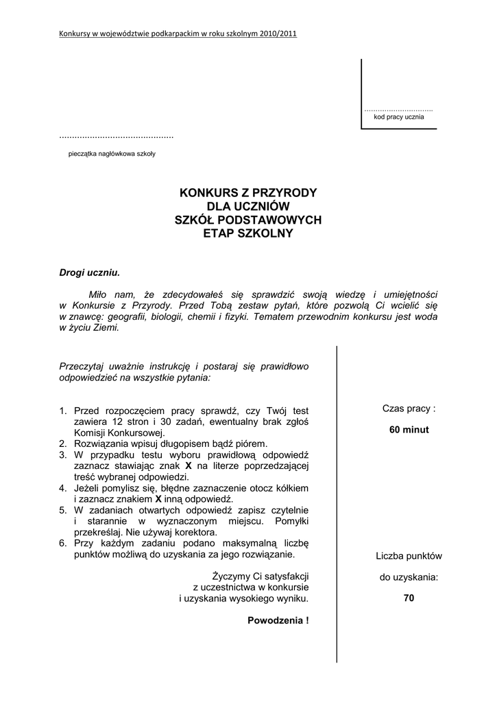 Konkursy w województwie podkarpackim w roku szkolnym 2010/2011 …………………………. kod pracy ucznia ............................................. pieczątka nagłówkowa szkoły KONKURS Z PRZYRODY DLA UCZNIÓW SZKÓŁ PODSTAWOWYCH ETAP SZKOLNY Drogi uczniu. Miło nam, że zdecydowałeś się sprawdzić swoją wiedzę i umiejętności w Konkursie z Przyrody. Przed Tobą zestaw pytań, które pozwolą Ci wcielić się w znawcę: geografii, biologii, chemii i fizyki. Tematem przewodnim konkursu jest woda w życiu Ziemi. Przeczytaj uważnie instrukcję i postaraj się prawidłowo odpowiedzieć na wszystkie pytania: 1. Przed rozpoczęciem pracy sprawdź, czy Twój test zawiera 12 stron i 30 zadań, ewentualny brak zgłoś Komisji Konkursowej. 2. Rozwiązania wpisuj długopisem bądź piórem. 3. W przypadku testu wyboru prawidłową odpowiedź zaznacz stawiając znak X na literze poprzedzającej treść wybranej odpowiedzi. 4. Jeżeli pomylisz się, błędne zaznaczenie otocz kółkiem i zaznacz znakiem X inną odpowiedź. 5. W zadaniach otwartych odpowiedź zapisz czytelnie i starannie w wyznaczonym miejscu. Pomyłki przekreślaj. Nie używaj korektora. 6. Przy każdym zadaniu podano maksymalną liczbę punktów możliwą do uzyskania za jego rozwiązanie. Życzymy Ci satysfakcji z uczestnictwa w konkursie i uzyskania wysokiego wyniku. Powodzenia ! Czas pracy : 60 minut Liczba punktów do uzyskania: 70 Konkursy w województwie podkarpackim w roku szkolnym 2010/2011 Zadanie 1. [ 0 - 1] Podkreśl 5 cech, które charakteryzują środowisko wodne: duże wahania temperatury, zmienna ilość tlenu, duża przejrzystość, duża gęstość, mała przejrzystość, mała gęstość, małe wahania temperatury, stała wilgotność. Zadanie 2. [ 0 - 2 ] Poniżej podano różne substancje. Wpisz do tabeli substancje dzieląc je na rozpuszczalne w wodzie i nierozpuszczalne w wodzie: mąka, siarka, olej, jodyna, miód, cukier, kwasek cytrynowy, less, tlen. Substancje rozpuszczalne w wodzie Substancje nierozpuszczalne w wodzie ……………………………………. ……………………………………… .....………………………………… …………………………………….. .….………………………………… ……………………………………. Zadanie 3. [ 0 - 3 ] Sporządzono mieszaninę, w której skład wchodził piasek i woda. Wodę zanieczyszczoną piaskiem pozostawiono na jakiś czas w szklanym naczyniu. A. Jaki rodzaj mieszaniny uzyskano? ………………………………………………………………………………….…… ………………………………………………………………………………………. B. Co należało przygotować, aby wykonać to doświadczenie? ………………………………………………………………………………….…… …………………………………………………………………………………….... C. W jaki sposób można rozdzielić otrzymaną mieszaninę ? Podaj jeden sposób: …………………………………………………………………………………….… ………………………………………………………………………………………. Strona 2 z 12 Konkursy w województwie podkarpackim w roku szkolnym 2010/2011 Zadanie 4. [ 0 - 1 ] Proces rozpuszczania substancji stałej w wodzie polega na: A. wzajemnym wymieszaniu się drobin substancji rozpuszczanej z drobinami wody, B. zniszczeniu kryształków substancji rozpuszczanej, C. rozbiciu drobin substancji rozpuszczanej pod wpływem drobin wody, D. wnikaniu drobin wody w drobiny substancji rozpuszczanej. Zadanie 5. [ 0 - 1 ] Przyczyną krążenia wody w przyrodzie jest przede wszystkim: A. B. C. D. słońce, niska temperatura, duża ilość wody, temperatura powyżej 00 C. Zadanie 6. [ 0 - 3 ] Woda na Ziemi występuje w trzech stanach skupienia: ciekłym, stałym i gazowym. A. Przejście wody ze stanu stałego w stan ciekły nazywamy……….…….… B. Woda ze stanu stałego w stan ciekły przechodzi w temperaturze………. C. Woda przechodząc ze stanu stałego w stan ciekły……….. ciepło. pobiera / oddaje Zadanie 7. [ 0 - 1 ] Mniejsza część góry lodowej pływa nad wodą, a większa jest zanurzona w wodzie. Podaj, jaka wielkość fizyczna to powoduje i dlaczego? Odpowiedź: …………………………………………………………………. ………………… ……………………………………………… ………………… ……………………………………………… ……………………………………………………………….... Strona 3 z 12 Konkursy w województwie podkarpackim w roku szkolnym 2010/2011 Zadanie 8. [ 0 - 1 ] Do podanych typów środowisk przyrodniczych dobierz ich opis. Wpisz w kwadraty odpowiednie cyfry. 1. Naturalny śródlądowy zbiornik wodny, którego występowanie uwarunkowane jest istnieniem zagłębienia, w którym mogą gromadzić się wody powierzchniowe. 2. Sztuczny ciek wodny, fragment drogi wodnej, którego celem jest połączenie istniejących naturalnych dróg wodnych. 3. Prowadzą wodę przez cały rok, zasilane są wodami podziemnymi i wodami ze spływu powierzchniowego, pochodzącego z deszczów i roztopów. rzeka jezioro kanał Zadanie 9. [ 0 - 2 ] Na rysunku przedstawiono środkowy odcinek biegu rzeki. Nazwij formy oznaczone numerami. 1. ………………………………………………………………………………………. 2. ……………………………………………………………………………………… Zadanie 10. [ 0 - 4 ] Aby obejrzeć komórki skórki liścia trzykrotki pod mikroskopem należy wykonać preparat mikroskopowy. Napisz, co użyjesz z zestawu do mikroskopowania do wykonania tego preparatu? Odpowiedź: 1. ……………………………………………… 2. ……………………………………