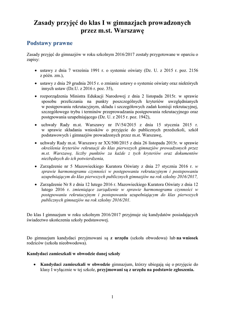 Zasady przyjęć do klas I w gimnazjach prowadzonych przez m.st. Warszawę Podstawy prawne Zasady przyjęć do gimnazjów w roku szkolnym 2016/2017 zostały przygotowane w oparciu o zapisy: ustawy z dnia 7 września 1991 r. o systemie oświaty (Dz. U. z 2015 r. poz. 2156 z późn. zm.), ustawy z dnia 29 grudnia 2015 r. o zmianie ustawy o systemie oświaty oraz niektórych innych ustaw (Dz.U. z 2016 r. poz. 35), rozporządzenia Ministra Edukacji Narodowej z dnia 2 listopada 2015r. w sprawie sposobu przeliczania na punkty poszczególnych kryteriów uwzględnianych w postępowaniu rekrutacyjnym, składu i szczegółowych zadań komisji rekrutacyjnej, szczegółowego trybu i terminów przeprowadzania postępowania rekrutacyjnego oraz postępowania uzupełniającego (Dz. U. z 2015 r. poz. 1942), uchwały Rady m.st. Warszawy nr IV/54/2015 z dnia 15 stycznia 2015 r. w sprawie składania wniosków o przyjęcie do publicznych przedszkoli, szkół podstawowych i gimnazjów prowadzonych przez m.st. Warszawę, uchwały Rady m.st. Warszawy nr XX/500/2015 z dnia 26 listopada 2015r. w sprawie określenia kryteriów rekrutacji do klas pierwszych gimnazjów prowadzonych przez m.st. Warszawę, liczby punktów za każde z tych kryteriów oraz dokumentów niezbędnych do ich potwierdzenia, Zarządzenie nr 5 Mazowieckiego Kuratora Oświaty z dnia 27 stycznia 2016 r. w sprawie harmonogramu czynności w postępowaniu rekrutacyjnym i postepowaniu uzupełniającym do klas pierwszych publicznych gimnazjów na rok szkolny 2016/2017, Zarządzenie Nr 8 z dnia 12 lutego 2016 r. Mazowieckiego Kuratora Oświaty z dnia 12 lutego 2016 r. zmieniające zarządzenie w sprawie harmonogramu czynności w postępowaniu rekrutacyjnym i postepowaniu uzupełniającym do klas pierwszych publicznych gimnazjów na rok szkolny 2016/201. Do klas I gimnazjum w roku szkolnym 2016/2017 przyjmuje się kandydatów posiadających świadectwo ukończenia szkoły podstawowej. Do gimnazjum kandydaci przyjmowani są z urzędu (szkoła obwodowa) lub na wniosek rodziców (szkoła nieobwodowa). Kandydaci zamieszkali w obwodzie danej szkoły Kandydaci zamieszkali w obwodzie gimnazjum, którzy ubiegają się o przyjęcie do klasy I wyłącznie w tej szkole, przyjmowani są z urzędu na podstawie zgłoszenia. 1 Kandydaci spoza obwodu Kandydaci, dla których wybrana szkoła nie jest szkołą obwodową, biorą udział w postępowaniu rekrutacyjnym. Mogą ubiegać się o przyjęcie do dowolnie wybranych szkół, układając własną listę preferencji. Szkoła umieszczona na pierwszym miejscu listy jest tzw. szkołą pierwszego wyboru. Niezależnie od liczby wybranych szkół, rodzice/prawni opiekunowie składają wniosek o przyjęcie kandydata wyłącznie w szkole pierwszego wyboru. Umieszczenie na liście preferencji (na dowolnej pozycji) szkoły obwodowej oznacza, że kandydat ma w niej zapewnione miejsce w sytuacji, gdy nie zostanie zakwalifikowany do innej szkoły. Laureaci i finaliści Zgodnie z art. 20d ust. 1 laureat lub finalista ogólnopolskiej olimpiady przedmiotowej oraz laureat konkursu przedmiotowego o zasięgu wojewódzkim lub ponadwojewódzkim, przeprowadzonych zgodnie z przepisami wydanymi na podstawie art. 22 ust. 2 pkt 8, są przyjmowani w pierwszej kolejności do publicznego gimnazjum, publicznego gimnazjum integracyjnego, publicznego gimnazjum dwujęzycznego, oddziału dwujęzycznego w publicznym gimnazjum ogólnodostępnym, oddziału międzynarodowego w publicznym gimnazjum ogólnodostępnym, oddziału integracyjnego w publicznym gimnazjum ogólnodostępnym. Zgodnie z art. 20d ust. 2 laureat lub finalista ogólnopolskiej olimpiady przedmiotowej oraz laureat konkursu przedmiotowego o zasięgu wojewódzkim lub ponadwojewódzkim, przeprowadzonych zgodnie z przepisami wydanymi na podstawie art. 22 ust. 2 pkt 8, są przyjmowani w pierwszej kolejności do publicznego gimnazjum sportowego, publicznego gimnazjum mistrzostwa sportowego, oddziału sportowego w publicznym gimnazjum ogólnodostępnym, jeżeli uzyskali pozytywne wyniki prób sprawności fizycznej. Postępowanie rekrutacyjne na rok szkolny 2016/2017 będzie prowadzone z wykorzystaniem systemu informatycznego, w terminach określonych w harmonogramie rekrutacji. Włączenie się w postępowanie rekrutacyjne musi nastąpić pomiędzy datą rozpoczęcia zapisów a datą ich zakończenia jednak: data i godzina wprowadzenia danych dziecka do systemu informatycznego, data i godzina wydrukowania wniosku, data i godzina złożenia wniosku w szkole, data i godzina zatwierdzenia wniosku nie będą miały żadnego wpływu na przyjęcie kandydata. Rodzice/prawni opiekunowie: wypełniają w systemie informatycznym wniosek/zgłoszenie, drukują wypełniony wniosek/zgłoszenie i po podpisaniu przez oboje rodziców/prawnych opiekunów, składają go w gimnazjum pierwszego wyboru. 2 Podpisy złożone na wniosku/zgłoszeniu są potwierdzeniem zgodności podanych informacji ze stanem faktycznym. Za sprawdzenie i potwierdzenie zgodności informacji zawartych we wniosku/zgłoszeniu z informacjami w systemie informatycznym oraz wydanie potwierdzenia przyjęcia wniosku/zgłoszenia odpowiedzialny jest dyrektor gimnazjum pierwszego wyboru/szkoły obwodowej albo upoważniony pracownik szkoły. Do wniosku rodzice/prawni opiekunowie dołączają, określone w ustawie o systemie oświaty, rozporządzeniu MEN w sprawie przeliczania na poszczególne punkty (…) oraz uchwale Nr XX/500/2015 Rady m.st. Warszawy, oświadczenia oraz dokumenty potwierdzające spełnianie kryteriów. Oświadczenia składa się pod rygorem odpowiedzialności karnej za składanie fałszywych zeznań. Składający oświadczenie jest obowiązany do zawarcia w nim klauzuli następującej treści: „Jestem świadomy odpowiedzialności karnej za złożenie fałszywego oświadczenia” (art. 20t ust 6 ustawy o systemie oświaty). Wniosek rozpatruje komisja rekrutacyjna powołana przez dyrektora szkoły. W przypadku nieprzedłożenia dokume