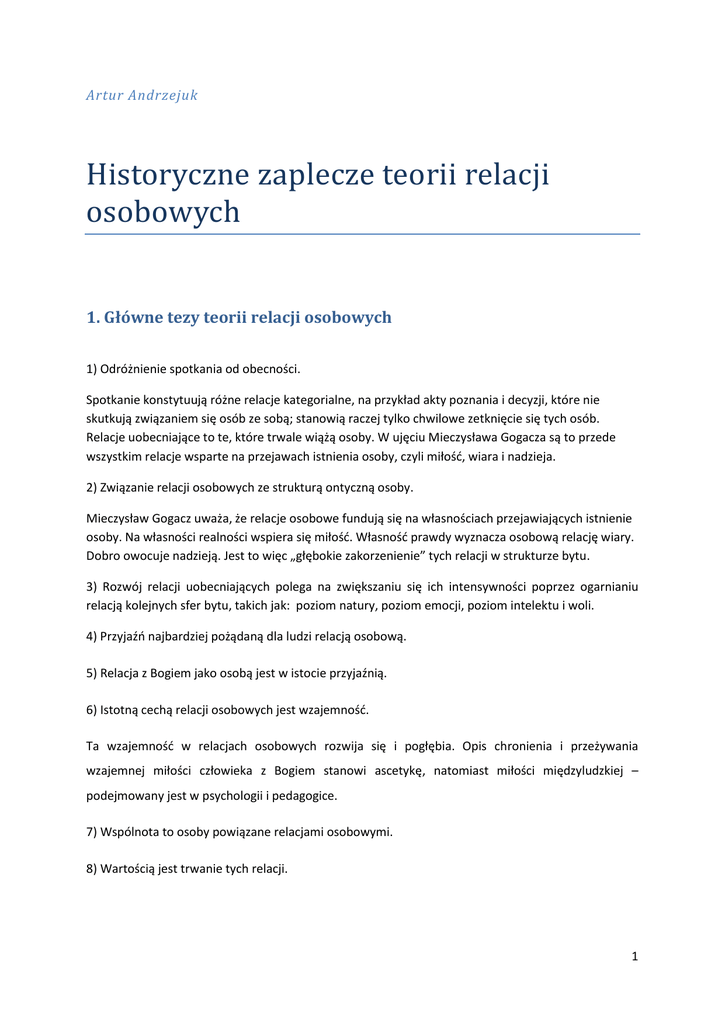 Artur Andrzejuk Historyczne zaplecze teorii relacji osobowych 1. Główne tezy teorii relacji osobowych 1) Odróżnienie spotkania od obecności. Spotkanie konstytuują różne relacje kategorialne, na przykład akty poznania i decyzji, które nie skutkują związaniem się osób ze sobą; stanowią raczej tylko chwilowe zetknięcie się tych osób. Relacje uobecniające to te, które trwale wiążą osoby. W ujęciu Mieczysława Gogacza są to przede wszystkim relacje wsparte na przejawach istnienia osoby, czyli miłość, wiara i nadzieja. 2) Związanie relacji osobowych ze strukturą ontyczną osoby. Mieczysław Gogacz uważa, że relacje osobowe fundują się na własnościach przejawiających istnienie osoby. Na własności realności wspiera się miłość. Własność prawdy wyznacza osobową relację wiary. Dobro owocuje nadzieją. Jest to więc „głębokie zakorzenienie” tych relacji w strukturze bytu. 3) Rozwój relacji uobecniających polega na zwiększaniu się ich intensywności poprzez ogarnianiu relacją kolejnych sfer bytu, takich jak: poziom natury, poziom emocji, poziom intelektu i woli. 4) Przyjaźń najbardziej pożądaną dla ludzi relacją osobową. 5) Relacja z Bogiem jako osobą jest w istocie przyjaźnią. 6) Istotną cechą relacji osobowych jest wzajemność. Ta wzajemność w relacjach osobowych rozwija się i pogłębia. Opis chronienia i przeżywania wzajemnej miłości człowieka z Bogiem stanowi ascetykę, natomiast miłości międzyludzkiej – podejmowany jest w psychologii i pedagogice. 7) Wspólnota to osoby powiązane relacjami osobowymi. 8) Wartością jest trwanie tych relacji. 1 2. Historyczne źródła teorii relacji osobowych 1) Sokrates1 Sokrates radykalnie odróżnił miłość erotyczną (œrwj) od przyjaźni (fil…a). Jest to pierwsze odnotowanie w historii filozofii odróżnienia spotkania od obecności. Wiemy wszyscy, że wszelkie stosunki towarzyskie i nie oparte na przyjaźni nie mają wartości. Miłość zaś przyjacielska jest to swego rodzaju słodka i dobrowolna konieczność dla ludzi, którzy największą wartość przywiązują do charakteru u drugich. Ci jednak, których zmysłowa miłość pożąda ciała, w większości wypadków nie pochwalają, a nawet nie lubią charakteru swoich kochanków. Jeżeli znów inni kochają jednocześnie i ciało, i duszę, to ponieważ kwiat urody szybko przekwita, więc kiedy już całkiem zwiędnie, miłość także musi wygasnąć, podczas gdy im dłużej dąży dusza do coraz to większej doskonałości, tym coraz bardziej staje się godna kochania. Poza tym w rozkoszowaniu się pięknym ciałem tkwi pewna konieczność przesytu, tak że to samo, czego człowiek doznaje przy jedzeniu na skutek przepełnienia żołądka, musi odczuć także przy kochaniu. Miłość duszy natomiast jest czysta, wzniosła i bardzo trudna do nasycenia, a jednak wbrew temu, co niejeden może sądzi, nie jest bynajmniej pozbawiona wdzięku i przyjemności. W niej właśnie spełnia się gorące pragnienie, z jakim w modlitwie zwracamy się do bogini, aby użyczyła wdzięku naszym słowom i czynom2. 2) Platon3 Sokratejske przeciwstawienie œrwj i fil…a zdaje się stanowić dla Platona punkt wyjścia do tezy, że zarówno miłość jak i przyjaźń to w gruncie rzeczy tęsknota za tą samą ideą dobra. Już w dialogu Lizys Platon mówi, że przyjaźń jest tęsknotą za „prîton f…lon”. – Nieprawdaż, i to miłe będzie znowu ze względu na coś innego miłe. – Tak. – Czyż nie musimy utracić tchu po drodze, kiedy się tak będziemy cofali wstecz, albo dojść do jakiegoś początku, który już nas nie odeśle do czegoś innego miłego? To będzie 1 W przypadku poszukiwań formuły interesującego nas tematu w myśli Sokratesa nie za bardzo zdały egzamin znane z literatury przedmiotu sposoby rozwiązywania tak zwanej kwestii sokratycznej, skoro wczesny dialog Lizys zawiera już wyraźnie platońskie rozwiązanie problemu przyjaźni. Wobec tego pozostało nam poszukiwanie w tekstach Platona i Ksenofonta tematów, które z dużym prawdopodobieństwem mogły charakteryzować nauczanie Sokratesa. 2 Uczta, 3 W przypadku Platona, podobnie jak w przypadku Sokratesa, na niewiele się zdały koncepcje rozwoju poglądów Platona, głoszone przez historyków filozofii, gdyż już wczesny dialog Lizys zawiera te same rozwiązania, co Uczta i Fajdros, mające reprezentować „dojrzały okres” twórczości Platona. Wydaje się więc, że najwięcej racji ma Giovanni Reale, twierdząc, że chronologia platońskich dialogów stanowi realizację planu pisarskiego, który Platon powziął w momencie, gdy swoje poglądy filozoficzne miał już przemyślane i ustalone. 2 to pierwsze miłe (prîton f…lon); ze względu na nie wszystkie inne rzeczy są i uchodzą u nas za miłe. – Musi tak być. – Ja to mówię dlatego, żeby was te wszystkie inne rzeczy, któreśmy nazwali miłymi ze względu na tamto pierwsze, nie wprowadzały w błąd. To są jak gdyby jakieś jego widziadła. A tamto pierwsze i jedynie ono tylko jest tym, co naprawdę miłe. Władysław Witwicki widzi w prîton f…lon co najwyżej jakiegoś prekursora platońskiej idei i zgodnie z tą myślą tłumaczy prîton f…lon jako pierwsze miłe. G. Reale jednak uważa, że kontekst dialogu wskazuje wyraźnie, że chodzi o tę samą ideę dobra. – Bo jeśli o czymś mówimy, że nam miłe ze względu na coś innego miłego, to tak wygląda, jakby nasze słowa dotyczyły tego, co miłe. A miłe istotnie gotowo być to na końcu, do czego te tak nazywane, przyjazne pociągi czy upodobania zmierzają. – Gotowo tak być, powiada. – Nieprawdaż. Więc, co istotnie miłe, jest miłe, ale nie ze względu na coś innego? – Prawda. – Zatem tego już nie ma, żeby to, co miłe miało być takim ze względu na coś innego miłego. A może to Dobro jest tym, co miłe? To właśnie idea dobra jest w Uczcie jest celem miłości, natomiast przyczy