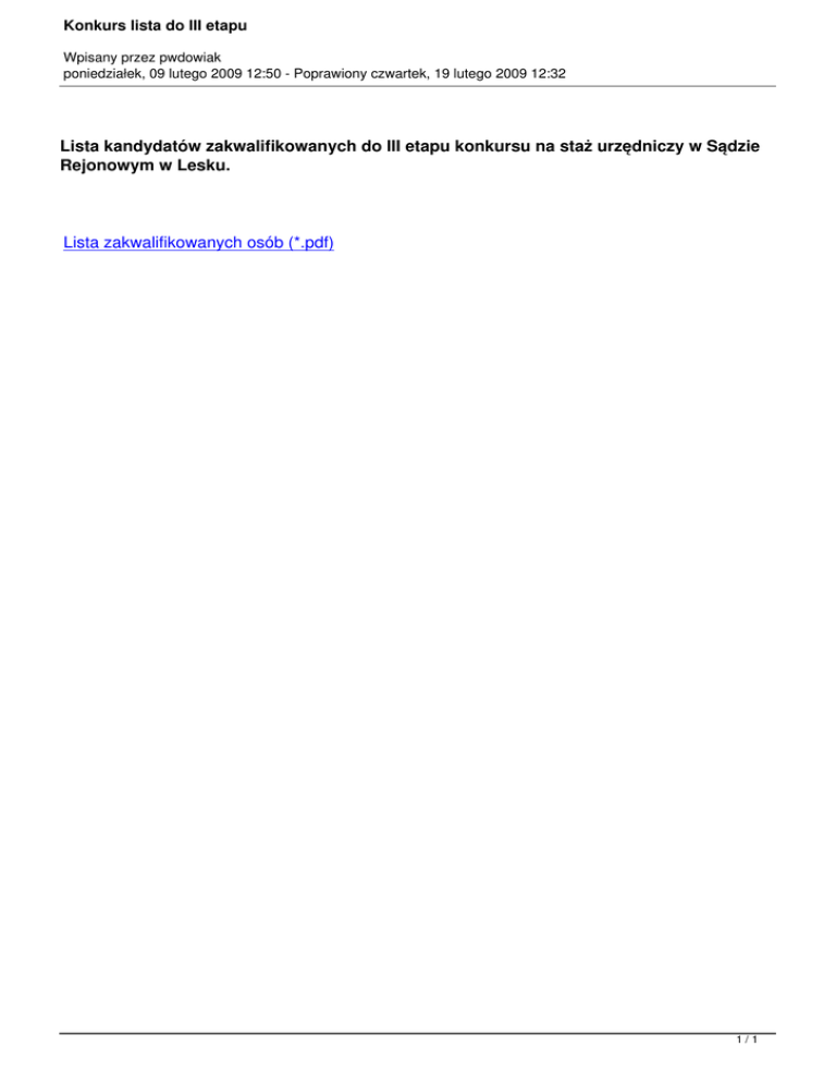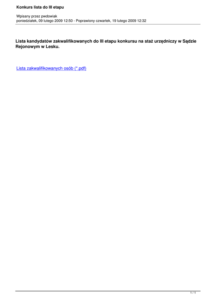 Konkurs lista do III etapu Wpisany przez pwdowiak poniedziałek, 09 lutego 2009 12:50 - Poprawiony czwartek, 19 lutego 2009 12:32 Lista kandydatów zakwalifikowanych do III etapu konkursu na staż urzędniczy w Sądzie Rejonowym w Lesku. Lista zakwalifikowanych osób (*.pdf) 1/1