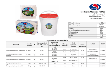 Spółdzielnia Mleczarska "KaMos" ul. Towarowa 41 58-400 Kamienna Góra tel./fax 75 744 23 21 Wartość odżywcza Wartość energetyczna w 100g 555kJ/ 133 kcal 4,7g 2,3g 3,7g 3,7g 18,7g 0,1g Tłuszcz w tym kwasy tłuszczowe nasycone Węglowodany w tym cukry Białko Sól Dane logistyczne produktów Produkt Twaróg sudecki półtłusty ok. 800g w próżni Twaróg sudecki półtłusty ok. 800g w pergaminie Twaróg sudecki półtłusty ok. 400g w próżni Gramatura JM produktu Ok. 800 g Ok. 800 g Ok. 400 g Kg Kg Kg Wymiary produktu (szer. X dł. X wys. w cm) Wymiary op. zbiorczego (szer. X dł. X wys. w cm) 16 x 9 x 5 Op. zwrotne 40 x 60 x 13 Karton 34 x 38 x 11 16 x 9 x 5 10 x 7 x 5 Ilość w op. zbiorczym Ilość na warstwie / plecie EUR 24 szt. 96 szt./960 szt. Kod EAN PKWiU 21 dni 5905433002421 Kod PLU zmiennowagowy 10.51.40.0 590543300043 Kod PLU zmiennowagowy 10.51.40.0 5905433000427 Kod PLU zmienno wagowy 10.51.40.0 Termin przydatności 12 szt. 96 szt./480 szt. Op. zwrotne 40 x 60 x 13 15 kg 60 kg/600 kg 5 dni Op. zwrotne 40 x 60 x 13 48 szt. 288 szt./ 2880 szt. 21 dni Karton 34 x 38 x 11 24 szt. 192 szt./960 szt. Twaróg sudecki półtłusty mielony 5 kg 5 kg Kg 22,5 x 22,5 x 20 Brak Brak Brak 10 dni 10.51.40.0 Twaróg sudecki półtłusty mielony 20 kg 20 kg Kg 32 x 32 x 34 Brak Brak Brak 10 dni 10.51.40.0