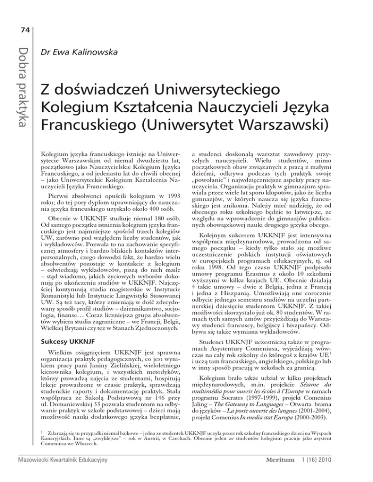 74 Dr Ewa Kalinowska Dobra praktyka Dr Ewa Kalinowska Z doœwiadczeñ Uniwersyteckiego Kolegium Kszta³cenia Nauczycieli Jêzyka Francuskiego (Uniwersytet Warszawski) Kolegium języka francuskiego istnieje na Uniwersytecie Warszawskim od niemal dwudziestu lat, początkowo jako Nauczycielskie Kolegium Języka Francuskiego, a od jedenastu lat do chwili obecnej – jako Uniwersyteckie Kolegium Kształcenia Nauczycieli Języka Francuskiego. Pierwsi absolwenci opuścili kolegium w 1993 roku; do tej pory dyplom uprawniający do nauczania języka francuskiego uzyskało około 400 osób. Obecnie w UKKNJF studiuje niemal 180 osób. Od samego początku istnienia kolegium języka francuskiego jest najmniejsze spośród trzech kolegiów UW, zarówno pod względem liczby studentów, jak i wykładowców. Pozwala to na zachowanie specyficznej atmosfery i bardzo bliskich kontaktów interpersonalnych, czego dowodzi fakt, że bardzo wielu absolwentów pozostaje w kontakcie z kolegium – odwiedzają wykładowców, piszą do nich maile – stąd wiadomo, jakich życiowych wyborów dokonują po ukończeniu studiów w UKKNJF. Najczęściej kontynuują studia magisterskie w Instytucie Romanistyki lub Instytucie Lingwistyki Stosowanej UW. Są też tacy, którzy zmieniają w dość zdecydowany sposób profil studiów – dziennikarstwo, socjologia, finanse… Coraz liczniejsza grupa absolwentów wybiera studia zagraniczne – we Francji, Belgii, Wielkiej Brytanii czy też w Stanach Zjednoczonych. Sukcesy UKKNJF Wielkim osiągnięciem UKKNJF jest sprawna organizacja praktyk pedagogicznych, co jest wynikiem pracy pani Janiny Zielińskiej, wieloletniego kierownika kolegium, i wszystkich metodyków, którzy prowadzą zajęcia ze studentami, hospitują lekcje prowadzone w czasie praktyk, sprawdzają studenckie raporty i dokumentację praktyk. Stała współpraca ze Szkołą Podstawową nr 146 przy ul. Domaniewskiej 33 pozwala studentom na odbywanie praktyk w szkole podstawowej – dzieci mają możliwość nauki dodatkowego języka bezpłatnie, a studenci doskonalą warsztat zawodowy przyszłych nauczycieli. Wielu studentów, mimo początkowych obaw związanych z pracą z małymi dziećmi, odkrywa podczas tych praktyk swoje „powołanie” i najwdzięczniejsze aspekty pracy nauczyciela. Organizacja praktyk w gimnazjum sprawiała przez wiele lat sporo kłopotów, jako że liczba gimnazjów, w których naucza się języka francuskiego jest znikoma. Należy mieć nadzieję, że od obecnego roku szkolnego będzie to łatwiejsze, ze względu na wprowadzenie do gimnazjów publicznych obowiązkowej nauki drugiego języka obcego. Kolejnym sukcesem UKKNJF jest intensywna współpraca międzynarodowa, prowadzona od samego początku – kiedy tylko stało się możliwe uczestniczenie polskich instytucji oświatowych w europejskich programach edukacyjnych, tj. od roku 1998. Od tego czasu UKKNJF podpisało umowy programu Erasmus z około 10 szkołami wyższymi w kilku krajach UE. Obecnie działają 4 takie umowy – dwie z Belgią, jedna z Francją i jedna z Hiszpanią. Umożliwiają one corocznie odbycie jednego semestru studiów na uczelni partnerskiej dziesięciu studentom UKKNJF. Z takiej możliwości skorzystało już ok. 80 studentów. W ramach tych samych umów przyjeżdżają do Warszawy studenci francuscy, belgijscy i hiszpańscy. Odbywa się także wymiana wykładowców. Studenci UKKNJF uczestniczą także w programach Asystentury Comeniusa, wyjeżdżają wówczas na cały rok szkolny do któregoś z krajów UE1 i uczą tam francuskiego, angielskiego, polskiego lub w inny sposób pracują w szkołach za granicą. Kolegium brało także udział w kilku projektach międzynarodowych, m.in. projekcie Sésame du multimédia pour ouvrir les écoles à l’Europe w ramach programu Socrates (1997-1999), projekt Comenius Jaling – The Gateway to Languages – Otwarta brama do języków – La porte ouverte des langues (2001-2004), projekt Comenius In media stat Europa (2000-2003). 1 Zdarzają się tu przypadki niemal bajkowe – jedna ze studentek UKKNJF uczyła przez rok szkolny francuskiego dzieci na Wyspach Kanaryjskich. Inne są „zwyklejsze” – rok w Austrii, w Czechach. Obecnie jeden ze studentów kolegium pracuje jako asystent Comeniusa we Włoszech. Mazowiecki Kwartalnik Edukacyjny Meritum 1 (16) 2010 Z doœwiadczeñ Uniwersyteckiego Kolegium Kszta³cenia Nauczycieli Jêzyka Francuskiego... 75 UKKNJF współpracuje także z wieloma instytucjami w kraju. Ważnym partnerem była, zwłaszcza w początkowym okresie istnienia kolegium, Ambasada Francji, która wielokrotnie wspierała kolegium w różnych formach – lektorzy francuskiego pracujący w kolegium, dary dla biblioteki i pracowni komputerowej. Ta współpraca trwa nadal – pracownicy ambasady uczestniczą w różnych uroczystościach kolegium (inauguracja roku akademickiego, spotkania świąteczne), kolegium użycza sal na organizowane przez ambasadę szkolenia i warsztaty dla nauczycieli (ostatnie takie szkolenie, poświęcone wczesnoszkolnemu nauczaniu francuskiego, odbyło się we wrześniu 2009 roku). Dobra praktyka W kolegium znajduje się siedziba PROF-EUROPE – Stowarzyszenia Nauczycieli Języka Francuskiego w Polsce – którego członkami jest wielu wykładowców oraz studentów. Tu odbywają się spotkania członków stowarzyszenia, szkolenia, spotkania z wydawcami podręczników. W roku szkolnym 2009/2010 kolegium jest jednym z partnerów stowarzyszenia przy organizacji olimpiady języka francuskiego dla licealistów w Polsce. Do roku 2006 kolegium prowadziło warsztaty – dziennikarskie, teatralne, multimedialne, które pozwalały studentom na rozwijanie różnorodnych zainteresowań i zdolności. W ramach warsztatów dziennikarskich studenci redagowali po francusku gazetkę „Voilà” (ukazało się kilkanaście numerów). W czasie warsztatów teatralnych przygotowywano spektakle w języku francuskim, prezentowane w kolegium i w salach teat