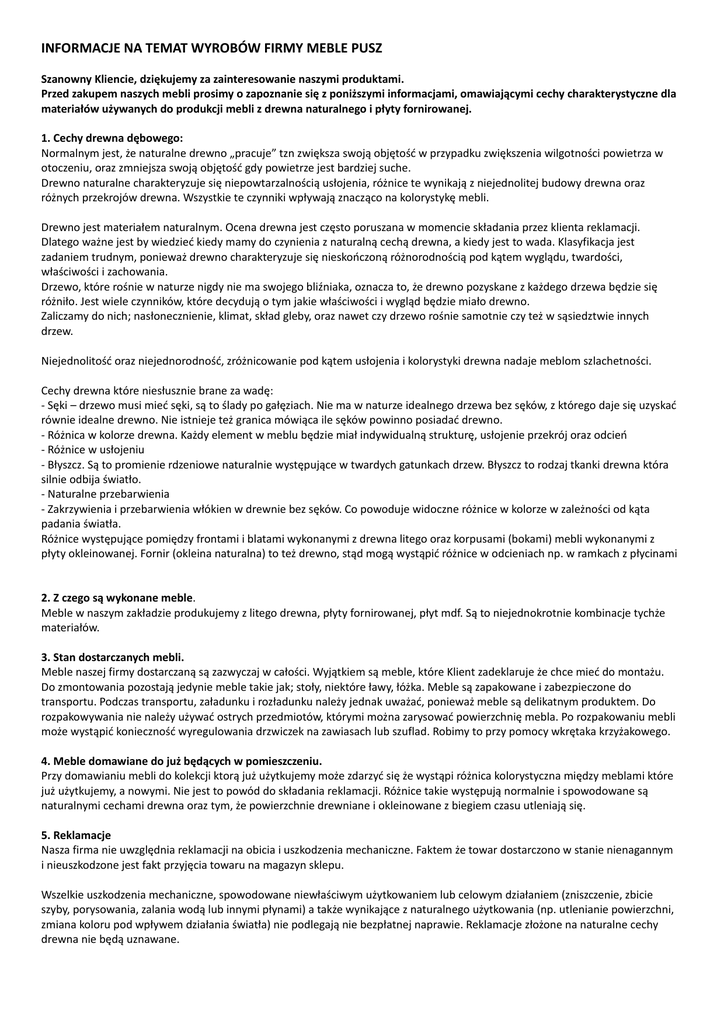 INFORMACJE NA TEMAT WYROBÓW FIRMY MEBLE PUSZ Szanowny Kliencie, dziękujemy za zainteresowanie naszymi produktami. Przed zakupem naszych mebli prosimy o zapoznanie się z poniższymi informacjami, omawiającymi cechy charakterystyczne dla materiałów używanych do produkcji mebli z drewna naturalnego i płyty fornirowanej. 1. Cechy drewna dębowego: Normalnym jest, że naturalne drewno „pracuje” tzn zwiększa swoją objętość w przypadku zwiększenia wilgotności powietrza w otoczeniu, oraz zmniejsza swoją objętość gdy powietrze jest bardziej suche. Drewno naturalne charakteryzuje się niepowtarzalnością usłojenia, różnice te wynikają z niejednolitej budowy drewna oraz różnych przekrojów drewna. Wszystkie te czynniki wpływają znacząco na kolorystykę mebli. Drewno jest materiałem naturalnym. Ocena drewna jest często poruszana w momencie składania przez klienta reklamacji. Dlatego ważne jest by wiedzieć kiedy mamy do czynienia z naturalną cechą drewna, a kiedy jest to wada. Klasyfikacja jest zadaniem trudnym, ponieważ drewno charakteryzuje się nieskończoną różnorodnością pod kątem wyglądu, twardości, właściwości i zachowania. Drzewo, które rośnie w naturze nigdy nie ma swojego bliźniaka, oznacza to, że drewno pozyskane z każdego drzewa będzie się różniło. Jest wiele czynników, które decydują o tym jakie właściwości i wygląd będzie miało drewno. Zaliczamy do nich; nasłonecznienie, klimat, skład gleby, oraz nawet czy drzewo rośnie samotnie czy też w sąsiedztwie innych drzew. Niejednolitość oraz niejednorodność, zróżnicowanie pod kątem usłojenia i kolorystyki drewna nadaje meblom szlachetności. Cechy drewna które niesłusznie brane za wadę: - Sęki – drzewo musi mieć sęki, są to ślady po gałęziach. Nie ma w naturze idealnego drzewa bez sęków, z którego daje się uzyskać równie idealne drewno. Nie istnieje też granica mówiąca ile sęków powinno posiadać drewno. - Różnica w kolorze drewna. Każdy element w meblu będzie miał indywidualną strukturę, usłojenie przekrój oraz odcień - Różnice w usłojeniu - Błyszcz. Są to promienie rdzeniowe naturalnie występujące w twardych gatunkach drzew. Błyszcz to rodzaj tkanki drewna która silnie odbija światło. - Naturalne przebarwienia - Zakrzywienia i przebarwienia włókien w drewnie bez sęków. Co powoduje widoczne różnice w kolorze w zależności od kąta padania światła. Różnice występujące pomiędzy frontami i blatami wykonanymi z drewna litego oraz korpusami (bokami) mebli wykonanymi z płyty okleinowanej. Fornir (okleina naturalna) to też drewno, stąd mogą wystąpić różnice w odcieniach np. w ramkach z płycinami 2. Z czego są wykonane meble. Meble w naszym zakładzie produkujemy z litego drewna, płyty fornirowanej, płyt mdf. Są to niejednokrotnie kombinacje tychże materiałów. 3. Stan dostarczanych mebli. Meble naszej firmy dostarczaną są zazwyczaj w całości. Wyjątkiem są meble, które Klient zadeklaruje że chce mieć do montażu. Do zmontowania pozostają jedynie meble takie jak; stoły, niektóre ławy, łóżka. Meble są zapakowane i zabezpieczone do transportu. Podczas transportu, załadunku i rozładunku należy jednak uważać, ponieważ meble są delikatnym produktem. Do rozpakowywania nie należy używać ostrych przedmiotów, którymi można zarysować powierzchnię mebla. Po rozpakowaniu mebli może wystąpić konieczność wyregulowania drzwiczek na zawiasach lub szuflad. Robimy to przy pomocy wkrętaka krzyżakowego. 4. Meble domawiane do już będących w pomieszczeniu. Przy domawianiu mebli do kolekcji ktorą już użytkujemy może zdarzyć się że wystąpi różnica kolorystyczna między meblami które już użytkujemy, a nowymi. Nie jest to powód do składania reklamacji. Różnice takie występują normalnie i spowodowane są naturalnymi cechami drewna oraz tym, że powierzchnie drewniane i okleinowane z biegiem czasu utleniają się. 5. Reklamacje Nasza firma nie uwzględnia reklamacji na obicia i uszkodzenia mechaniczne. Faktem że towar dostarczono w stanie nienagannym i nieuszkodzone jest fakt przyjęcia towaru na magazyn sklepu. Wszelkie uszkodzenia mechaniczne, spowodowane niewłaściwym użytkowaniem lub celowym działaniem (zniszczenie, zbicie szyby, porysowania, zalania wodą lub innymi płynami) a także wynikające z naturalnego użytkowania (np. utlenianie powierzchni, zmiana koloru pod wpływem działania światła) nie podlegają nie bezpłatnej naprawie. Reklamacje złożone na naturalne cechy drewna nie będą uznawane. NATURALNE CECHY DREWNA