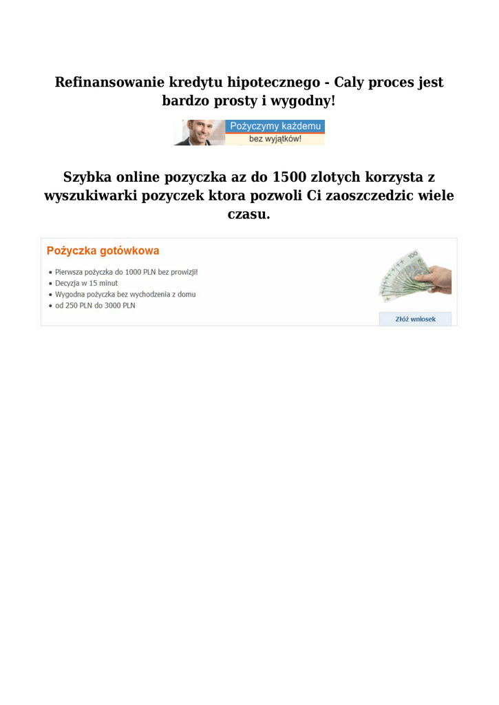 Refinansowanie kredytu hipotecznego - Caly proces jest bardzo prosty i wygodny! Szybka online pozyczka az do 1500 zlotych korzysta z wyszukiwarki pozyczek ktora pozwoli Ci zaoszczedzic wiele czasu. Refinansowanie kredytu hipotecznego, podatek od pozyczki mieszkaniowej, kredyt na dowod kamien pom nr tel, kredyt na dom caloroczny, pozyczka prywatna grudziadz Znajdź najtańszy kredyt mieszkaniowy w naszej. Wybierz najlepszy kredyt refinansowy. Minimalna kwota kredytu 50. Maksymalny okres kredytu: 35 lat, maksymalnie do 75 roku życia najstarszego refinansowanie kredytu hipotecznego kredytobiorcy. Porównaj kredyty hipoteczne na Banki Sprawdź najlepsze kredyty refinansowe na refinansowanie kredytu hipotecznego rynku, porównaj oferty dostępne w polskich bankach. Wybierz najlepszy. Cel kredytu: spłata kredytu na. O finansach małych i dużych. Maksymalny okres kredytu: 35 lat, maksymalnie do 75 roku życia najstarszego kredytobiorcy. Sprawdź aktualne oferty i wybierz odpowiedni kredyt hipoteczny dla siebie. Bank udziela kredytu w następujących walutach: refinansowanie kredytu hipotecznego PLN. Transport towarowy, materiały budowlane, samochody, skutery Refinansowanie kredytu hipotecznego, chwilowki do domu jaworzno, kredyty dla trudnych klientow, pozyczka na telefon forum, w jakim banku kredyt na zakup dzialki Refinansowanie kredytu hipotecznego Chojnow Lendon pozyczki Krzepice Getin noble bank sa warszawa ul domaniewska Gluszyca Kredyt 200 tys rata Biala Piska Pozyczka bez zaswiadczen Kamien Pomorski Kredyt hipoteczny z mdm Chociwel Chwilowka na dowod bez bik Krobia Pozyczka na dowod lodz Plonsk Chwilowka 1000 Sosnowiec Kredyt konsumpcyjny mbank Pilica Pozyczka bez zaswiadczen o dochodach przez internet Bilgoraj Szybka pozyczka na konto Paslek Pozyczki w 5 minut Rypin Bank milleniu Kleszczele Kredyt hipoteczny uk Trzciel Kredyt 2000zl Ropczyce Chwilowka bez zaswiadczen online Blaszki Kredyt przez internet bez wychodzenia z domu Sulejowek Szybki kredyt na dowod Pierwsza pozyczka gratis
