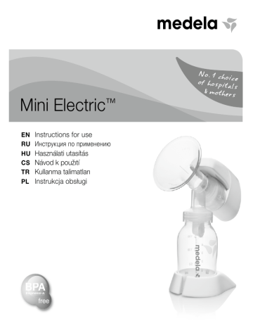 Mini Electric™ BPA Instructions for use EN RU HU CS TR PL Инструкция по применению free Használati utasítás Návod k použıtí Kullanma talimatları Instrukcja obsługi BPA Bisphenol-A isphenol-A free BPA Bisphenol-A isphenol-A free EN RU HU CS TR PL Parts List XIII Список деталей XIII Alkatrészek listája XIII Seznam dílů XIII Parça Listesi XIII Wykaz części zamiennych XIII f j h g a i b c d e EN Instructions for use 4 RU Инструкция по применению 13 HU Használati utasítás 22 CS Návod k použıtí 31 TR Kullanma talimatları 40 PL Instrukcja obsługi 49 EMC 58 EN 3 l Mini ElectricTM Breastpump Mother’s milk is the best nutrition for babies. Mini Electric gives you and your baby optimal support during the breastfeeding period. The attractive small electric breastpump is especially suitable for occasional pumping at home or on the go. ll Indications For Use The Mini Electric Breastpump is a powered breastpump: • To be used by lactating women to express and collect milk from their breast during absences from the baby (e.g. an evening out from baby, working part-time). • To relieve engorgement. • For home use and on the go. lII Important Safeguards When using electrical devices, basic safety precautions should always be followed, including the following: Read all instructions before use. • Use the product only for its intended use as described in this instruction manual. • Only use the mains adapter that comes with the Mini Electric Breastpump. • Make sure the voltage of the mains adapter is compatible with the power source. • Plug the mains adapter into Mini Electric Breastpump first and then into the wall socket. • Always unplug electrical devices immediately after using. • The product should never be left unattended when plugged into a power source. • Separation from the mains is only assured through the disconnection of the mains adapter from the wall socket outlet. • Keep the mains adapter away from heated surfaces. • Never operate an electrical device if it has a damaged cord or plug, if it is notworking properly, if it has been dropped or damaged, or dropped into water. • Do not use outdoors. • Keep appliance dry and do not place in direct sunlight. • Do not get the product wet. • Do not use while bathing or showering. 4 EN • • • • • • • • • • • • • • • Do not place in or drop motor unit into water or other liquid. Do not store or use this product where it can fall or be pulled into a tub or sink. Do not spray or pour liquid directly onto the pump. Do not reach for any electrical device if it has fallen into water. Unplug immediately. Use Medela original accessories only. Check pump kit components for wear or damage. This is a single user product. Use by more than one person may present a health risk and voids the warranty. Pump only with the motor in an upright position. Do not use while sleeping or overly drowsy. Supervision is necessary when this product is used in the vicinity of children. If problems or pain occur, consult your lactation consultant or physician. Equipment not suitable for use in the presence of a flammable anaesthetic mixture with air or with oxygen or nitrous oxide. Portable and mobile radio frequency communications equipment can affect the Mini Electric Breastpump. The Mini Electric Breastpump needs special precautions regarding EMC (Electromagnetic compatibility) and needs to be installed and put into service according to the EMC information provided in these instructions for use. There are no user-serviceable parts inside the Mini Electric. Do not attempt to repair the Mini Electric Breastpump yourself. SAVE THIS INSTRUCTION MANUAL EN 5 lV Assembly Instructions 1 Snap membrane onto valve until membrane lies completely flat. b + c 2 Push assembled valve and membrane onto breastshield. Ensure sidewise position of valve as indicated on picture. + a1 a2 b c 3 Screw bottle into breastshield. + d a b c 4 + a b c d 6 EN i Align the raised edge on the breastshield back with the ridge on the underside of the battery cover and press the motor firmly onto the shield. Lock the motor onto the breastshield by rotating clockwise until the stop. V Operation Electrical operation Insert the metal plug on the end of the mains adapter cord into the hole on the side of the motor unit. Plug the electrical connector on the end of mains adapter cord into power jack (3 V DC). Battery operation To install the batteries, slide off the cover of the battery compartment. Insert the batteries in the correct position as indicated inside the battery compartment and slide on the cover back into place (AA Mignon LR6). The batteries do not need to be removed if the mains adapter is used for pumping. VI Pumping Be comfortably seated and relax. Use a footrest, when pumping or when feeding your baby. Elevating your feet puts you into proper sitting position to avoid stress on the lower back and perineum. 1 Center your breastshield over your nipple. Do not tilt or overfill bottles when pumping. EN 7 VI 2 Pumping Set the vacuum regulator to minimum and switch on the breastpump by pushing the slide switch upwards. Adjust the vacuum to your Maximum Comfort VacuumTM. This is the highest vacuum you can use and still feel comfortable (different for every mother). To find your Maximum Comfort Vacuum increase vacuum until pumping feels slightly uncomfortable (not painful), then decrease slightly. Research has shown that you will pump more efficiently – meaning get more milk in less time – when pumping at Maximum Comfort Vacuum TM . Once finished pumping, switch off the breastpump, unplug it, and disassemble the pump kit items. Close the bottle and store it for later use. Use bottle stand to prevent tip over. VII Breastshield Fitting Choosing the right size of Breastshield A correctly fitted breastshield avoids compression of any milk ducts during pumping to ensure opt