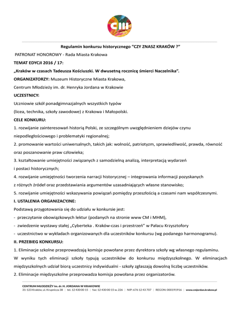 Regulamin konkursu historycznego ”CZY ZNASZ KRAKÓW ?” PATRONAT HONOROWY - Rada Miasta Krakowa TEMAT EDYCJI 2016 / 17: „Kraków w czasach Tadeusza Kościuszki. W dwusetną rocznicę śmierci Naczelnika”. ORGANIZATORZY: Muzeum Historyczne Miasta Krakowa, Centrum Młodzieży im. dr. Henryka Jordana w Krakowie UCZESTNICY: Uczniowie szkół ponadgimnazjalnych wszystkich typów (licea, technika, szkoły zawodowe) z Krakowa i Małopolski. CELE KONKURU: 1. rozwijanie zainteresowań historią Polski, ze szczególnym uwzględnieniem dziejów czynu niepodległościowego i problematyki regionalnej; 2. promowanie wartości uniwersalnych, takich jak: wolność, patriotyzm, sprawiedliwość, prawda, równość oraz poszanowanie praw człowieka; 3. kształtowanie umiejętności związanych z samodzielną analizą, interpretacją wydarzeń i postaci historycznych; 4. rozwijanie umiejętności tworzenia narracji historycznej – integrowania informacji pozyskanych z różnych źródeł oraz przedstawiania argumentów uzasadniających własne stanowisko; 5. rozwijanie umiejętności wskazywania powiązań pomiędzy przeszłością a czasami nam współczesnymi. I. USTALENIA ORGANIZACYJNE: Podstawą przygotowania się do udziału w konkursie jest: - przeczytanie obowiązkowych lektur (podanych na stronie www CM i MHM), - zwiedzenie wystawy stałej „Cyberteka . Kraków-czas i przestrzeń” w Pałacu Krzysztofory - uczestnictwo w wykładach organizowanych dla uczestników konkursu (wg podanego harmonogramu). II. PRZEBIEG KONKURSU: 1. Eliminacje szkolne przeprowadzają komisje powołane przez dyrektora szkoły wg własnego regulaminu. W wyniku tych eliminacji szkoły typują uczestników do konkursu międzyszkolnego. W eliminacjach międzyszkolnych udział biorą uczestnicy indywidualni - szkoły zgłaszają dowolną liczbę uczestników. 2. Eliminacje międzyszkolne przeprowadza komisja powołana przez organizatorów. Eliminacje są pisemne. Każdy z uczestników odpowiada indywidualnie na pytania zawarte w teście. Do finału przechodzi 10 uczestników ma on charakter imprezy publicznej. III. NAGRODY: 1.Dla laureatów I, II i III miejsca przewidziane są nagrody rzeczowe – TABLETY, ufundowane przez Komitet Kopca Kościuszki w Krakowie, nagrody książkowe i dyplomy, dla 7 pozostałych uczestników nagrody książkowe i dyplomy. 2. Poza nagrodami dla zwycięzców konkursu przewidzianych w niniejszym Regulaminie, uczestnik, który uzyskał najlepszy wynik w finale i będzie uczniem klasy maturalnej w roku szkolnym 2017/2018, ma prawo wziąć udział w finale XXII edycji Konkursu Wiedzy o Uniwersytecie Jagiellońskim. Uczestnictwo jest możliwe pod warunkiem zgłoszenia Organizatorowi – Uniwersytetowi Jagiellońskiemu chęci wzięcia udziału w finale i spełnienie wszystkich wymogów Regulaminu XXII edycji Konkursu Wiedzy o Uniwersytecie Jagiellońskim. Nagrodami przewidzianymi dla finalistów są miejsca na studiach stacjonarnych w Uniwersytecie Jagiellońskim (Regulamin XXII edycji Konkursu Wiedzy o Uniwersytecie Jagiellońskim będzie dostępny w roku akademickim 2017/2018 na stronie: www.konkurs.uj.edu.pl ). 3. Dla nauczycieli – opiekunów, których uczniowie przejdą do eliminacji międzyszkolnych przewidziane są karty wolnego wstępu dla 2 osób do wszystkich oddziałów Muzeum Historycznego Miasta Krakowa na rok 2017 oraz książki. III. TERMINARZ KONKURSU: 1. Do 12 stycznia 2017 r. prosimy o przesłanie drogą elektroniczną wstępnej listy uczniów, którzy chcieliby wziąć udział w konkursie (lista może jeszcze ulec zmianie przed eliminacjami). Kartę zgłoszenia uczestników konkursu historycznego „Czy znasz Kraków?” wg załączonego wzoru proszę przesłać na adres: [email protected]. 2. Od 19 stycznia do 11 maja 2017 r. odbędą się wykłady związane z tematem konkursu dostępne dla wszystkich uczestników (miejsce wykładów: Sala Fontany Muzeum Historycznego Miasta Krakowa, Pałac Krzysztofory, Rynek Główny 35, I piętro, godz. 15:00 – 16:00 ). 3. Każdy zgłoszony uczestnik otrzyma na pierwszym wykładzie indeks, w którym będzie zbierał podpisy wykładowców po każdym wykładzie. Udział w wykładach daje możliwość zdobycia dodatkowych punktów (jeden wykład – jeden punkt) - maksymalnie 8 punktów. 4. Eliminacje międzyszkolne odbędą się 15 maja 2017 r. (miejsce i godzina eliminacji zostaną podane w terminie późniejszym). 5. Finał konkursu przewidziany jest na dzień 29 maja 2017 r. o godz. 10:00, w Sali Miedzianej w Pałacu Krzysztofory, Rynek Główny 35. UWAGA! 1. Każdy uczeń, który będzie brał udział w eliminacjach międzyszkolnych, zobowiązany jest do zakupienia karnetu. Cena karnetu wynosi 20 zł. Karnety można nabyć w kasie Centrum Młodzieży (ul. Krupnicza 38), od 12 stycznia 2017 w godz. 14:00 – 17:00. Osoby, które nie wykupią karnetu w kasie, będą mogły go kupić przed eliminacjami - 15 maja 2017 r. 2. Każdy uczestnik konkursu otrzyma możliwość bezpłatnego wejścia na wystawy:„ Cyberteka. Kraków-czas i przestrzeń” oraz „Pokonkursowej wystawy szopek krakowskich” w Pałacu Krzysztofory. 3. Każdy niepełnoletni uczestnik konkursu zobowiązany jest przynieść ze sobą na pierwszy wykład - zgodę rodziców/opiekunów prawnych na udział w konkursie. IV. POSTANOWIENIA KOŃCOWE REGULAMINU. 1.Organizatorzy zastrzegają sobie możliwość zmian w przebiegu i terminarzu konkursu oraz ostatecznej interpretacji regulaminu. 2.Decyzje ogłoszone przez jury w trakcie rozgrywek konkursowych są ostateczne. 3. Uczestnicy eliminacji międzyszkolnych - na podstawie karty zgłoszenia - otrzymają e-maile potwierdzające przyjęcie zgłoszenia oraz przypominające o terminach wykładów, wykaz obowiązkowej literatury oraz informacje o miejscu i godzinie eliminacji. Dodatkowych informacji udziela: Anna Sęk; tel. 12/ 307 14 05 lub 600 884 915, e-mail: [email protected] . Regulamin konkursu, terminarz wykładów, wykaz ob