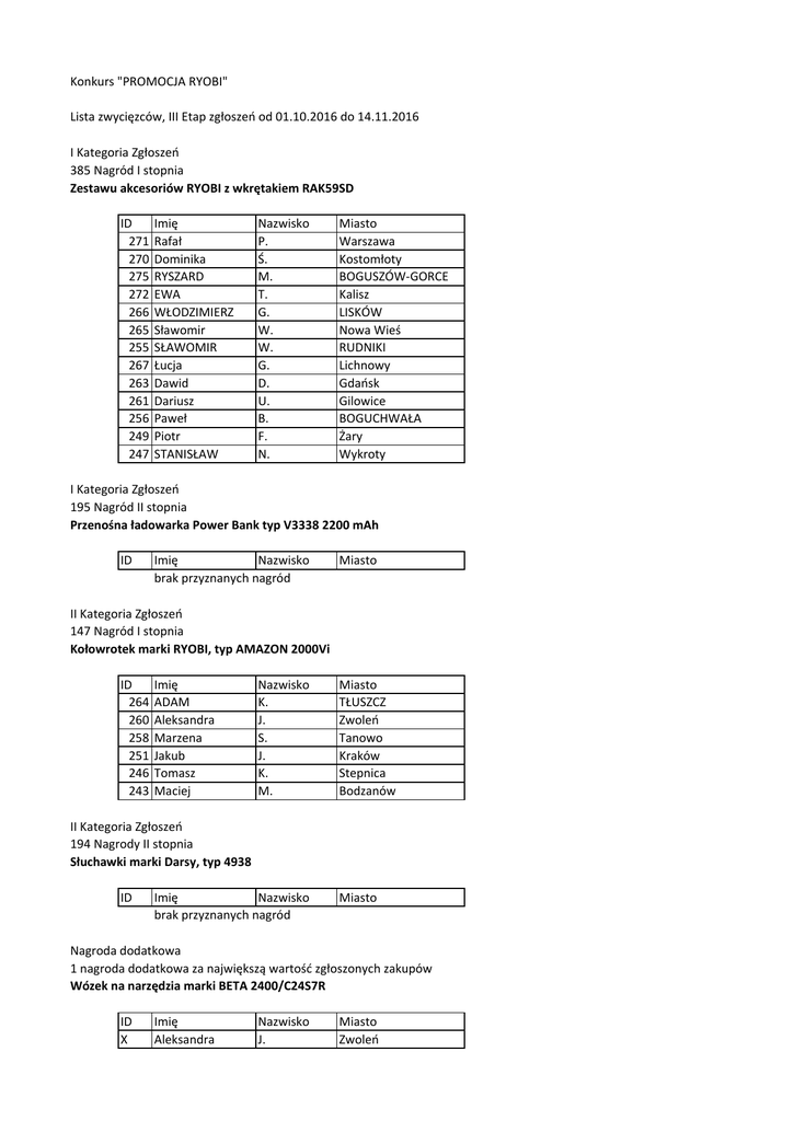 Konkurs "PROMOCJA RYOBI" Lista zwycięzców, III Etap zgłoszeń od 01.10.2016 do 14.11.2016 I Kategoria Zgłoszeń 385 Nagród I stopnia Zestawu akcesoriów RYOBI z wkrętakiem RAK59SD ID 271 270 275 272 266 265 255 267 263 261 256 249 247 Imię Rafał Dominika RYSZARD EWA WŁODZIMIERZ Sławomir SŁAWOMIR Łucja Dawid Dariusz Paweł Piotr STANISŁAW Nazwisko P. Ś. M. T. G. W. W. G. D. U. B. F. N. Miasto Warszawa Kostomłoty BOGUSZÓW-GORCE Kalisz LISKÓW Nowa Wieś RUDNIKI Lichnowy Gdańsk Gilowice BOGUCHWAŁA Żary Wykroty I Kategoria Zgłoszeń 195 Nagród II stopnia Przenośna ładowarka Power Bank typ V3338 2200 mAh ID Imię Nazwisko brak przyznanych nagród Miasto II Kategoria Zgłoszeń 147 Nagród I stopnia Kołowrotek marki RYOBI, typ AMAZON 2000Vi ID 264 260 258 251 246 243 Imię ADAM Aleksandra Marzena Jakub Tomasz Maciej Nazwisko K. J. S. J. K. M. Miasto TŁUSZCZ Zwoleń Tanowo Kraków Stepnica Bodzanów II Kategoria Zgłoszeń 194 Nagrody II stopnia Słuchawki marki Darsy, typ 4938 ID Imię Nazwisko brak przyznanych nagród Miasto Nagroda dodatkowa 1 nagroda dodatkowa za największą wartość zgłoszonych zakupów Wózek na narzędzia marki BETA 2400/C24S7R ID X Imię Aleksandra Nazwisko J. Miasto Zwoleń