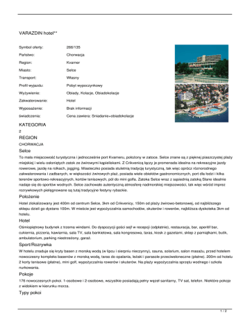 VARAZDIN hotel** Symbol oferty: 266/135 Państwo: Chorwacja Region: Kvarner Miasto: Selce Transport: Własny Profil wyjazdu: Pobyt wypoczynkowy Wyżywienie: Obiady, Kolacje, Obiadokolacje Zakwaterowanie: Hotel Wyposażenie: Brak informacji świadczenia: Cena zawiera: Sniadanie+obiadokolacje KATEGORIA 2 REGION CHORWACJA Selce To mała miejscowość turystyczna i jednocześnie port Kvarneru, położony w zatoce. Selce znane są z pięknej piaszczystej plaży miejskiej i wielu osłoniętych zatok ze żwirowymi kąpieliskami. Z Crikvenicą łączy je promenada idealna na rekreacyjne jazdy rowerowe, jazdę na rolkach, jogging. Miasteczko posiada stuletnią tradycję turystyczną, tak więc oprócz róznorodnego zakwaterowania i zadbanych, w większości żwirowych plaż, posiada wiele obiektów gastronomicznych, port dla łodzi i kilka terenów sportowo-rekreacyjnych, kortów tenisowych, pól do mini golfa. Zatoka Selce wraz z sąsiednią zatoką Slane idealnie nadaje się do sportów wodnych. Selce zachowało autentyczną atmosferę nadmorskiej miejscowości, tak więc wśród imprez rozrywkowych pielęgnowane są tutaj tradycyjne festyny rybackie. Położenie Hotel zlokalizowany jest 400m od centrum Selce, 3km od Crikvenicy, 150m od plaży żwirowo-betonowej, od najbliższego sklepu dzieli go dystans 100m. W mieście jest wypożyczalnia samochodów, skuterów i rowerów, najbliższa dyskoteka 3km od hotelu. Hotel Ośmiopiętrowy budynek z trzema windami. Do dyspozycji gości sejf w recepcji (odpłatnie), restauracja, bar, aperitif bar, cukiernia, pizzeria, kawiarnia, sala TV, sala bankietowa, sala kongresowa, taras, kiosk z gazetami, sklep z pamiątkami, butik, ambulatorium, parking niestrzeżony, garaż. Sport/Rozrywka W hotelu znaduje się kryty basen z morską wodą (w lipcu i sierpniu nieczynny), sauna, solarium, salon masażu, przed hotelem nowoczesny kompleks basenów z morską wodą, taras do opalania, leżaki i parasole przeciwsłoneczne (płatne). 200m od hotelu 2 korty tenisowe (płatne), mini golf, wypożyczalnia rowerów i skuterów. Na plaży wypożyczalnia sprzętu wodnego i szkoła nurkowania. Pokoje 176 nowoczesnych pokoi. 1-osobowe i 2-osobowe, wszystkie posiadają pełny węzeł sanitarny, TV sat, telefon. Niektóre pokoje z widokiem w kierunku morza. Typy pokoi 1/2 DBL pokój dwuosobowy DBA pokój dwuosobowy z widokiem w kierunku morza SGL pokój jednoosobowy Wyżywienie (LIGHT ALL INCLUSIVE) 2 posiłki dziennie, śniadania w formie bufetu, obiadokolacje do wyboru z dwóch zestawów (w terminie 16.06-15.09 w formie bufetu), napoje do obiadokolacji w cenie (woda, wino, piwo, napoje bezalkoholowe). Istnieje możliwość wykupienia pobytu ze śniadaniami (BB). Doba hotelowa Zakwaterowanie w dniu przyjazdu po godzinie 14.00 Wykwaterowanie w dniu wyjazdu do godziny 10.00 CENA OBEJMUJE -zakwaterowanie 7 noclegów -wyżywienie wg oferty -taksę klimatyczną -ubezpieczenie KL, NW, BP, Choroby przewlekłe CENA NIE OBEJMUJE -ubezpieczenia kosztów rezygnacji z imprezy +3% -opieki rezydenta ZNIżKI -dziecko 0-3 lat z dwiema osobami dorosłymi(bez świadczeń, stała cena) 50,00zł/tydzień -dziecko 3-12 lat na dostawce z dwiema osobami dorosłymi -40% -dziecko 12-18 lat na dostawce z dwiema osobami dorosłymi -20% -osoba powyżej 18 lat na dostawce -10% -noclegi ze śniadaniami (BB) -110,00zł/os/tydzień Więcej na www.retman.pl TERMINY: CENNIK: Długość pobytu: dni Grupa cenowa: Waluta: PLN Aktualne ceny z systemu S.A.R.T. (-) - cena usługi, podatku kalkulowana przy osobie lub gratis (*) - kwota wliczona w cenę standardową 2/2