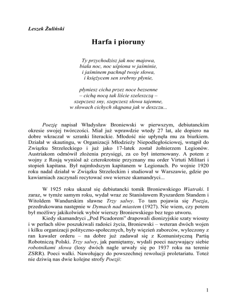 Leszek Żuliński Harfa i pioruny Ty przychodzisz jak noc majowa, biała noc, noc uśpiona w jaśminie, i jaśminem pachnął twoje słowa, i księżycem sen srebrny płynie, płyniesz cicha przez noce bezsenne – cichą nocą tak liście szeleszczą – szepczesz sny, szepczesz słowa tajemne, w słowach cichych skąpana jak w deszczu... Poezję napisał Władysław Broniewski w pierwszym, debiutanckim okresie swojej twórczości. Miał już wprawdzie wtedy 27 lat, ale dopiero na dobre wkraczał w szranki literackie. Młodość nie upłynęła mu za biurkiem. Działał w skautingu, w Organizacji Młodzieży Niepodległościowej, wstąpił do Związku Strzeleckiego i już jako 17-latek został żołnierzem Legionów. Austriakom odmówił złożenia przysięgi, za co był internowany. A potem z wojny z Rosją wyniósł aż czterokrotnie przyznany mu order Virtuti Militari i stopień kapitana. Był najmłodszym kapitanem w Legionach. Po wojnie 1920 roku nadal działał w Związku Strzeleckim i studiował w Warszawie, gdzie po kawiarniach zaczynali recytować swe wiersze skamandryci... W 1925 roku ukazał się debiutancki tomik Broniewskiego Wiatraki. I zaraz, w tymże samym roku, wydał wraz ze Stanisławem Ryszardem Standem i Witoldem Wandurskim sławne Trzy salwy. To tam pojawia się Poezja, przedrukowana następnie w Dymach nad miastem (1927). Nie wiem, czy potem był możliwy jakikolwiek wybór wierszy Broniewskiego bez tego utworu. Kiedy skamandryci „Pod Picadorem” drapowali dionizyjskie szaty wiosny i w perłach słów poszukiwali radości życia, Broniewski – weteran dwóch wojen i kilku organizacji polityczno-społecznych, były więzień zaborców, wyleczony z ran kawaler orderu – na dobre już zadawał się z Komunistyczną Partią Robotniczą Polski. Trzy salwy, jak pamiętamy, wydali poeci nazywający siebie robotnikami słowa (losy dwóch nagle urwały się po 1937 roku na terenie ZSRR). Poeci walki. Nawołujący do powszechnej rewolucji proletariatu. Toteż nie dziwią nas dwie kolejne strofy Poezji: 1 To za mało! Za mało! Za mało! Twoje słowa tumanią i kłamią! Piersiom żywym daj oddech zapału, wiew szeroki i skrzydła do ramion! Nam te słowa ciche nie starczą. Marne słowa. I błahe. I zimne. Ty masz werbel nam zagrać do marszu! Smagać słowem! Bić pieśnią! Wznieść Hymnem! Zauważmy, jak gwałtownie (w 8 wersach aż 9 wykrzykników!) zgoda na poetycki liryzm z dwóch pierwszych strof zostaje – w dwóch następnych – podana w wątpliwość. Noc majowa przechodzi w październikową wichurę. I wichura ta nieustannie w kolejnych tomach poety, w Komunie Paryskiej (1929), Trosce i pieśni (1932), Krzyku ostatecznym (1938)... Pojawiły się po latach pytania, skąd wzięła się u Broniewskiego aż tak radykalna lewicowość? Można by to skwitować odpowiedzią najprostszą: ze zdroworozsądkowej obserwacji rzeczywistości lat 20. i 30. naszego wieku. Ale przecież pochodziły ze szlachty. Po mieczu miał w rodzinie galerię powstańców listopadowych, po kądzieli – powstańców styczniowych. Wychował się w atmosferze lewicujących piłsudczyków. Czytał żarliwe wiersze Mieczysława Romanowskiego i Syzyfowe prace. W Polsce zresztą tradycje rewolucyjne – o czym często zapominamy – były tradycjami szlacheckimi. Rewolucjonizm szlachecki z początków XIX wieku przetrwał na dobrą sprawę do początków XX wieku. A z jakich to rodów wywodzili się wielcy poeci rewolucyjni, tacy jak np. Ehrenberg, Sieroszewski, Czerwiński? I wielcy działacze proletariaccy, jak np. Waryński? I nawet niektórzy bolszewicy, jak np. Dzierżyński? Jednym słowem, wybór ideologii nie oznaczał w przypadku Broniewskiego deklasacji. Mało tego! A któż to napisał sławny wiersz Wyjdzie stu robotników? Któż równoważył etyczne racje arystokraty Henryka i plebejusza Pankracego? Tak, tak, korzenie Broniewskiego w linii prostej wiodą od romantyzmu polskiego. Jest gdzieś radość ludzka, zwyczajna, jest gdzieś jasne i piękne życie. Powszedniego chleba słów nam daj i stań przy nas, i rozkaż-bić się! Niepotrzebne nam białe westalki, noc nie zdławi świętego ognia2 bądź jak sztandar rozwiany wśród walki, bądź jak w wichrze wzniesiona pochodnia. W gruncie rzeczy ten rodzaj idei, te słowa, ta skala zapału pobrzmiewają echem Ody do młodości. To jest ten sam rdzeń przeżycia artystycznego. Broniewski był klasycznym spadkobiercą romantyków. Już na poziomie słowa, metafory, nastroju – aż po sam model buntu. Co ciekawe: on pierwszy w tak charakterystyczny sposób splótł dwa silne, charakterystycznie polskie toposy: romantyczny i mazowiecki. To była po chopinowsku genialna mieszanka, w każdym razie bardzo wyraziście wpisująca się w narodową tradycję, archetypy, etos. Poematy Mazowsze i Wisła mają wprawdzie swoje słabsze partie, ale są to ewidentnymi przykładami, i to napisanymi po latach lirycznej służby (w 1951 i 1953 roku). Kiedy w 30 lat po śmierci Broniewski nagle stał się poetą niewygodnym, kiedy bardziej pamiętano mu Słowo o Stalinie niż inne fakty, kiedy niewiadomym się stało, co zrobić z jego odsiadką we lwowskim więzieniu czy służbą u Andersa – wtedy zapomniano także chętnie, że przedwojenna lewicowość poety nie była chlebem łatwym. Nie chcę powtarzać banałów i przypominać, że tacy jak on trafili do Berezy. Wybór programu ideowego oznaczał ryzyko i poświęcenie, wymagał odwagi: Odmień, odmień nam słowa na wargach, naucz śpiewać płomienniej i prościej, niech nos miłość ogromną potarga, więcej bólu i więcej radości! Jeśli w piersi potrzebna ci harfa jeśli harfa ma zakląć pioruny, rozkaż żyły na struny rozszarpać i naciągnąć, i trącać jak struny. Z taką żarliwością przemawiał wcześniej tylko Konrad; z takim płomieniem tylko Kordian przekraczał próg carskiej komnaty. Kamienie na szaniec! I prekursorska wizja życiopisania. Pisania własną krw
